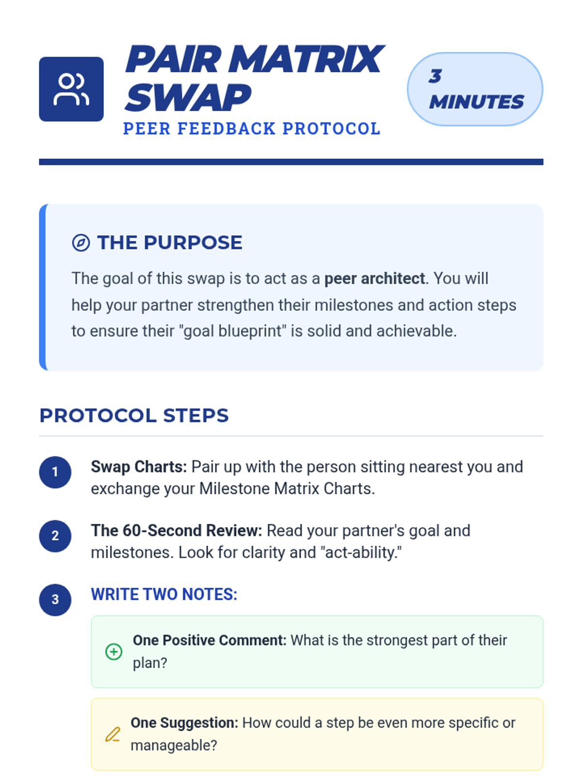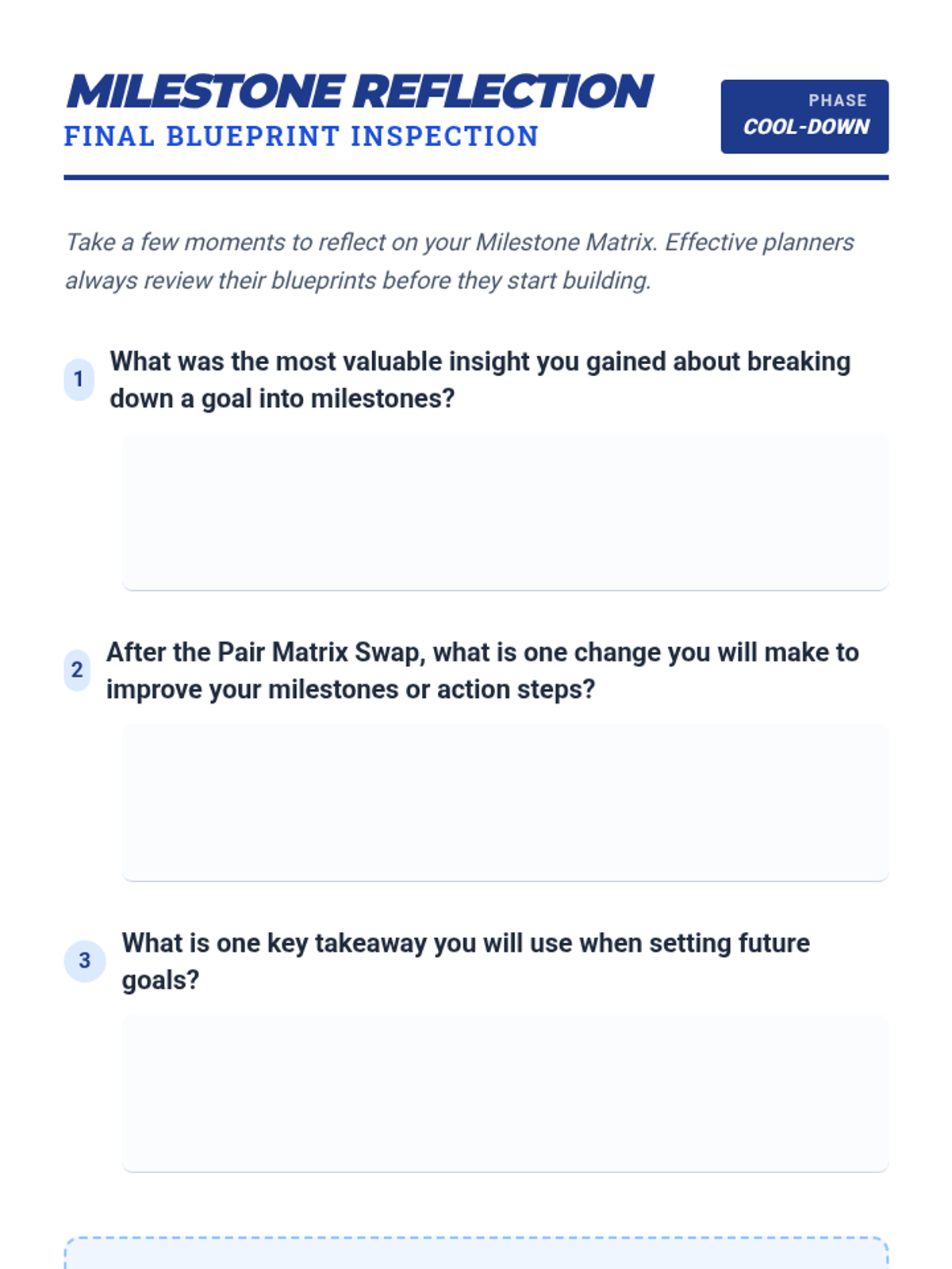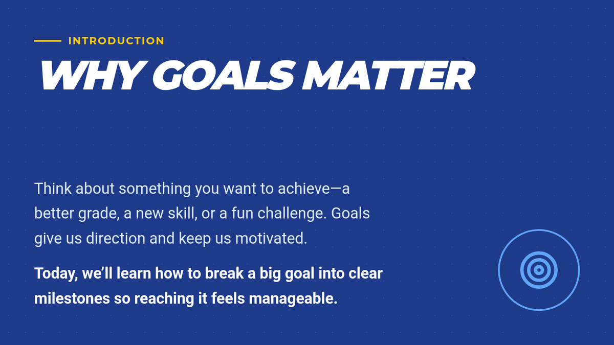 This 15-minute lesson equips 8th graders with goal-setting skills by teaching them how to break large objectives into short-, mid-, and long-term milestones. Students create a structured matrix and receive peer feedback to ensure their action steps are clear and achievable.