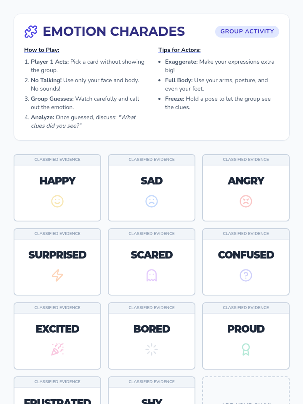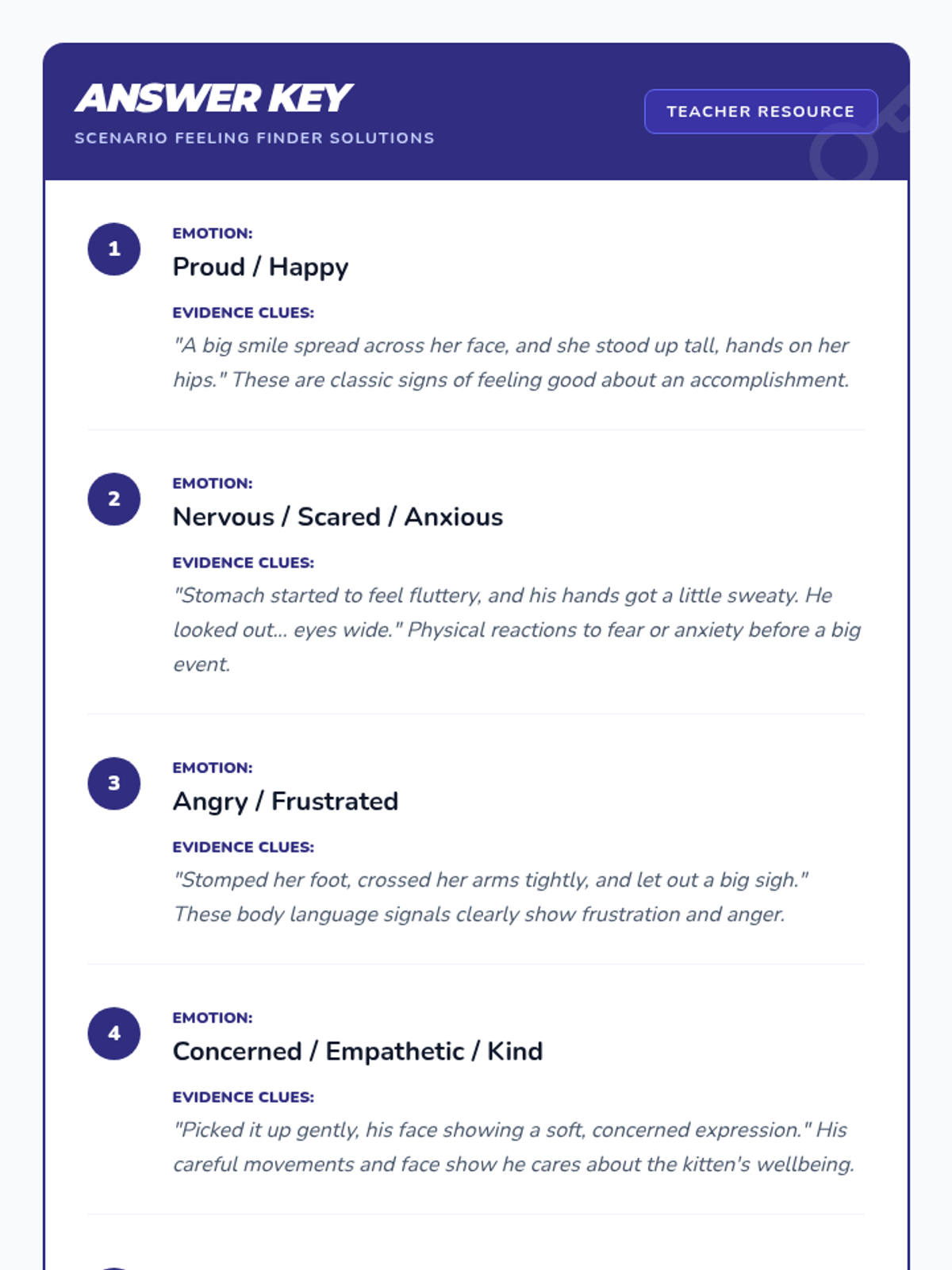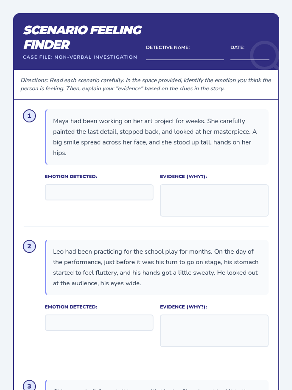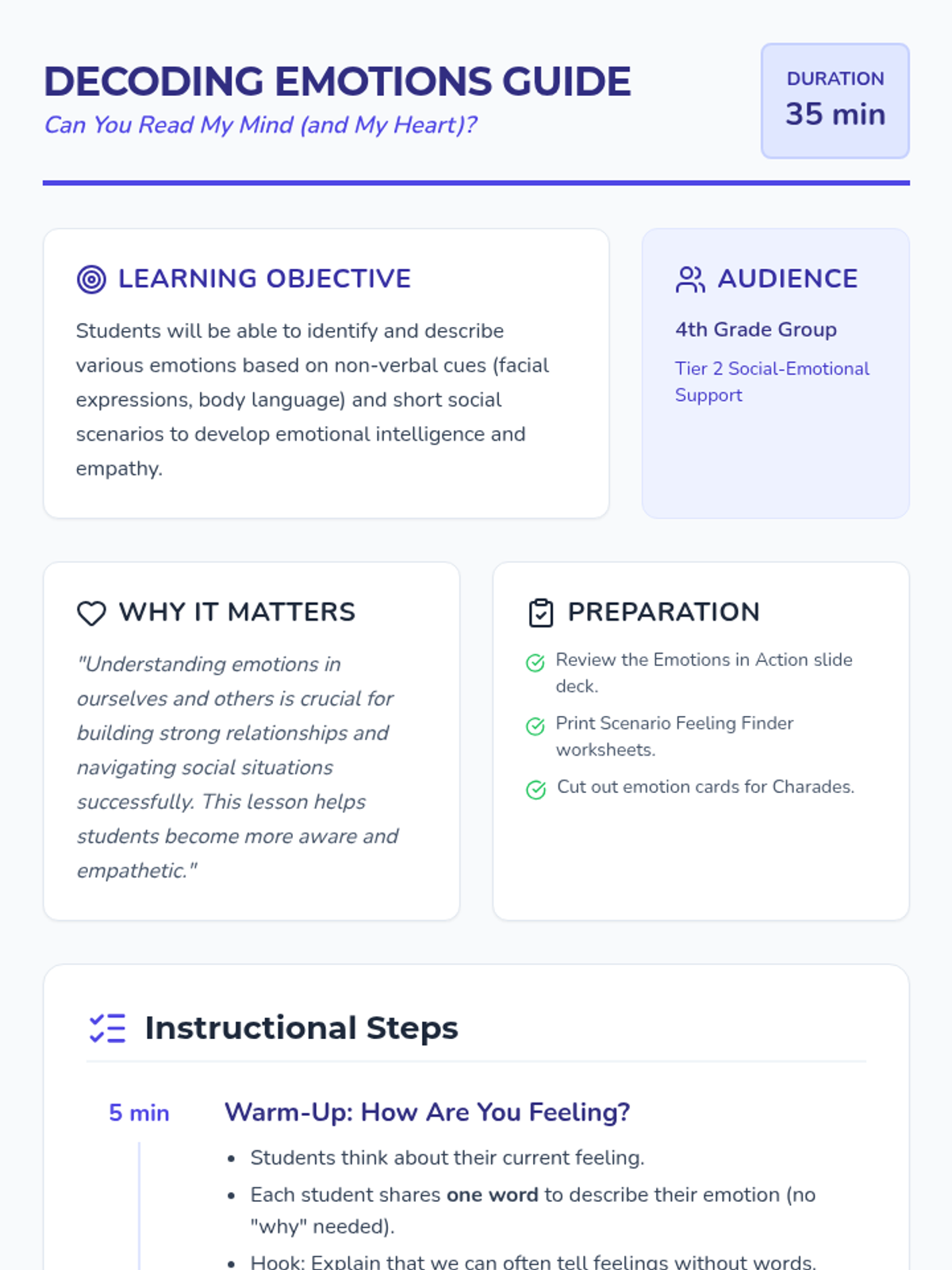 This lesson helps 4th-grade students develop emotional intelligence by identifying non-verbal cues and analyzing social scenarios. Through interactive slides, a charades game, and a detective-themed worksheet, students learn to recognize emotions in others and build empathy.