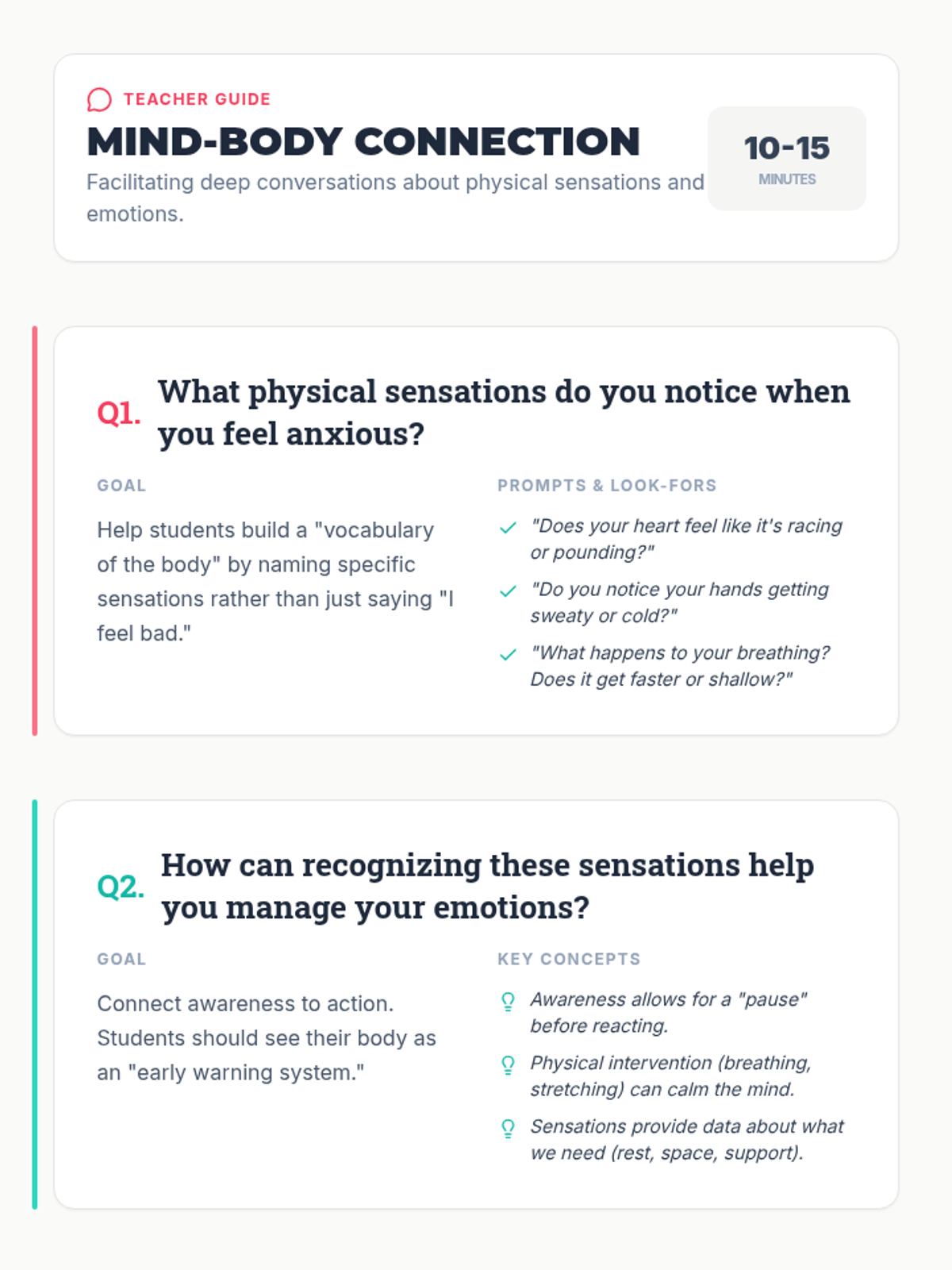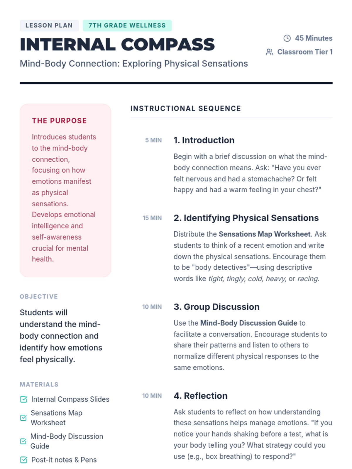 This lesson introduces 7th-grade students to the mind-body connection, focusing on how emotions manifest as physical sensations to foster self-awareness and emotional intelligence.