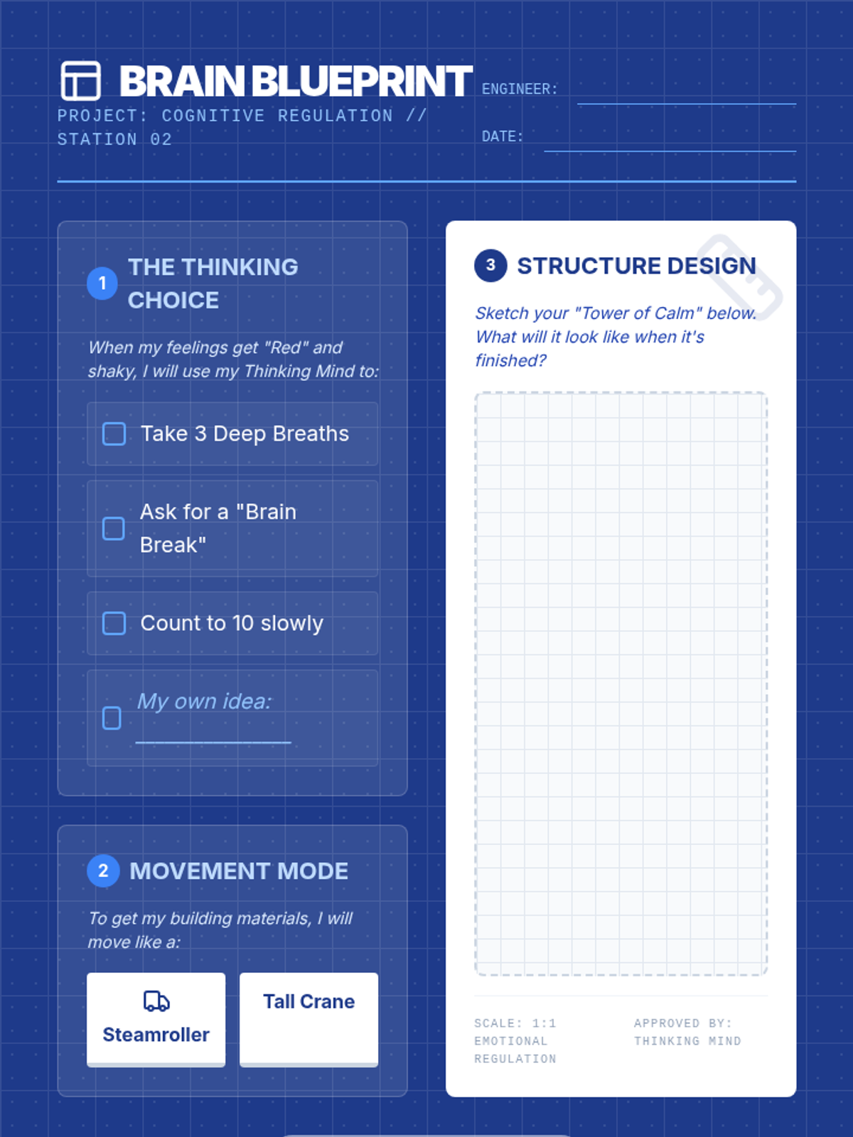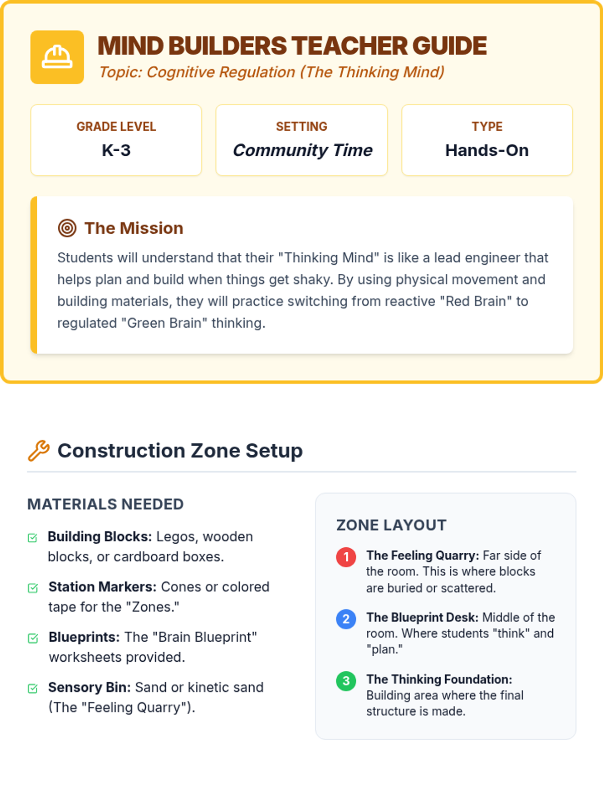 A high-energy, hands-on lesson for K-3 students focusing on cognitive regulation (the 'Thinking Mind') through a construction-themed building activity. Students learn to use their thinking mind to 'engineer' solutions to big feelings using movement and building blocks.