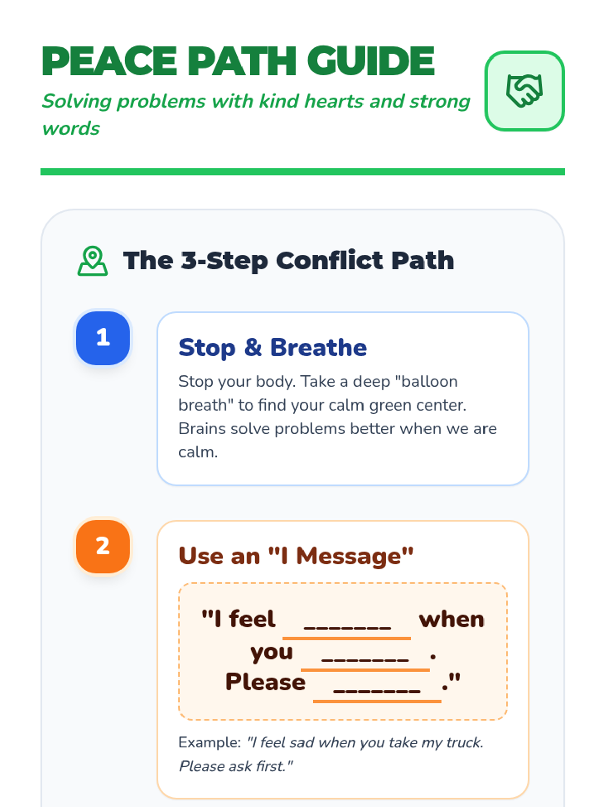 Students will learn the 'Peace Path' steps to resolve conflicts, specifically focusing on sharing and using 'I messages' to communicate feelings.
