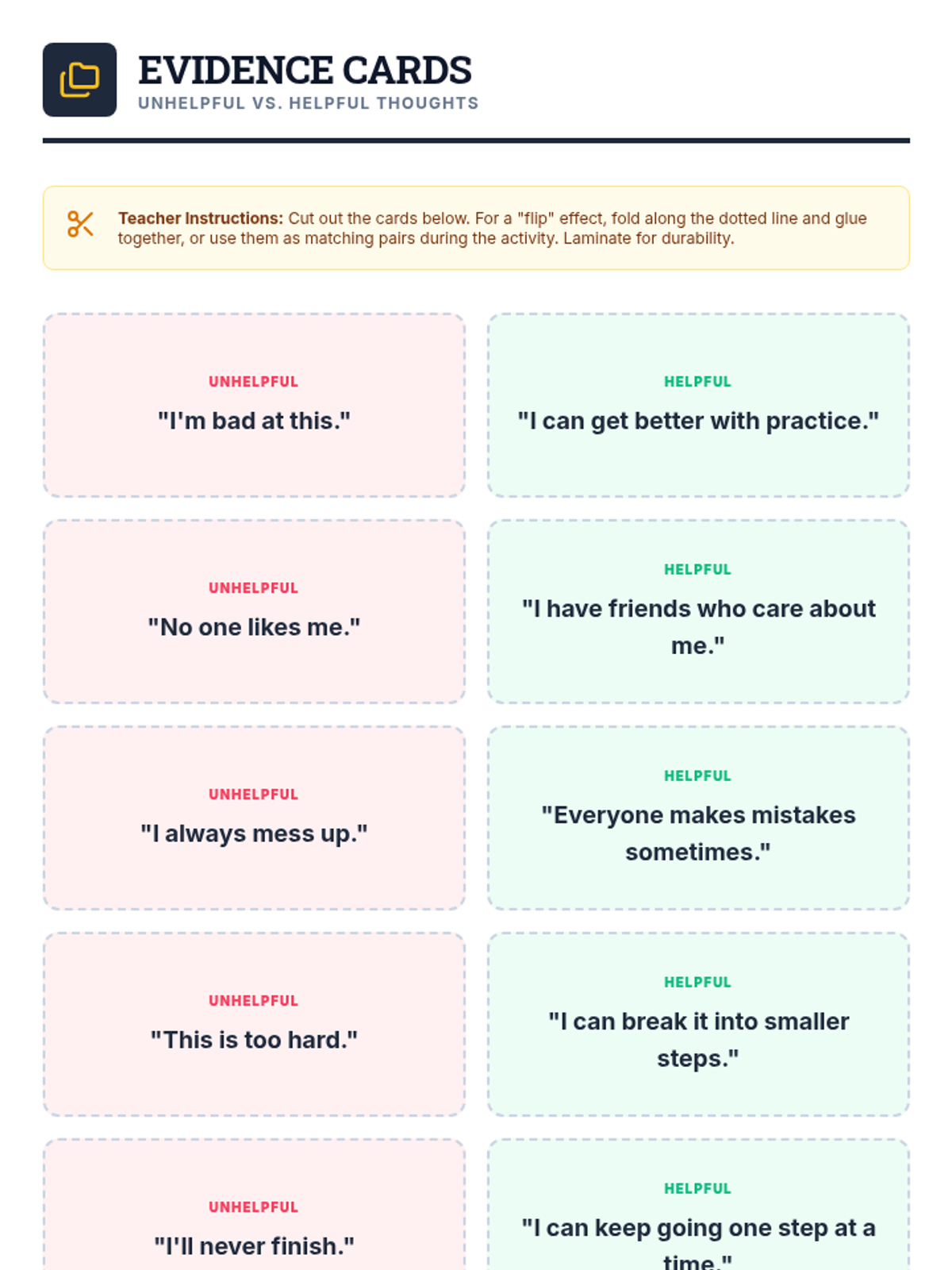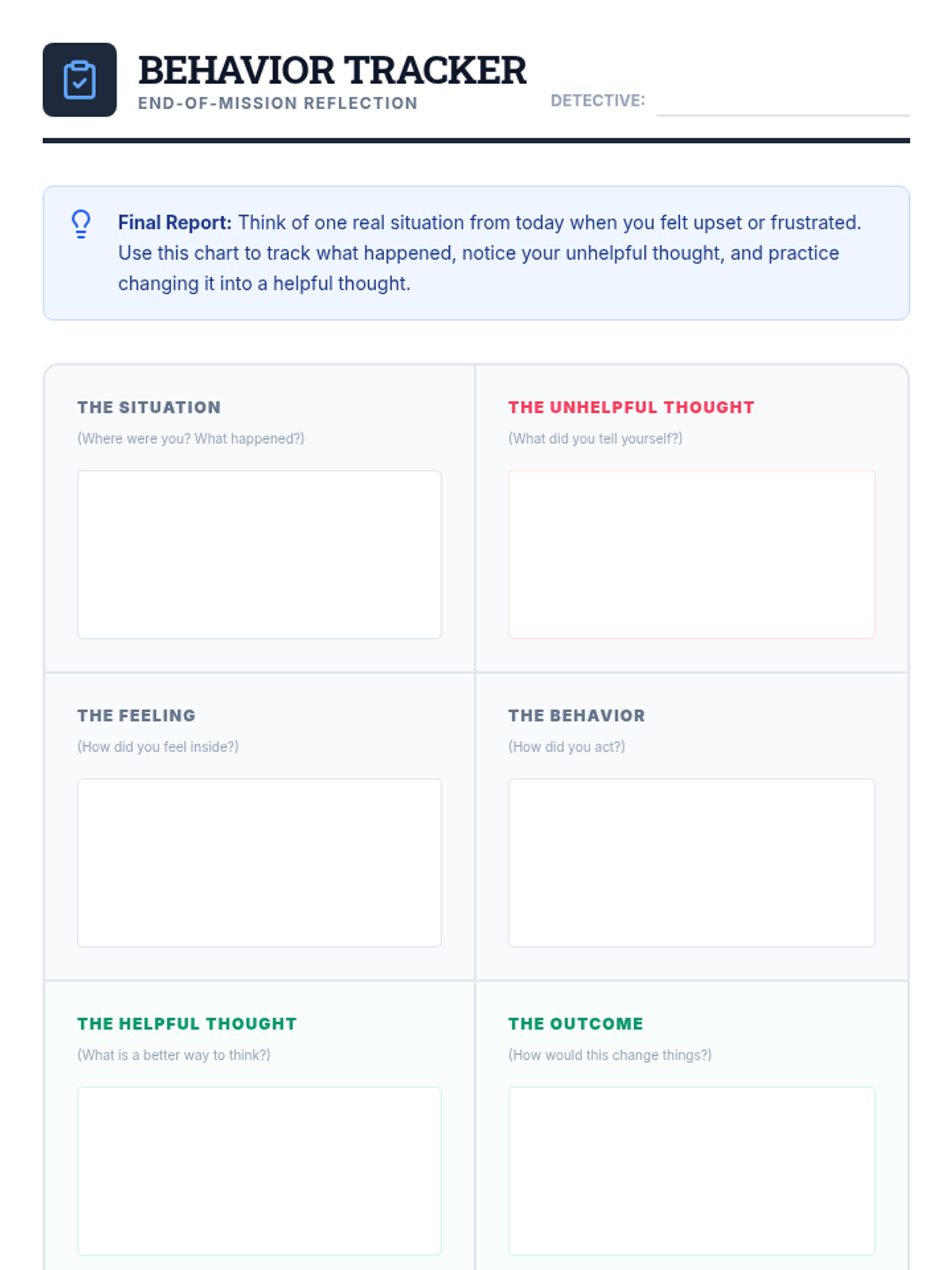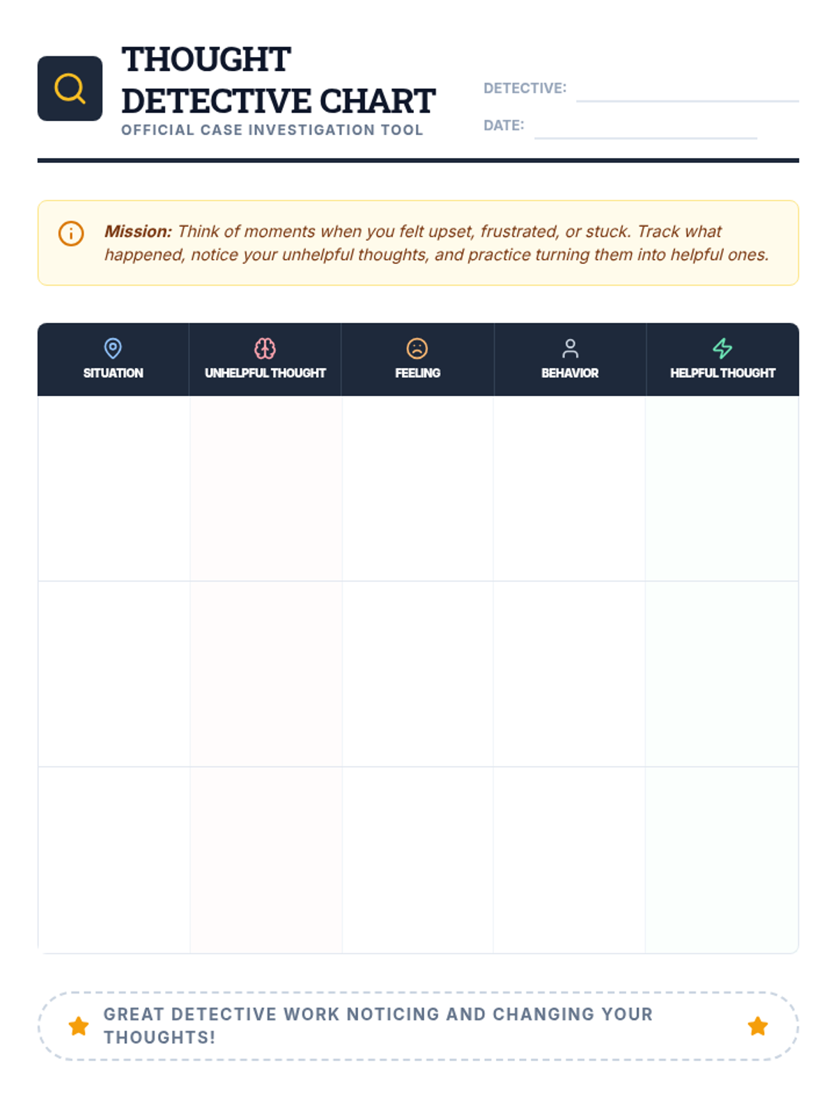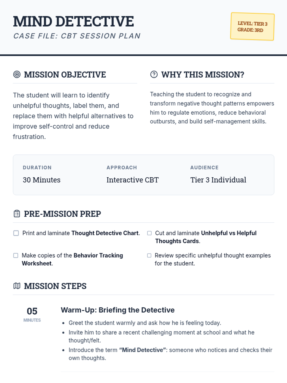 A 30-minute individual Tier 3 CBT session for a 3rd-grade student with autism to learn how to identify, label, and transform unhelpful thoughts into helpful ones.