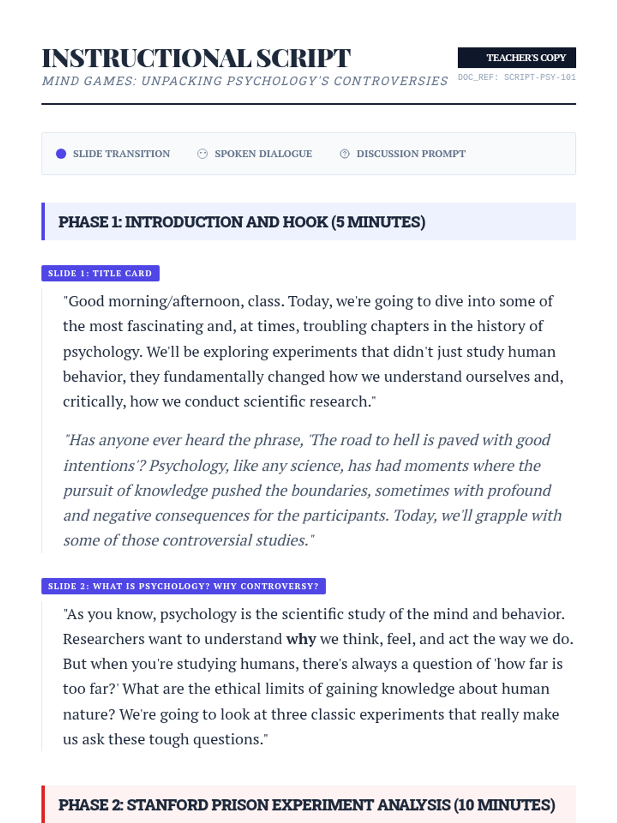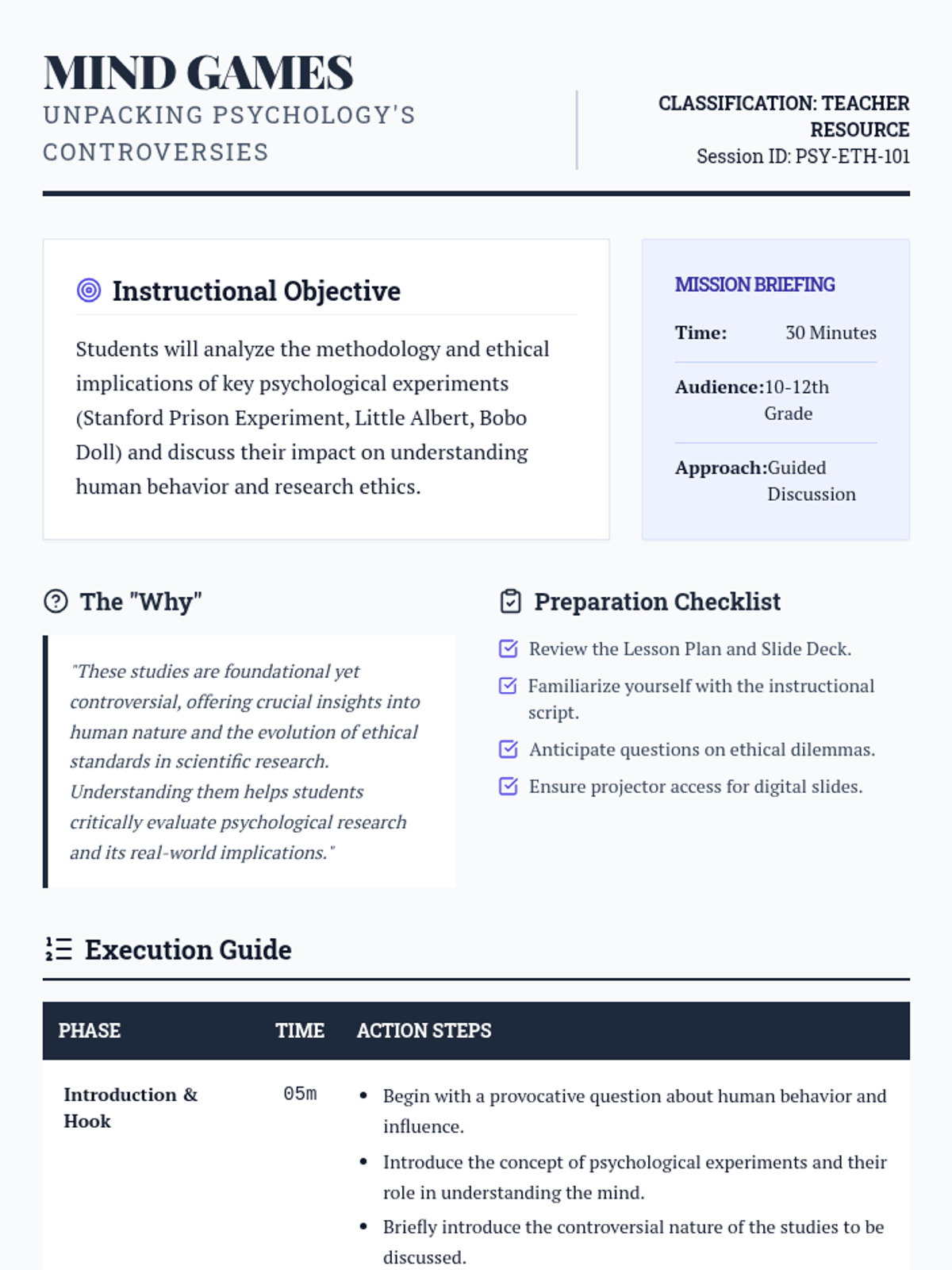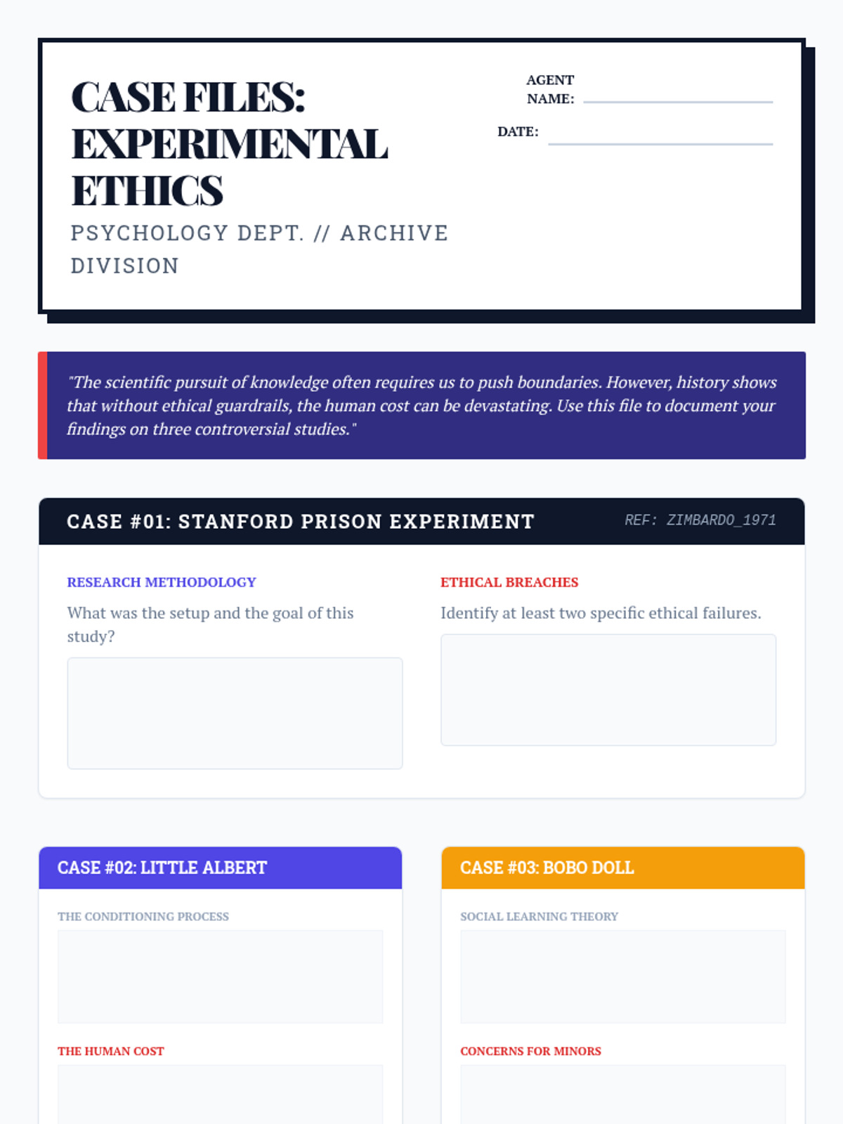 A high school social science lesson exploring the ethical complexities and foundational impact of the Stanford Prison Experiment, Little Albert, and Bobo Doll studies. Students analyze the tension between scientific discovery and human rights while learning about modern ethical standards like informed consent and IRBs.