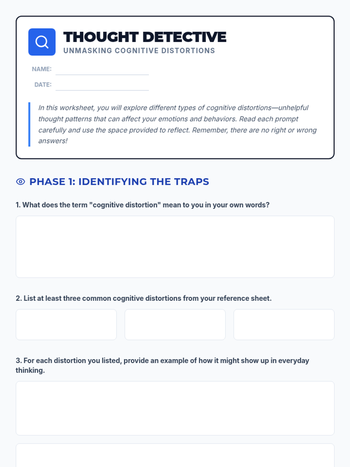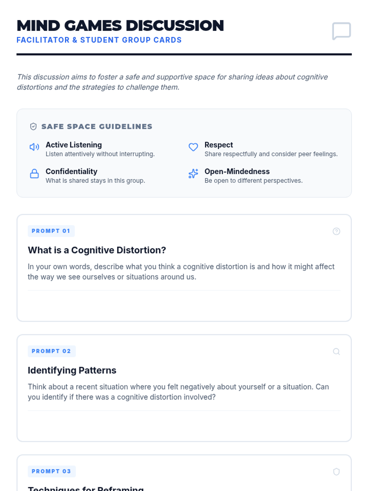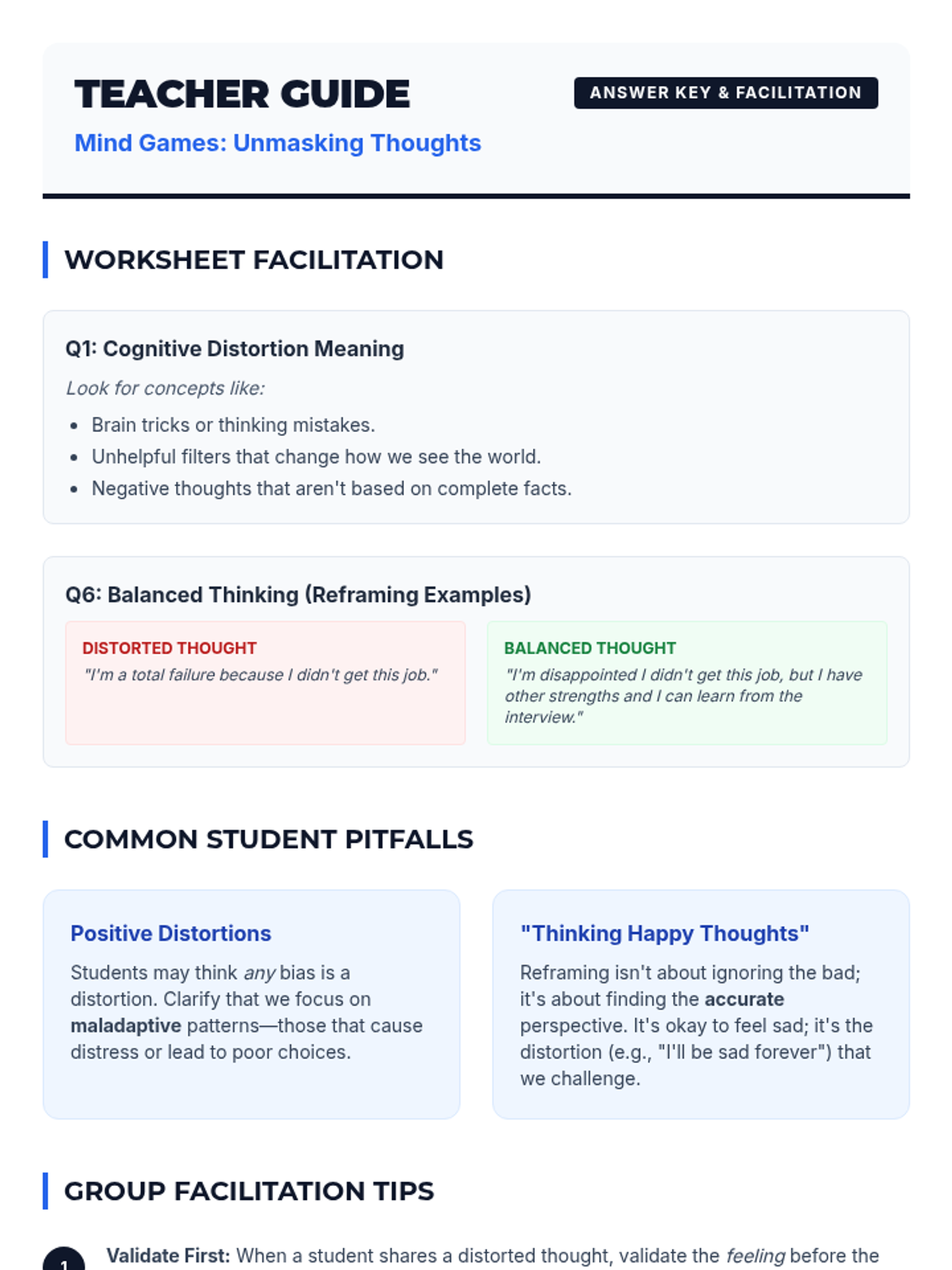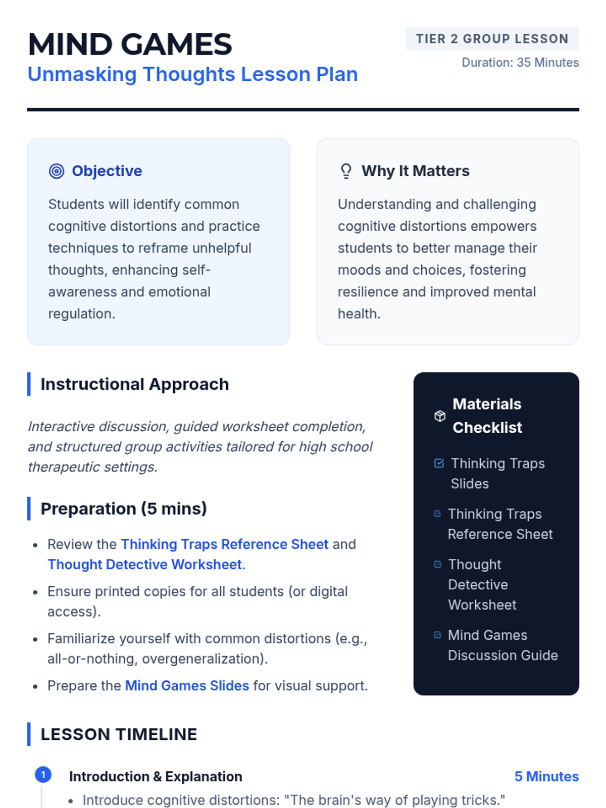A 35-minute Tier 2 therapeutic group lesson for high schoolers to identify and reframe cognitive distortions. Students will learn to 'unmask' unhelpful thinking patterns to improve emotional regulation and decision-making.