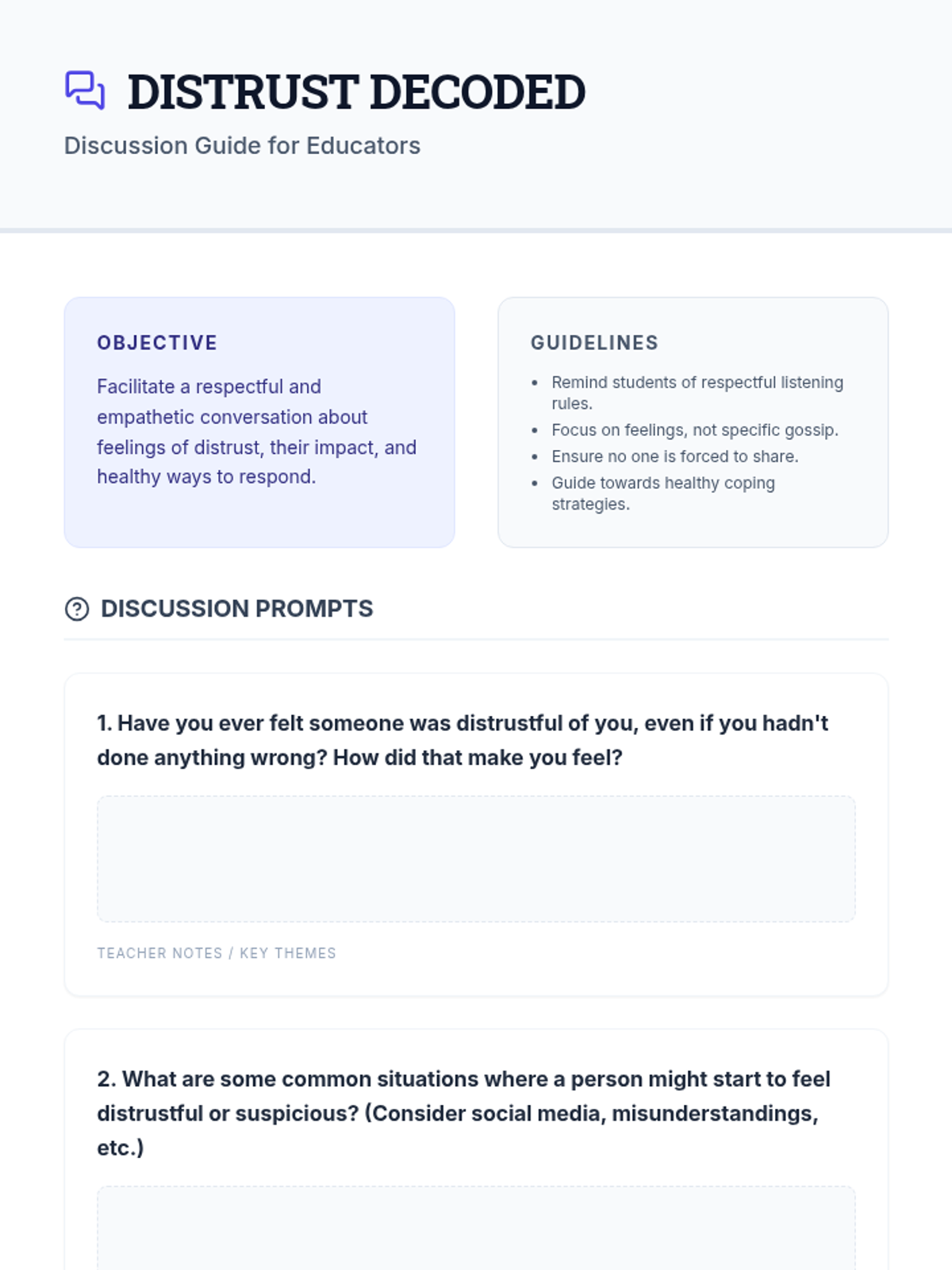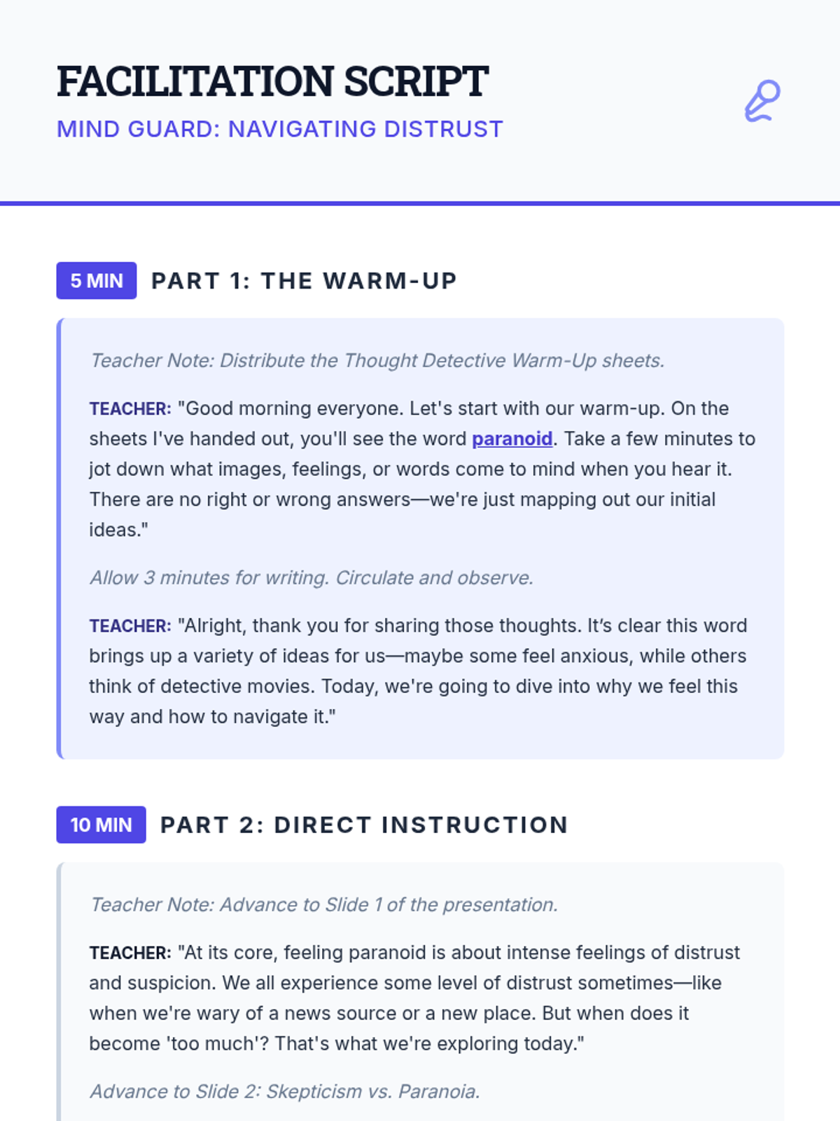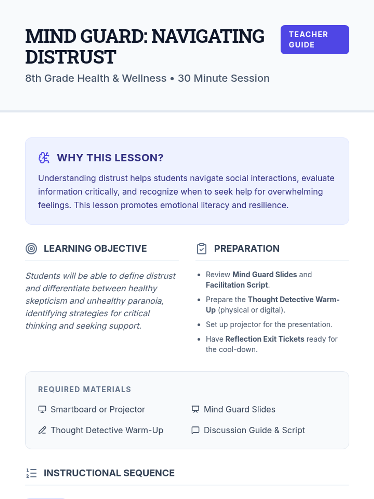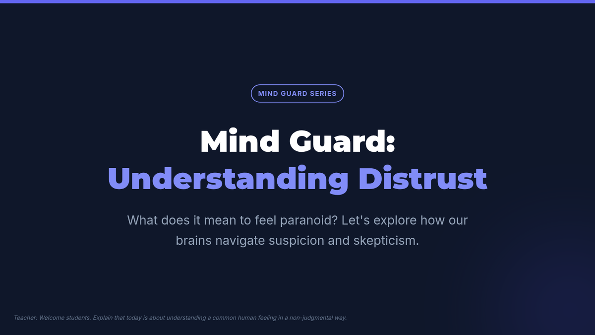 This lesson helps 8th-grade students understand the concept of distrust and paranoia in a healthy context, promoting empathy and self-awareness. It explores how our brains interpret situations and the importance of critical thinking through a 30-minute interactive session.