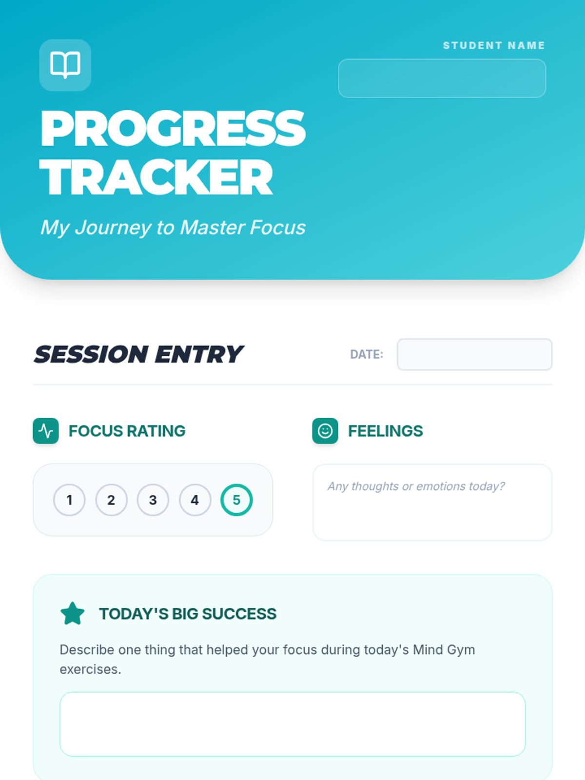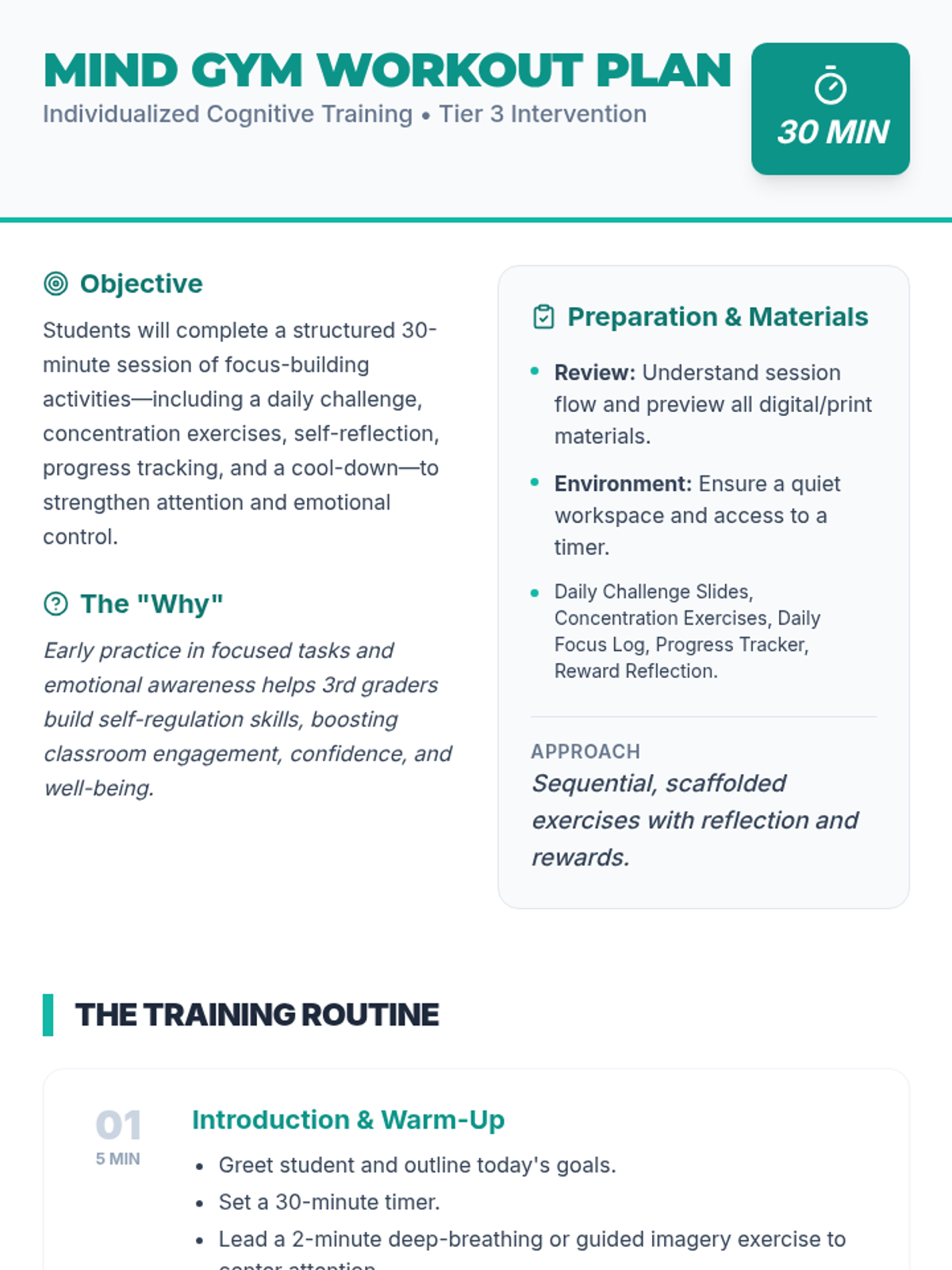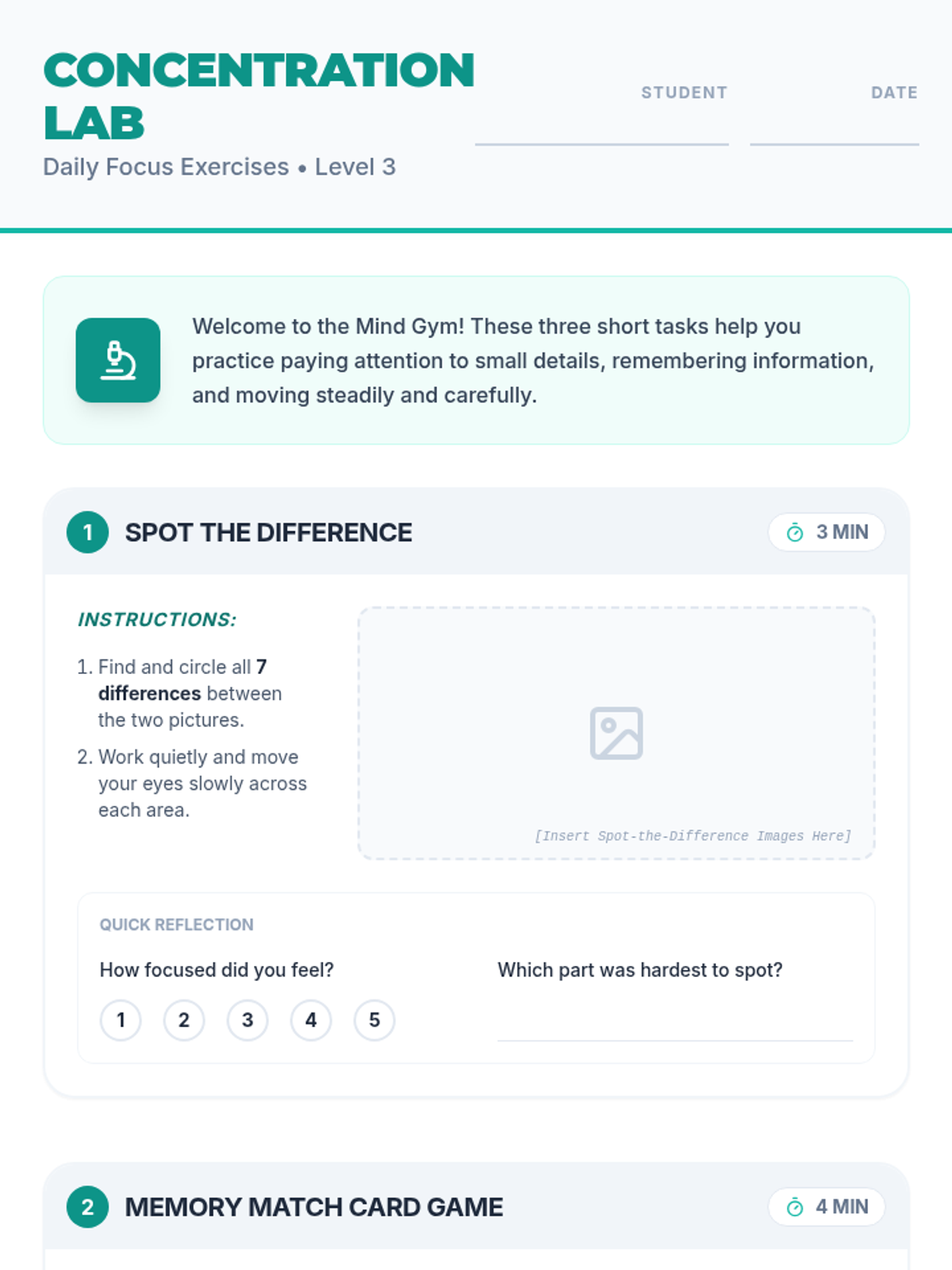 A 30-minute, individualized cognitive exercise regimen designed to help a 3rd grade student strengthen focus and emotional control through daily challenges, concentration tasks, and self-reflection.