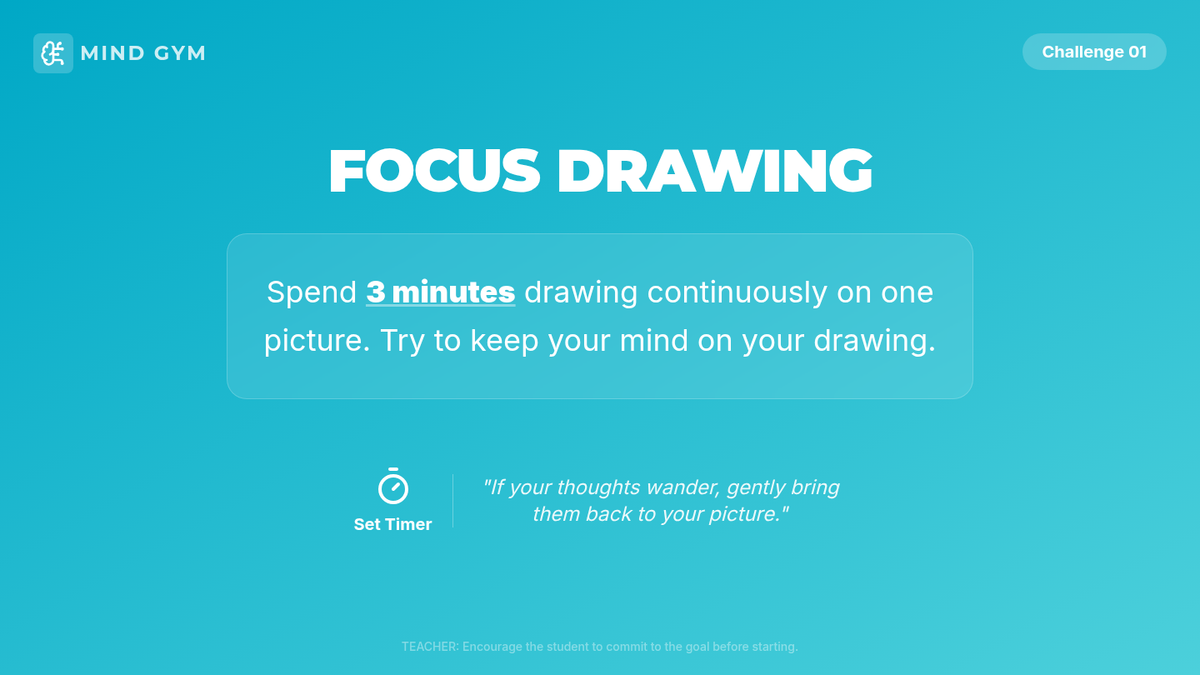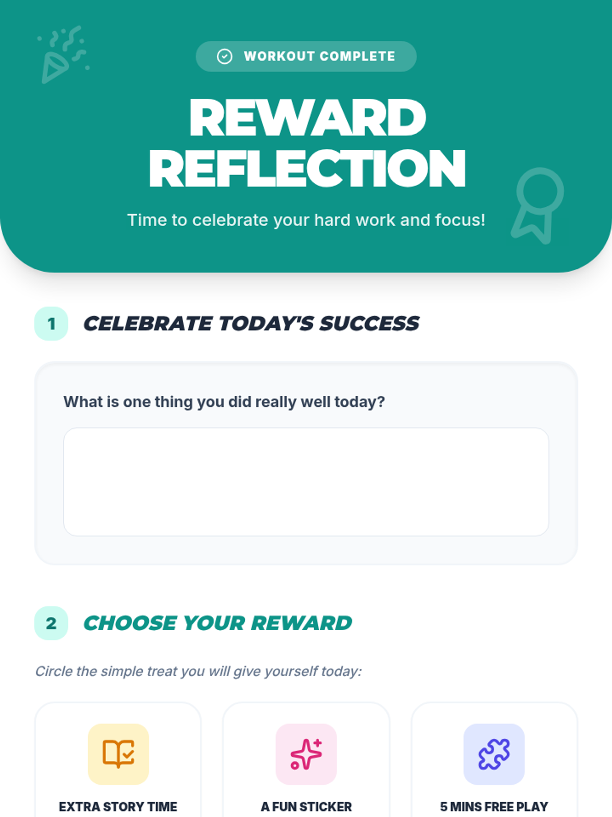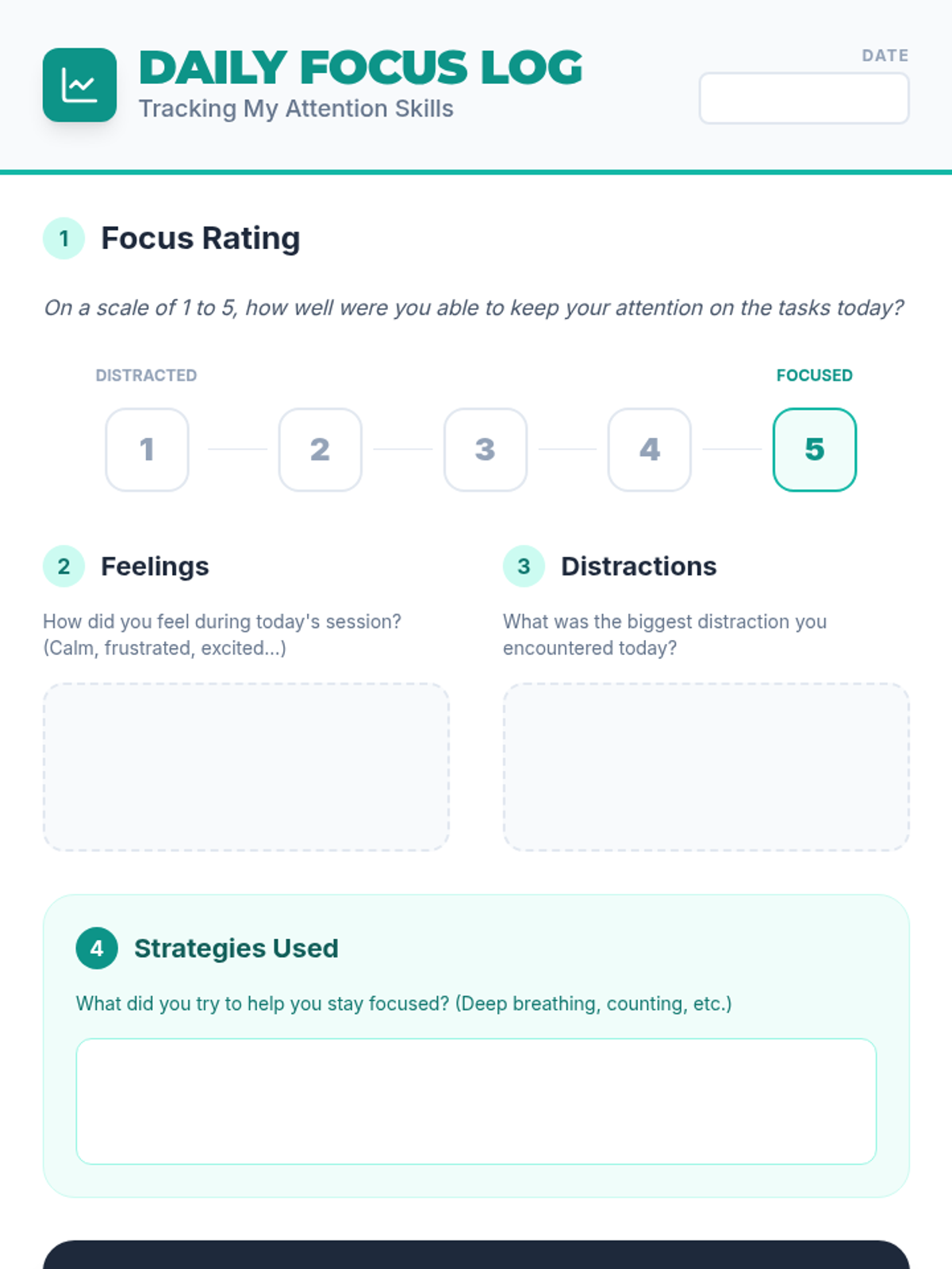 A 30-minute, individualized cognitive exercise regimen designed to help a 3rd grade student strengthen focus and emotional control through daily challenges, concentration tasks, and self-reflection.