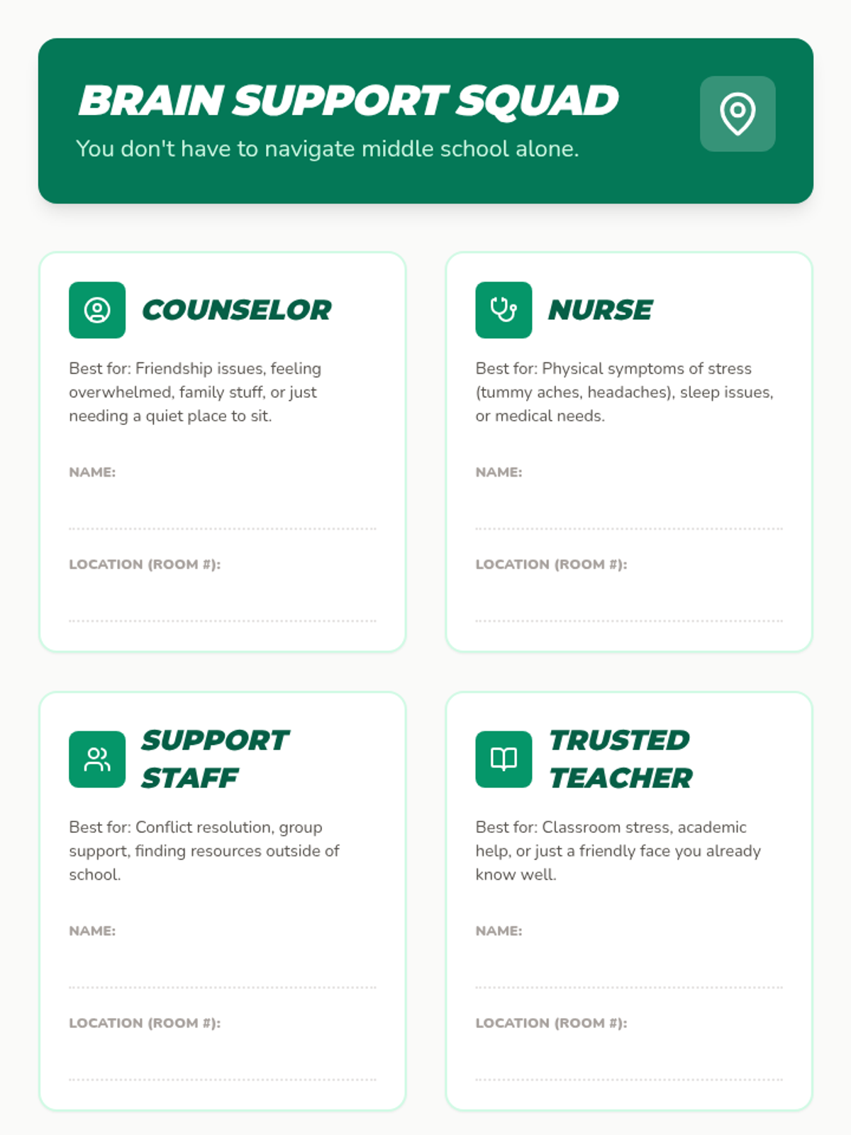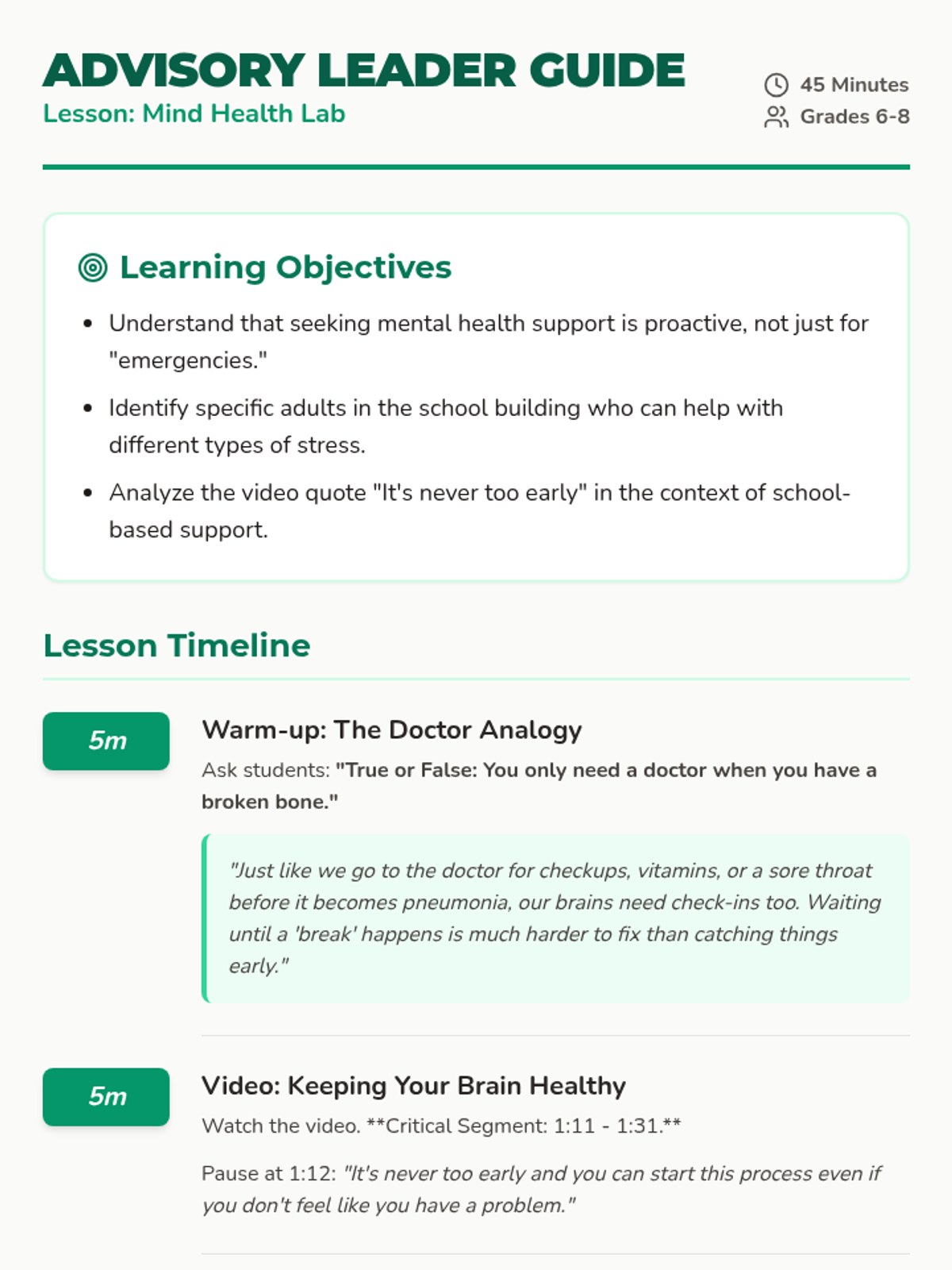 A Middle School Advisory lesson focused on destigmatizing mental health support. Students explore the 'Brain Health' analogy, watch a video on proactive care, and map out specific school resources available to them.