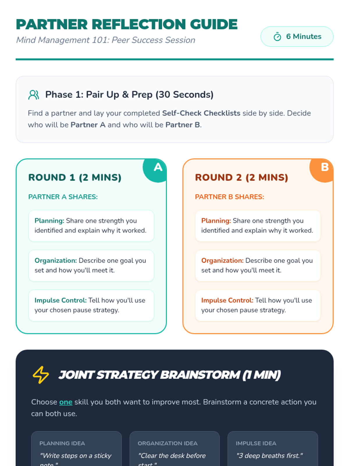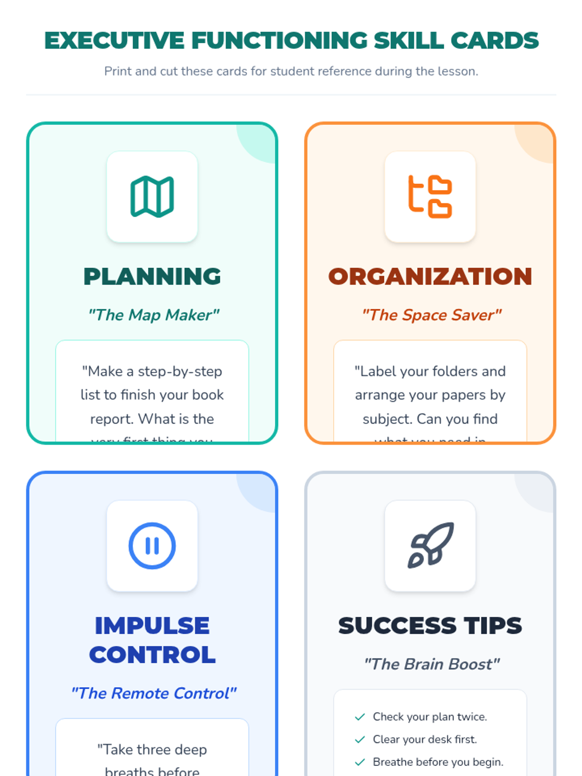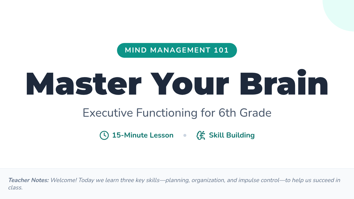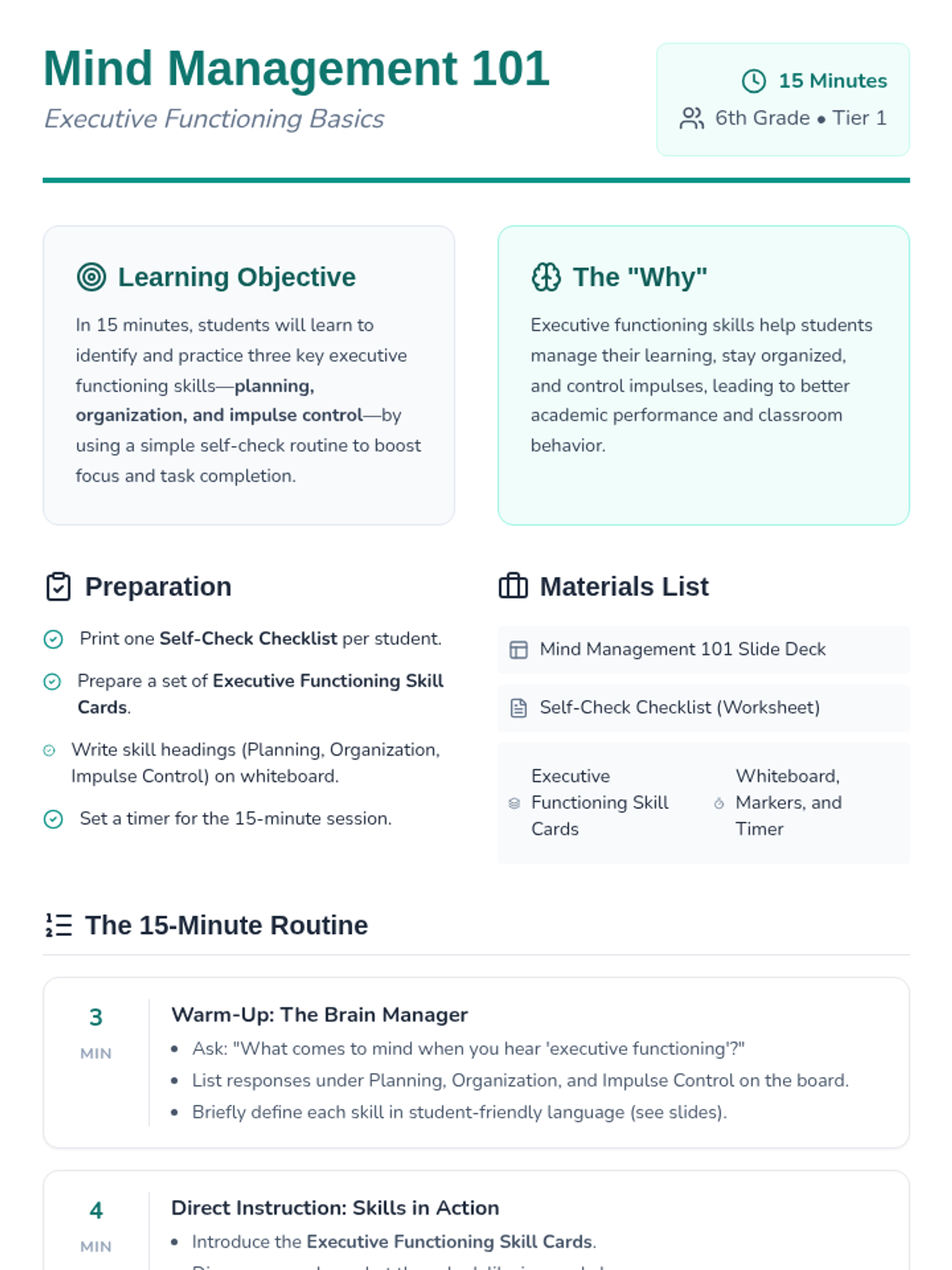 A quick, 15-minute Tier 1 lesson for 6th graders to explore and practice key executive functioning skills: planning, organization, and impulse control.