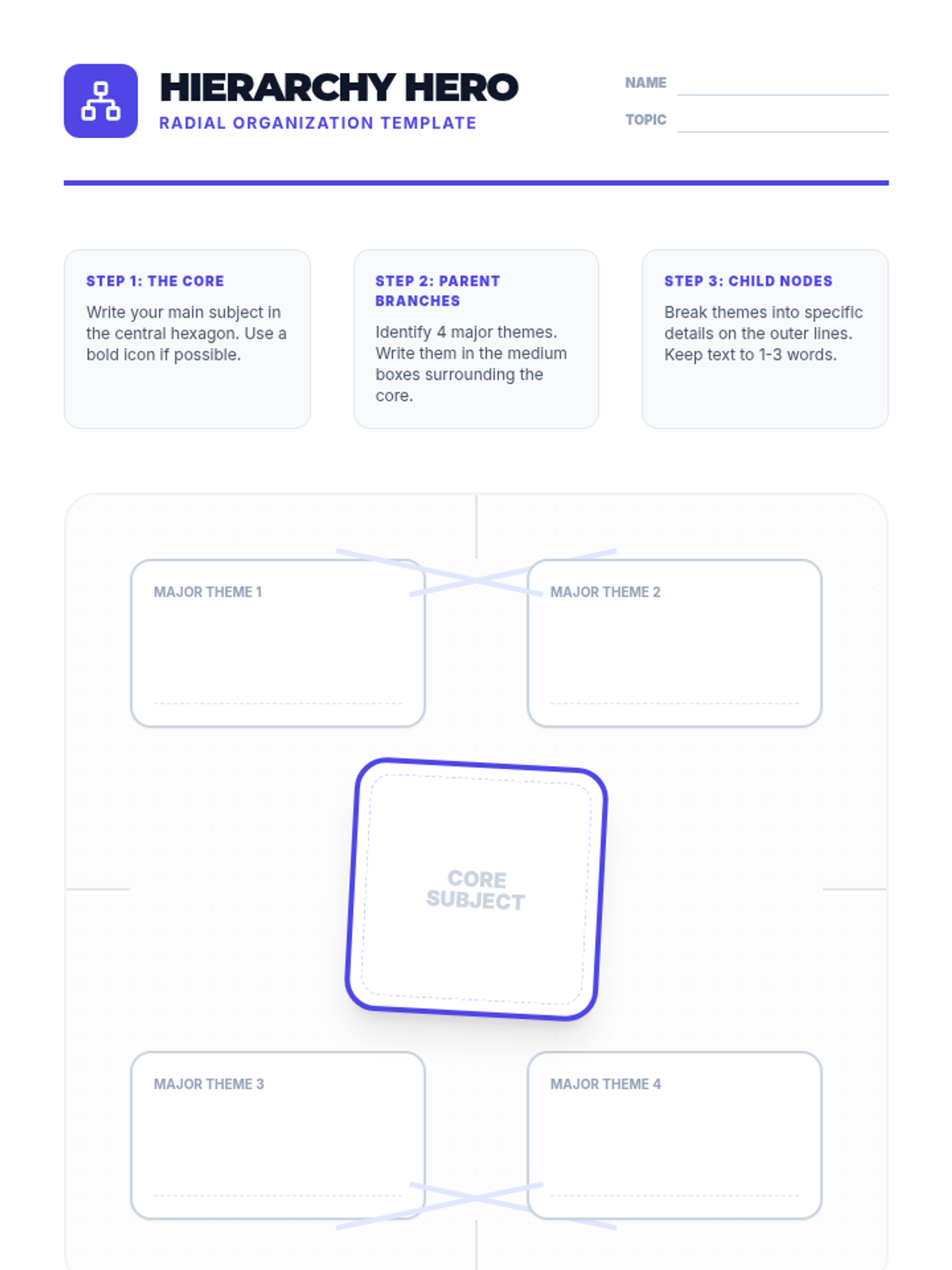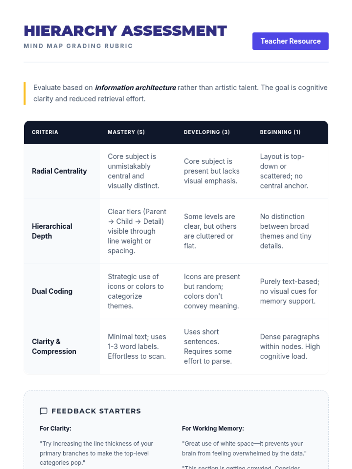 Teaches students how to construct mind maps to organize information hierarchically. Focuses on spatial reasoning to reveal relationships between central themes and specific details.