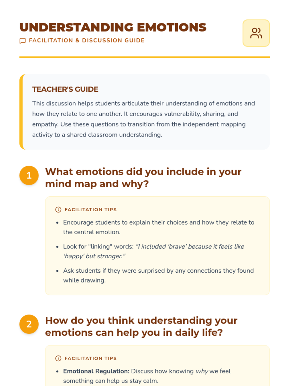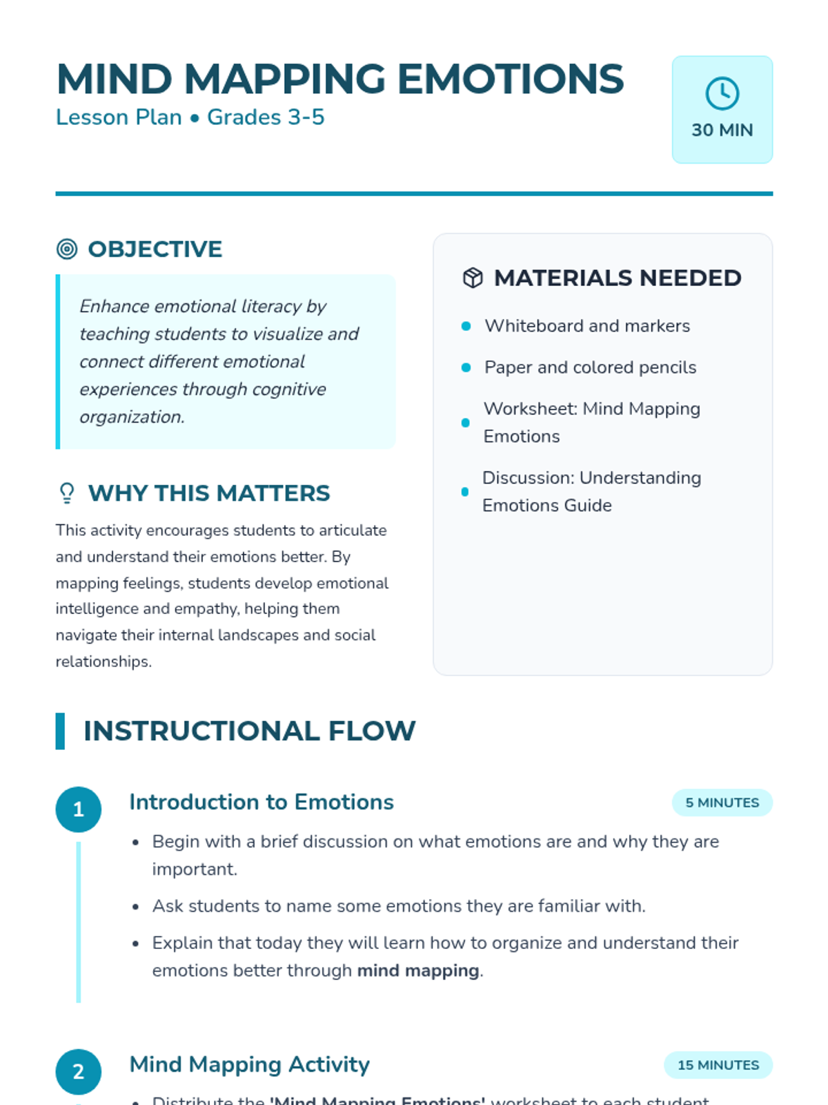 Students explore the landscape of their feelings by creating visual mind maps. This lesson builds emotional literacy and cognitive organization of complex emotional experiences for grades 3-5.