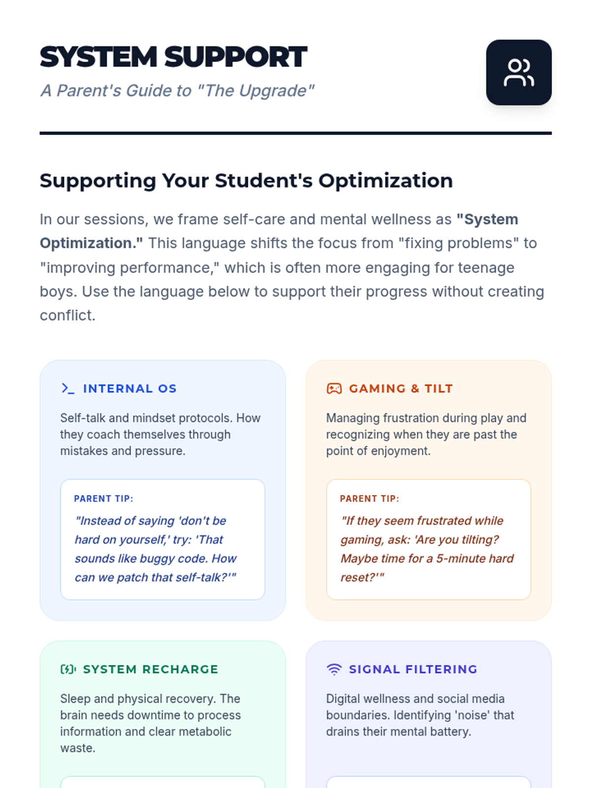 A specialized individual counseling lesson designed for teenage boys, framing self-care and positive self-talk as 'system optimization' for peak performance in digital and physical life.