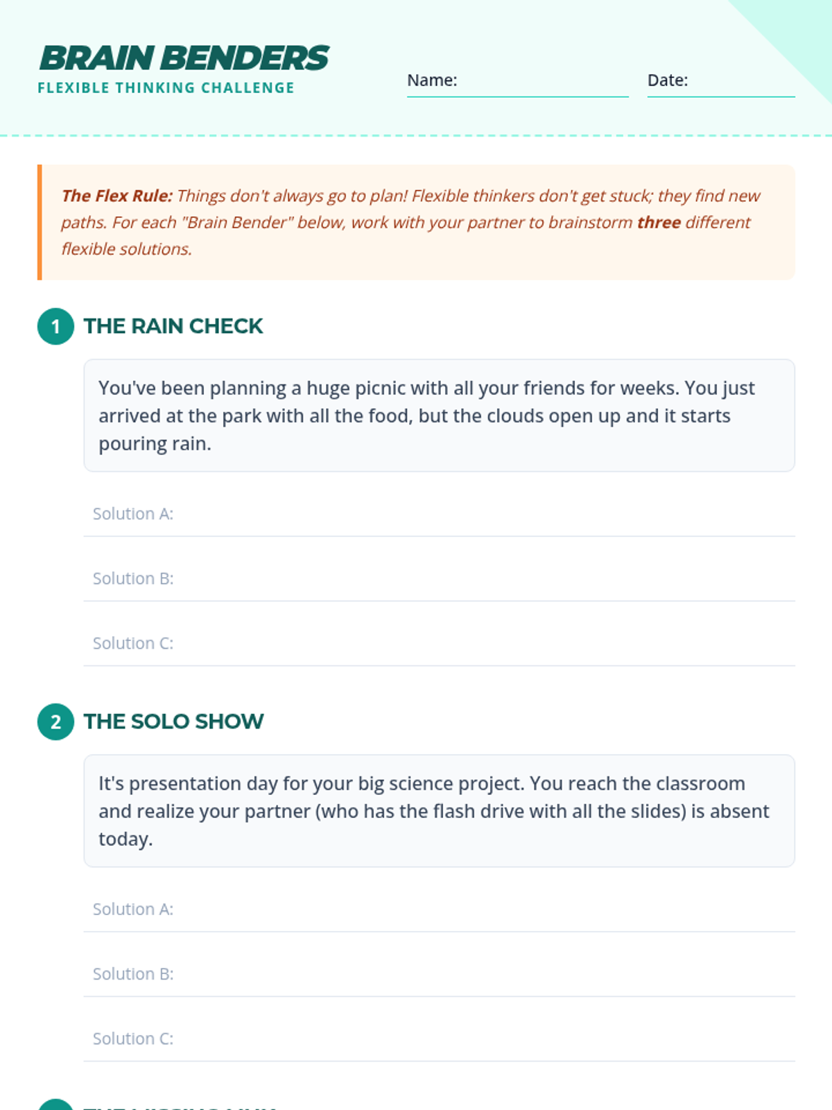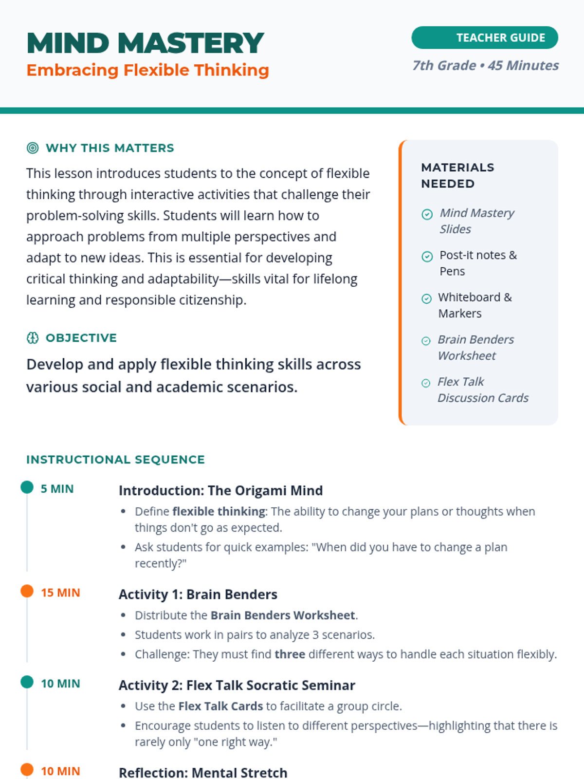 This lesson introduces 7th-grade students to the concept of flexible thinking through interactive scenarios and group discussions, fostering adaptability and problem-solving skills.