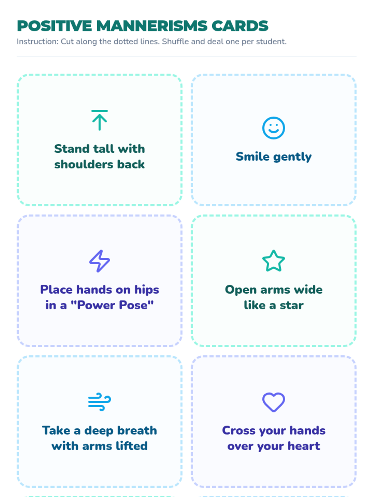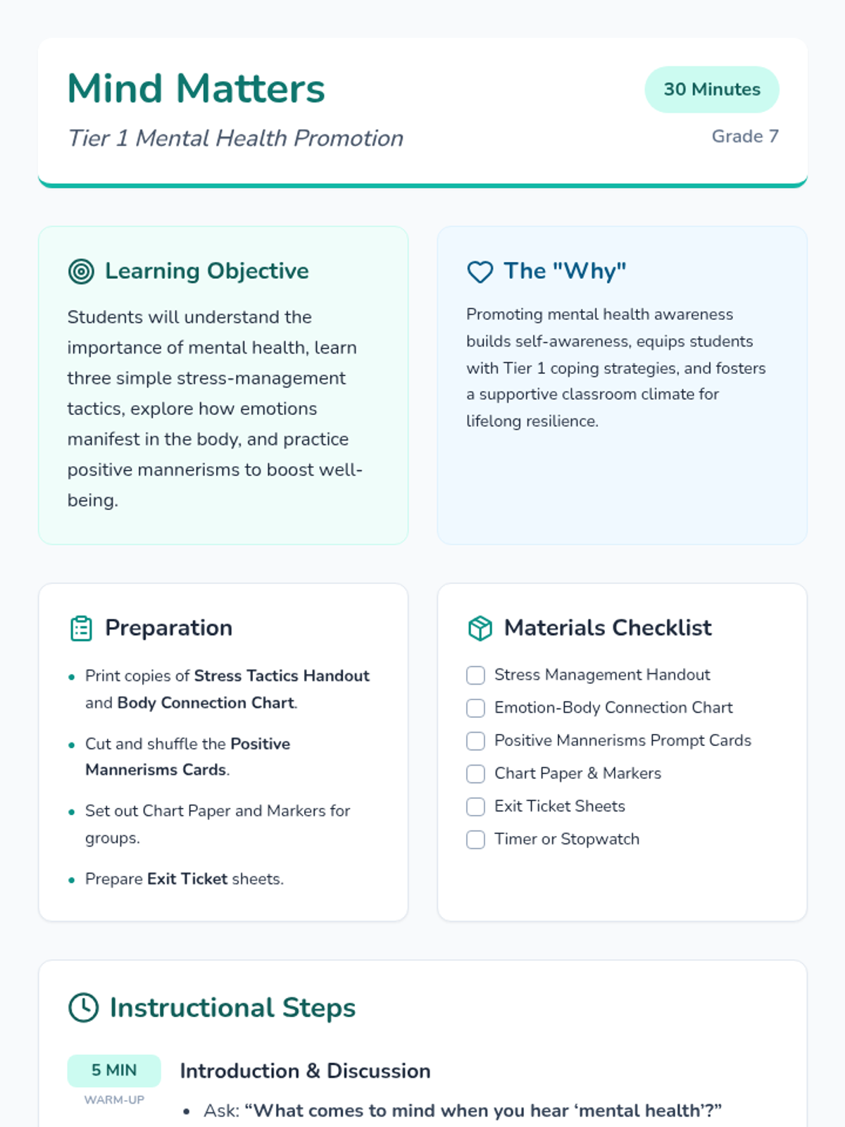 A 30-minute Tier 1 mental health lesson for 7th graders focusing on the mind-body connection, stress management tactics, and positive mannerisms. Students explore how emotions manifest physically and learn practical tools for resilience.