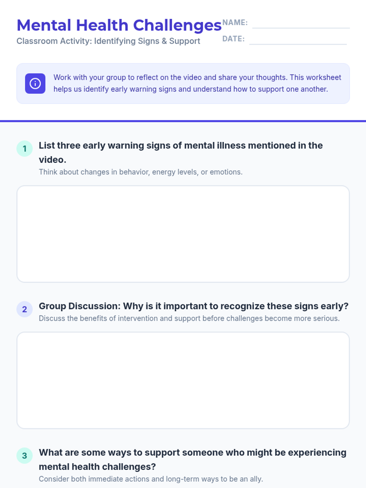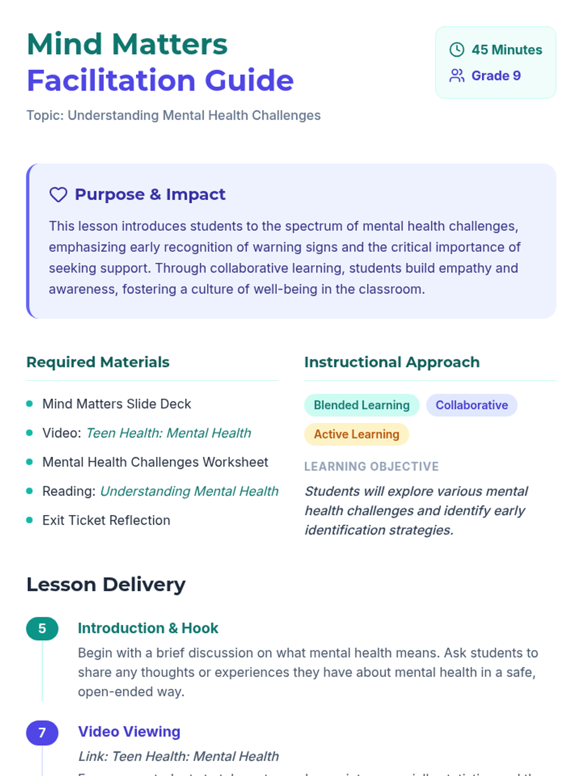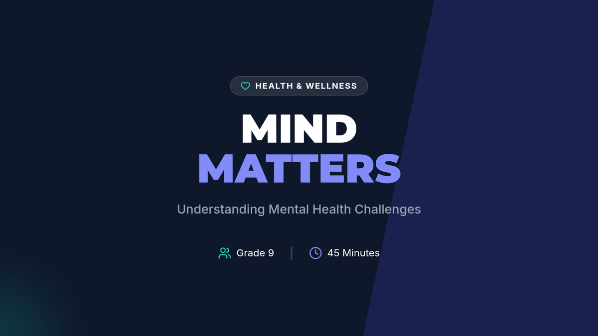 This lesson introduces 9th-grade students to mental health challenges, focusing on recognizing early warning signs and understanding the importance of seeking help through collaborative and active learning.