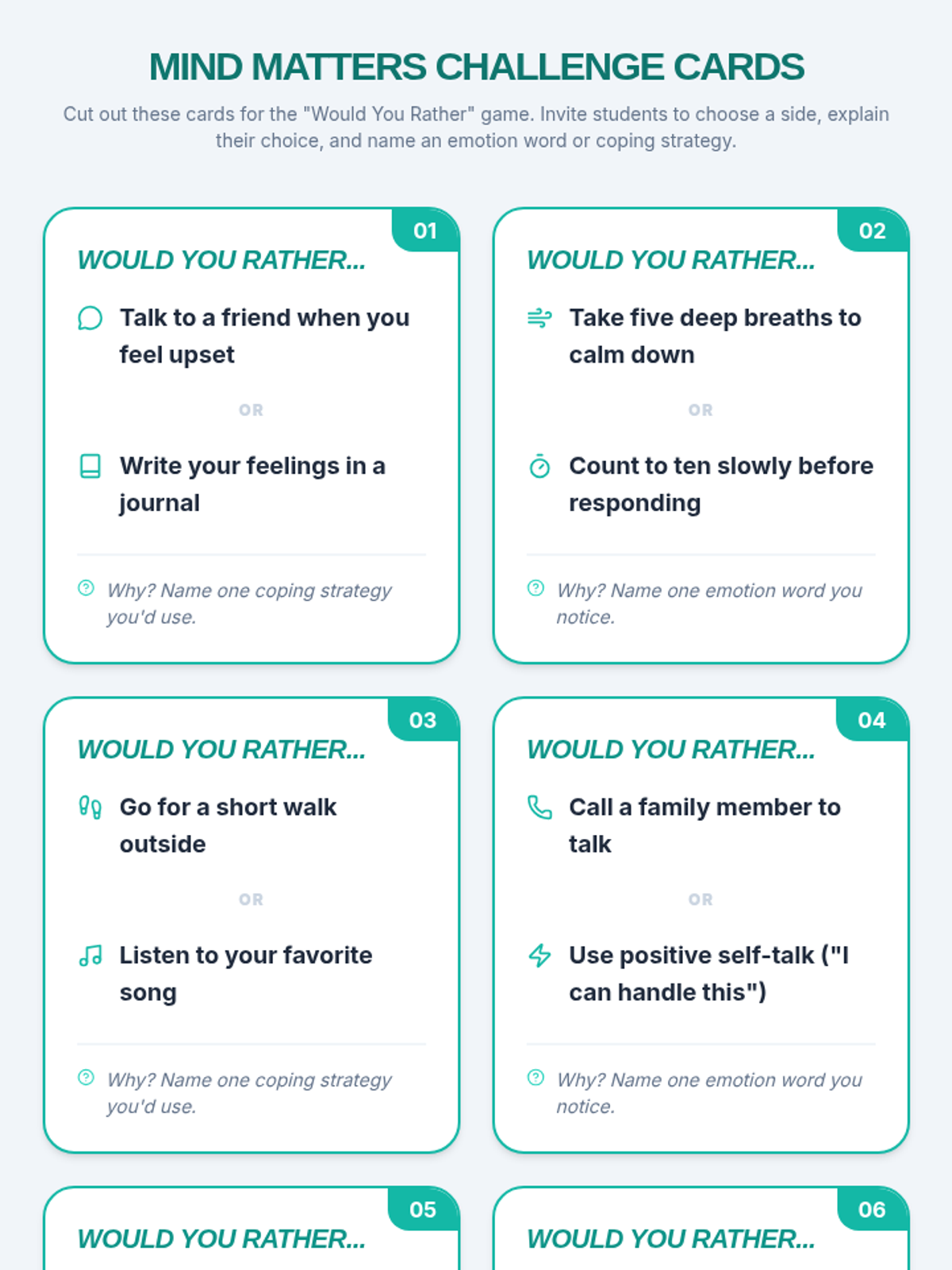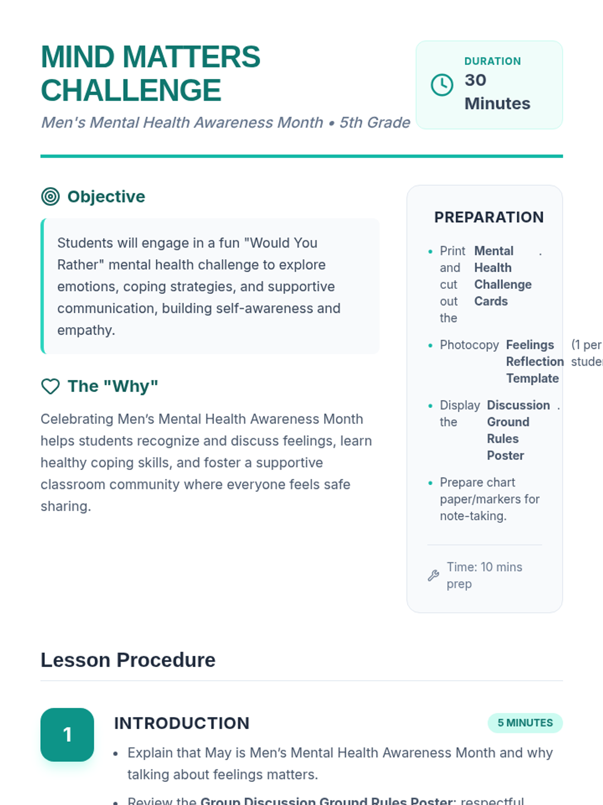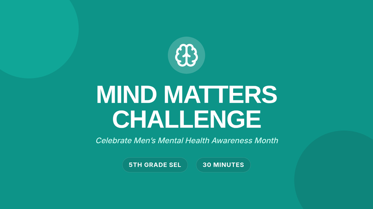 A 5th-grade Tier 1 SEL lesson celebrating Men’s Mental Health Awareness Month. Students participate in a 'Would You Rather' game to explore coping strategies, emotional vocabulary, and supportive communication.