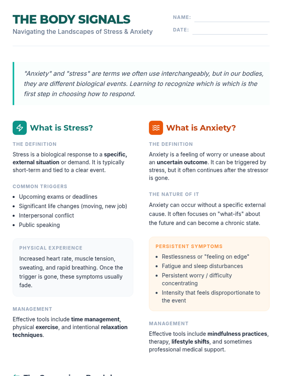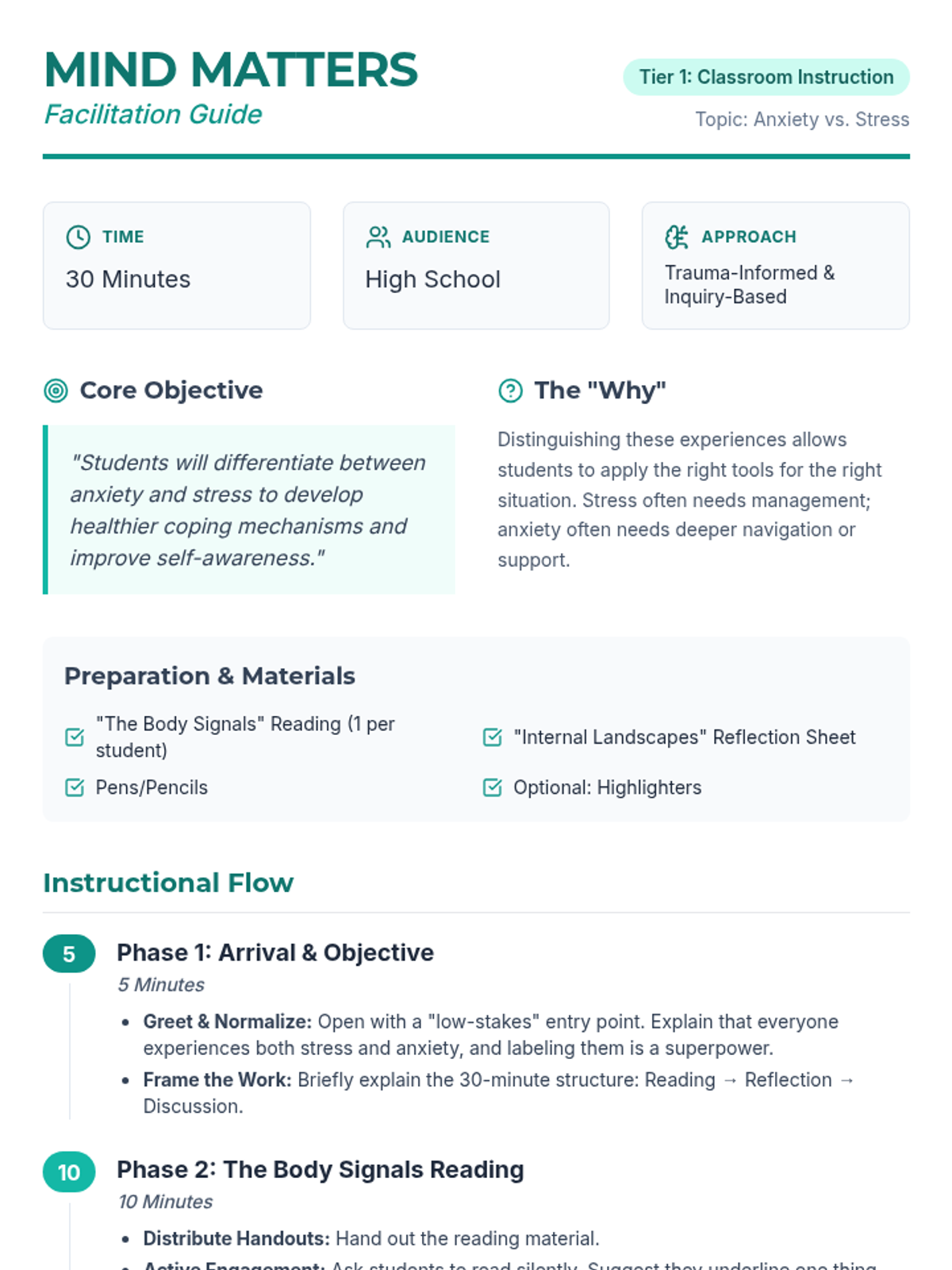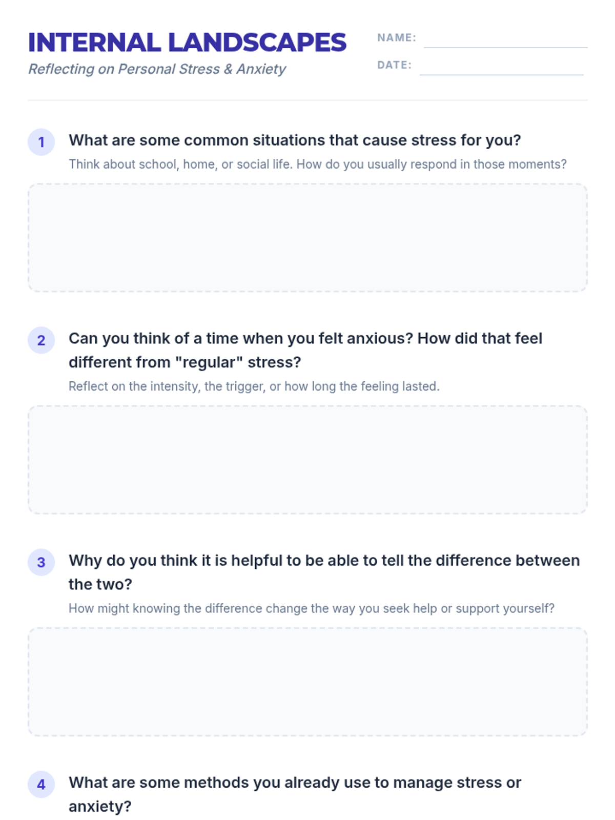 This lesson helps high school students differentiate between anxiety and stress using trauma-informed and inquiry-based techniques, fostering better self-awareness and coping strategies.