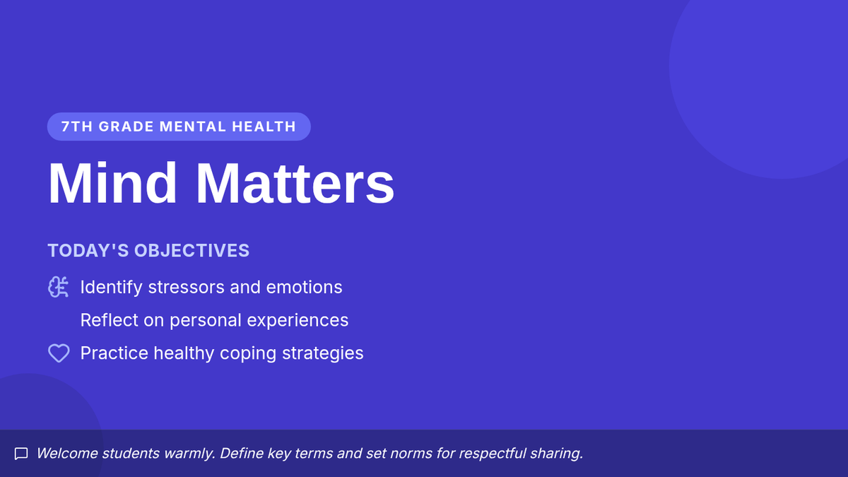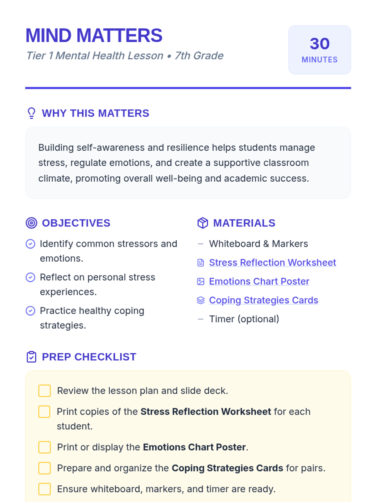A 30-minute mental health lesson for 7th graders focused on identifying stressors, understanding emotions, and practicing healthy coping strategies to build resilience.