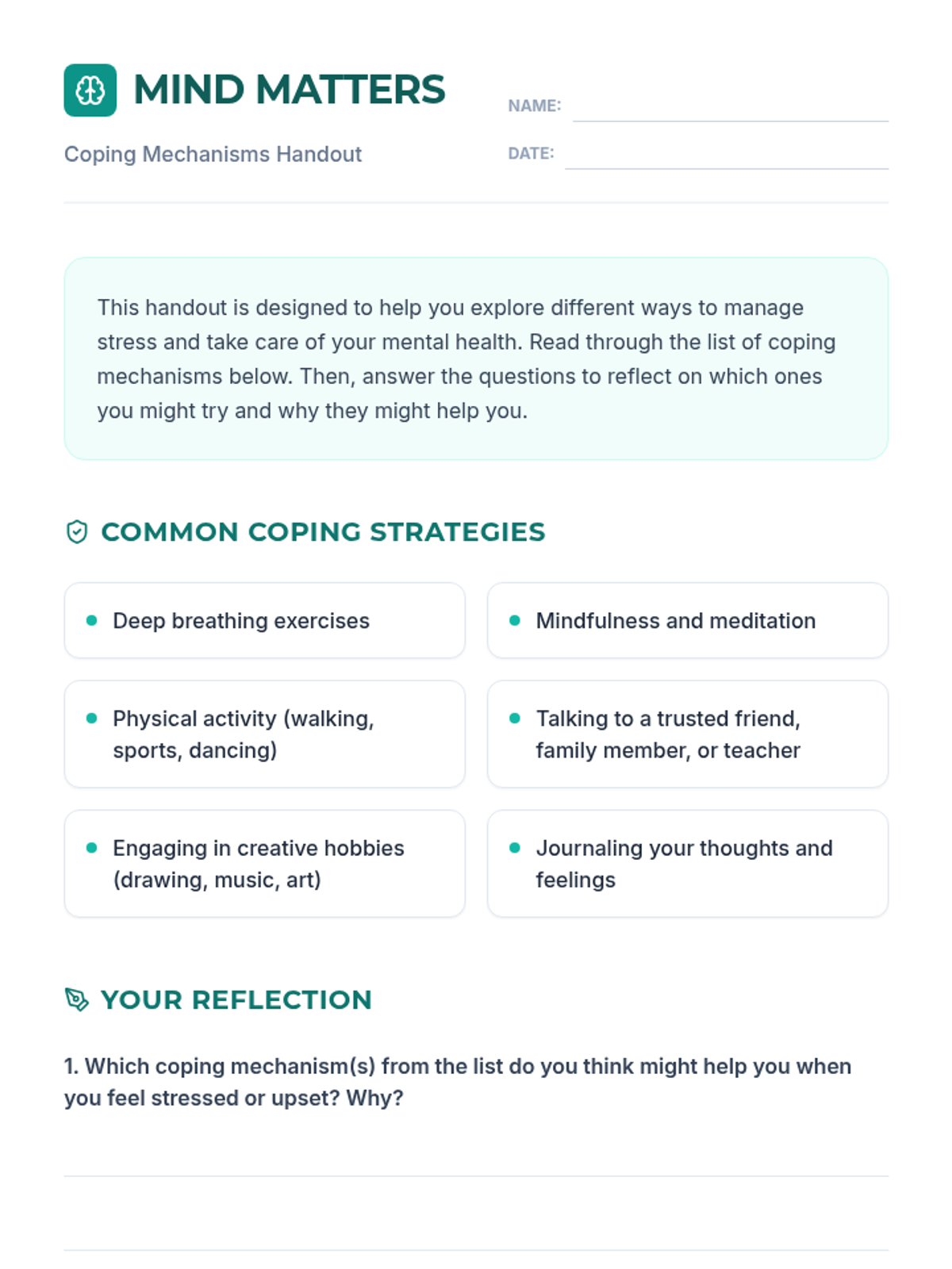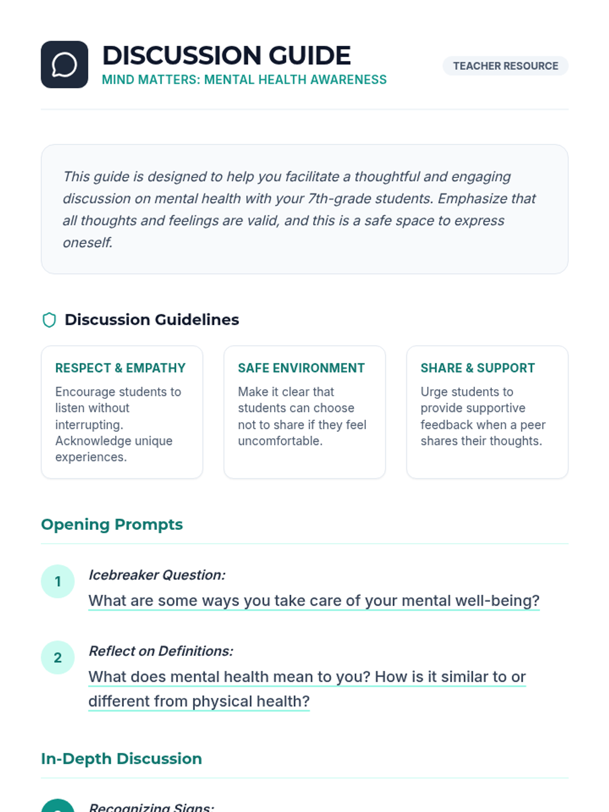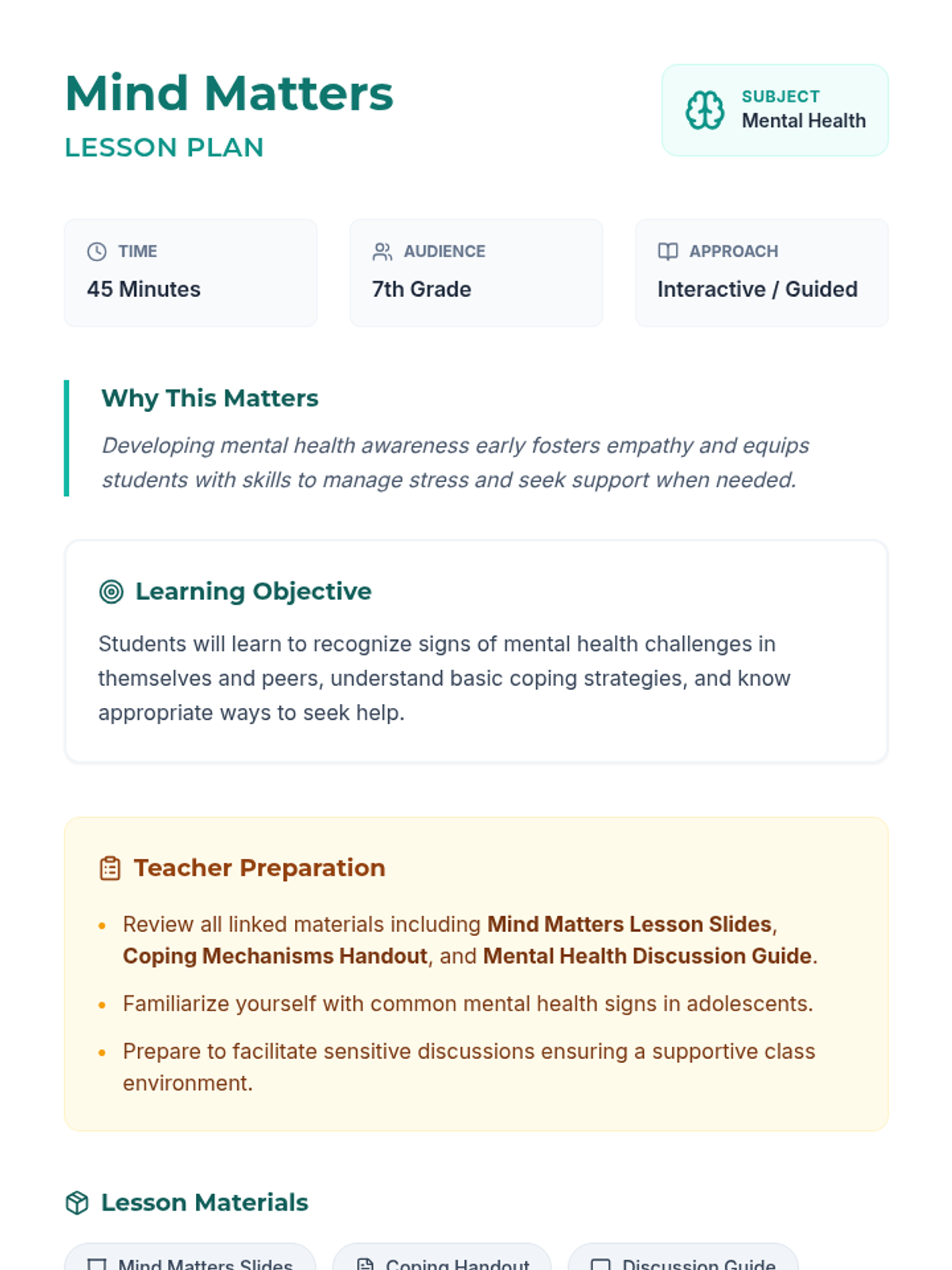 An introductory 45-minute lesson for 7th graders on recognizing mental health signs, developing coping strategies, and seeking help in a supportive environment.