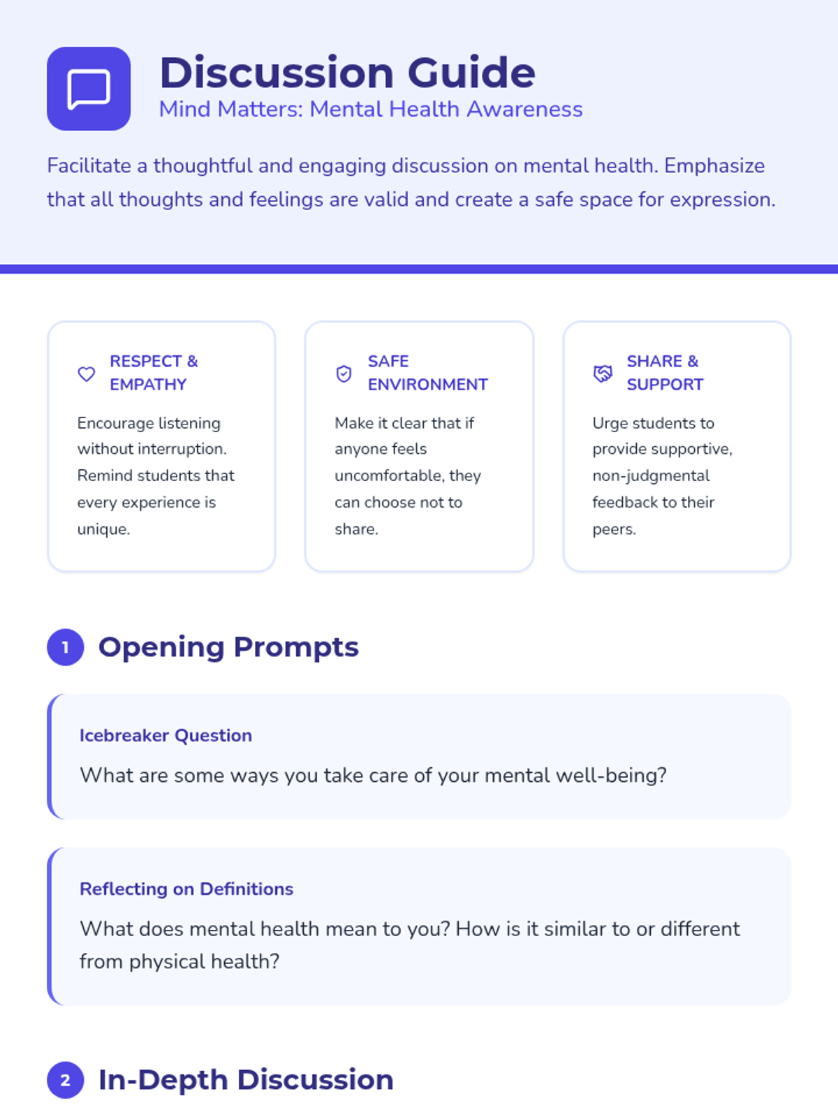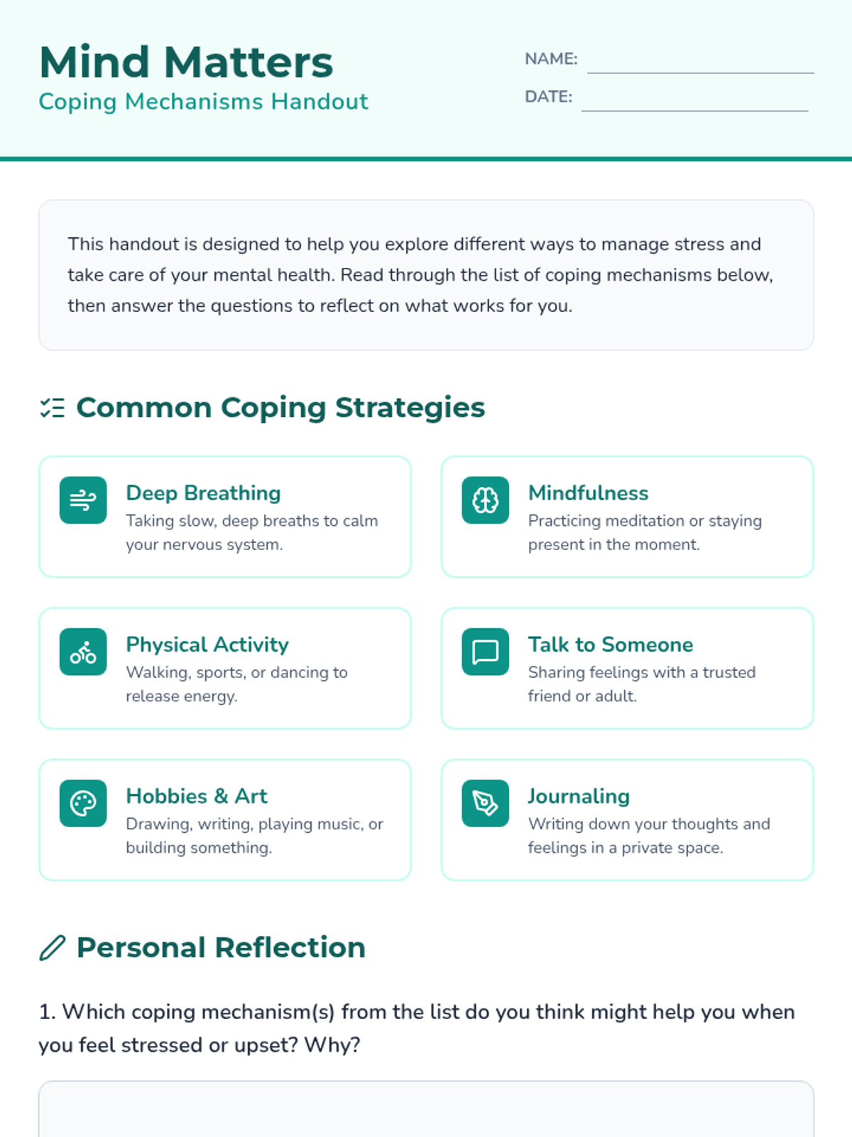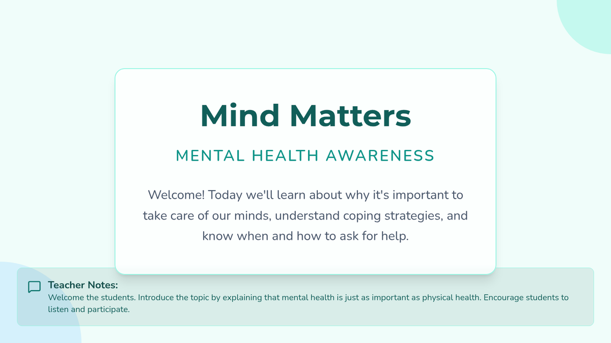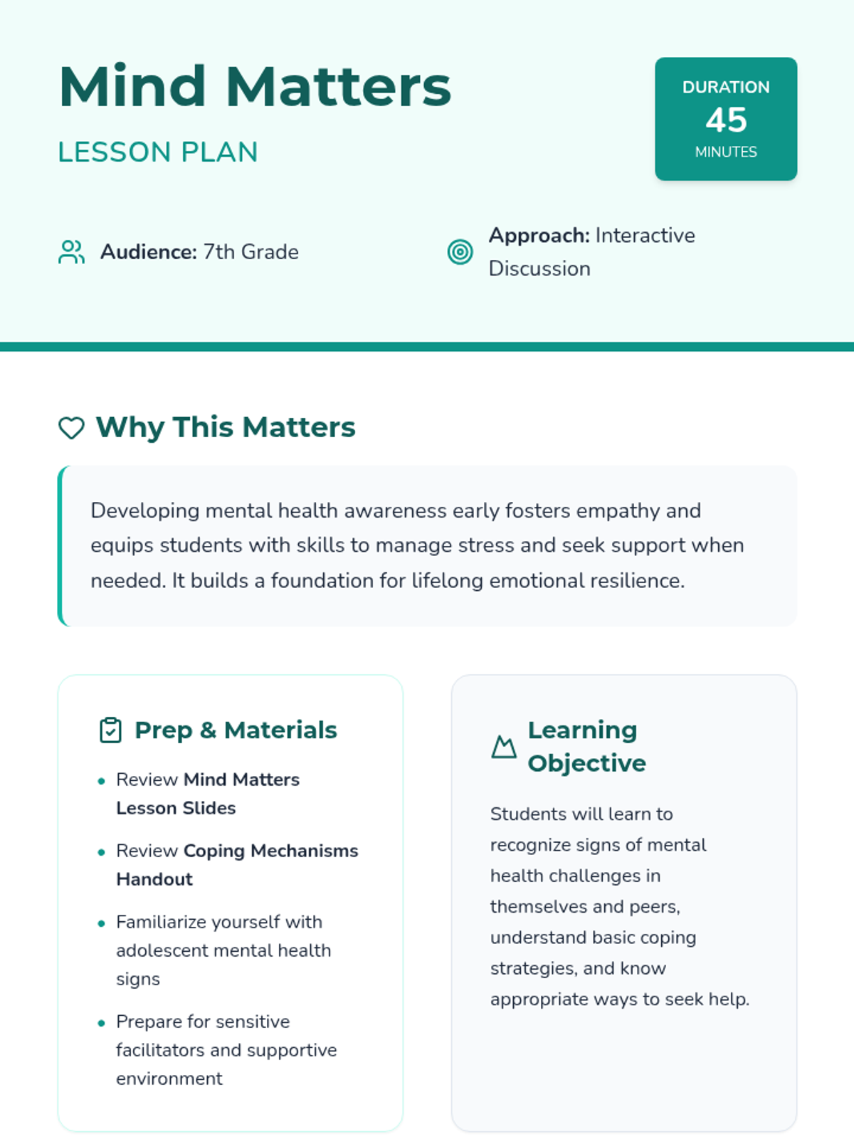 A 45-minute lesson for 7th graders focused on recognizing mental health signs, understanding coping strategies, and learning how to seek help in a supportive environment.
