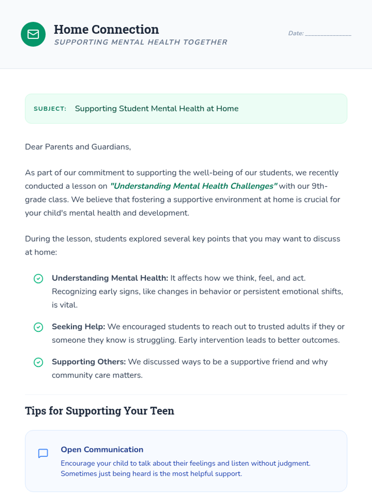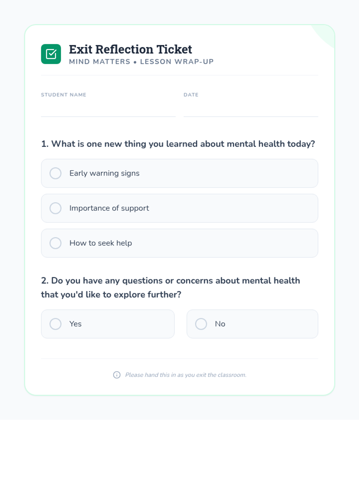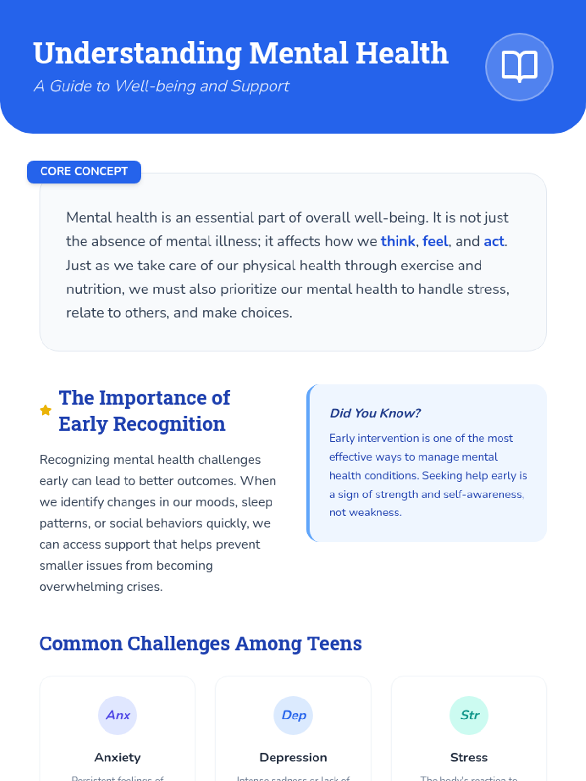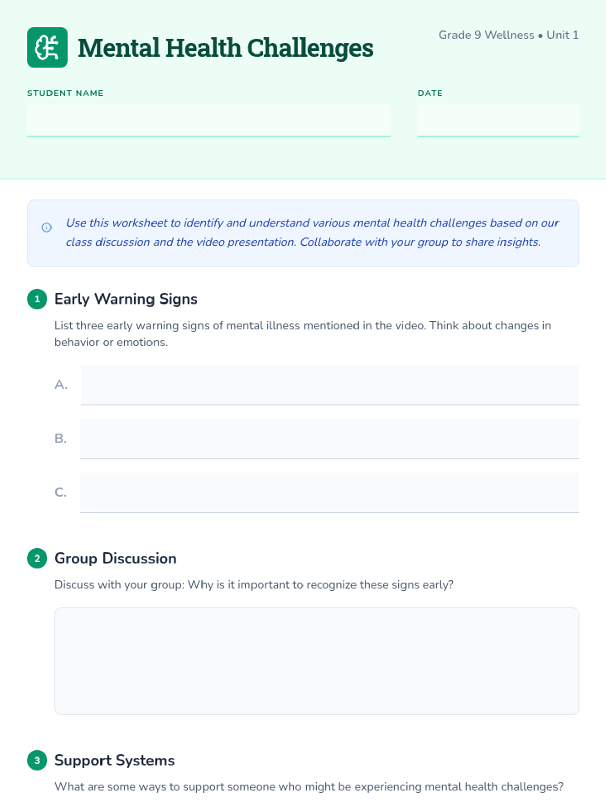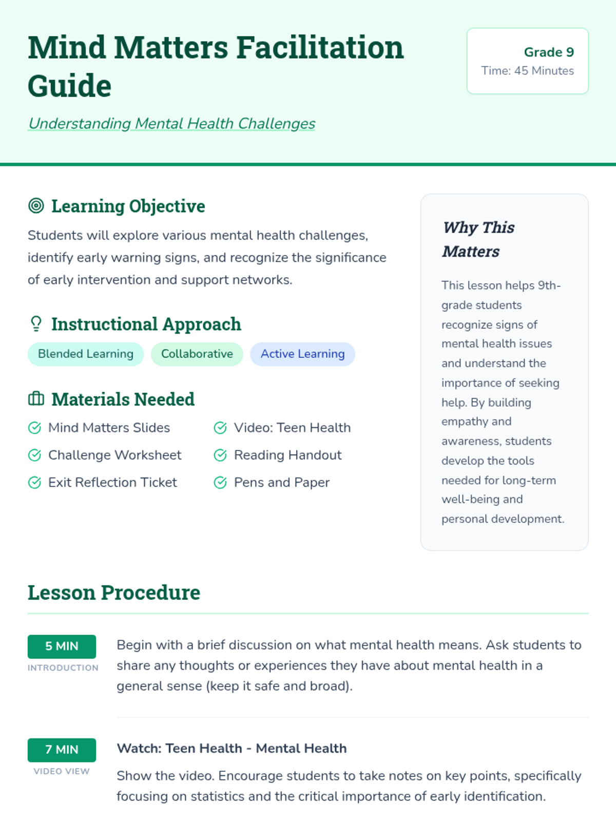 An introductory lesson for 9th graders to recognize mental health challenges, identify early warning signs, and understand the importance of seeking support through collaborative activities and reflection.