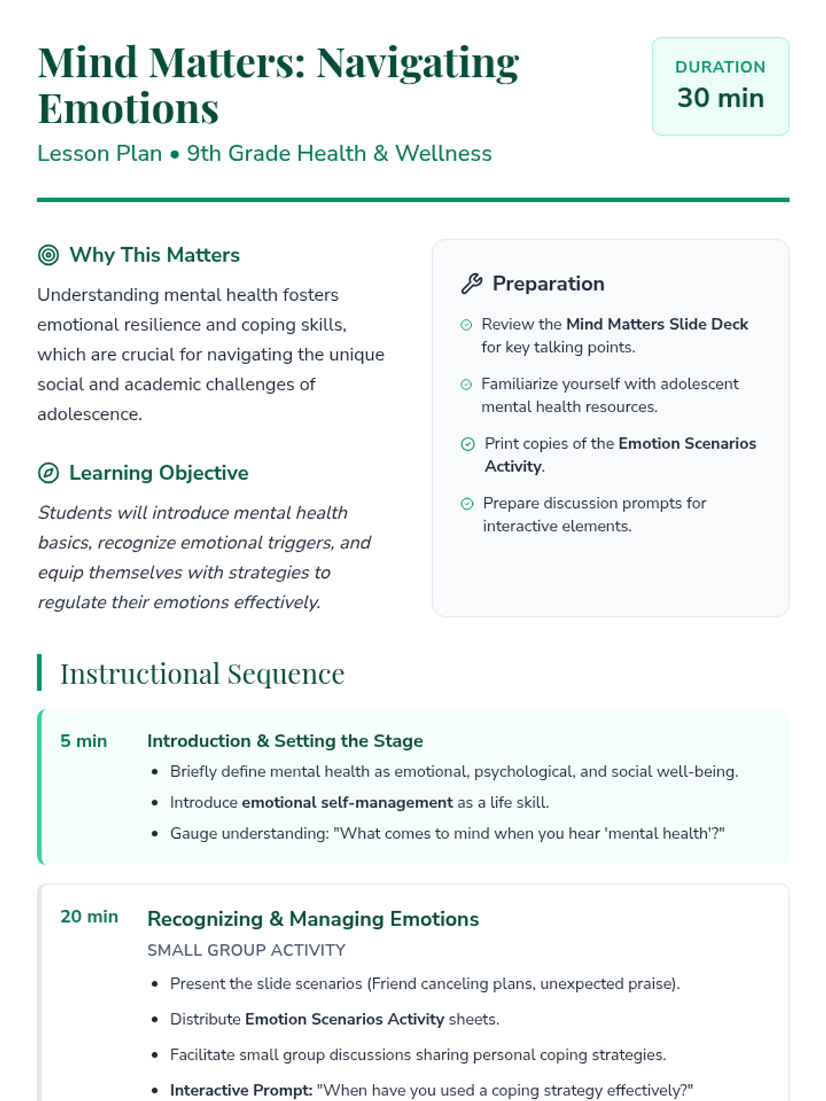 A foundational 30-minute mental health lesson for 9th graders focusing on emotional intelligence and self-regulation. Students learn to identify emotions and develop practical coping strategies for adolescent challenges.