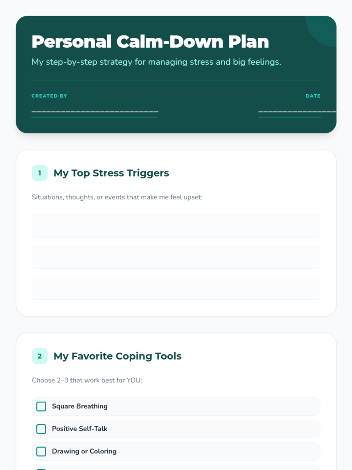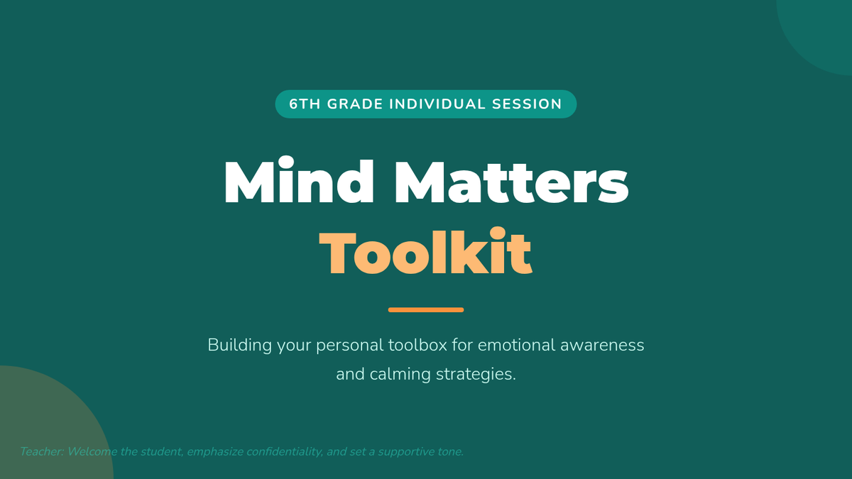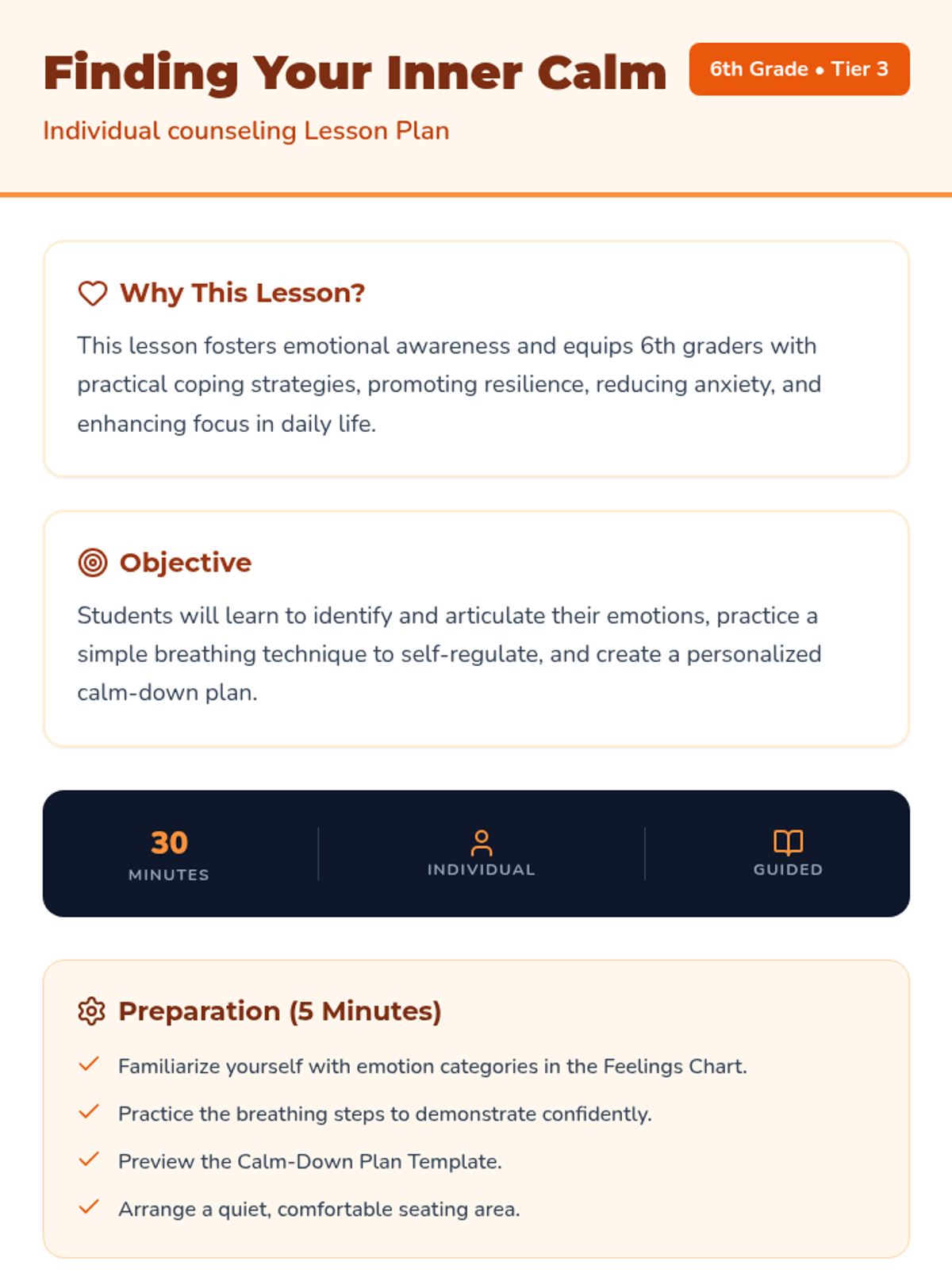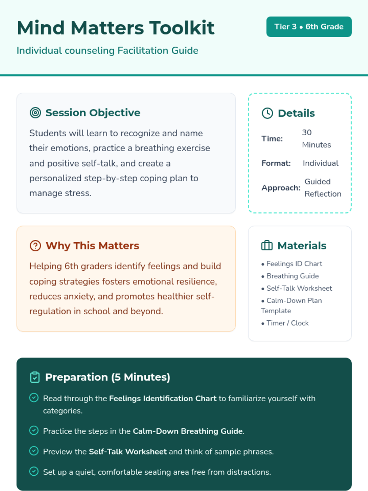 A focused 30-minute individual counseling session for 6th graders to develop emotional awareness and personal coping strategies through breathing techniques, self-talk, and a personalized plan.
