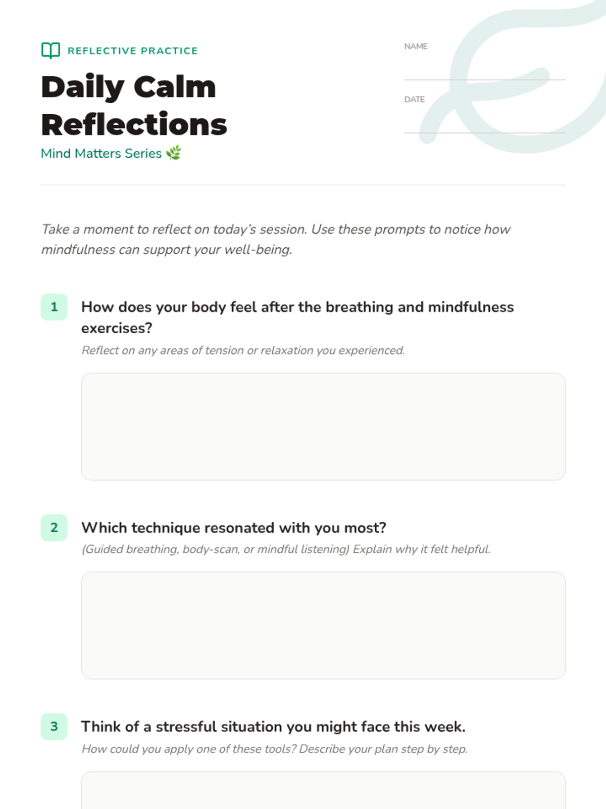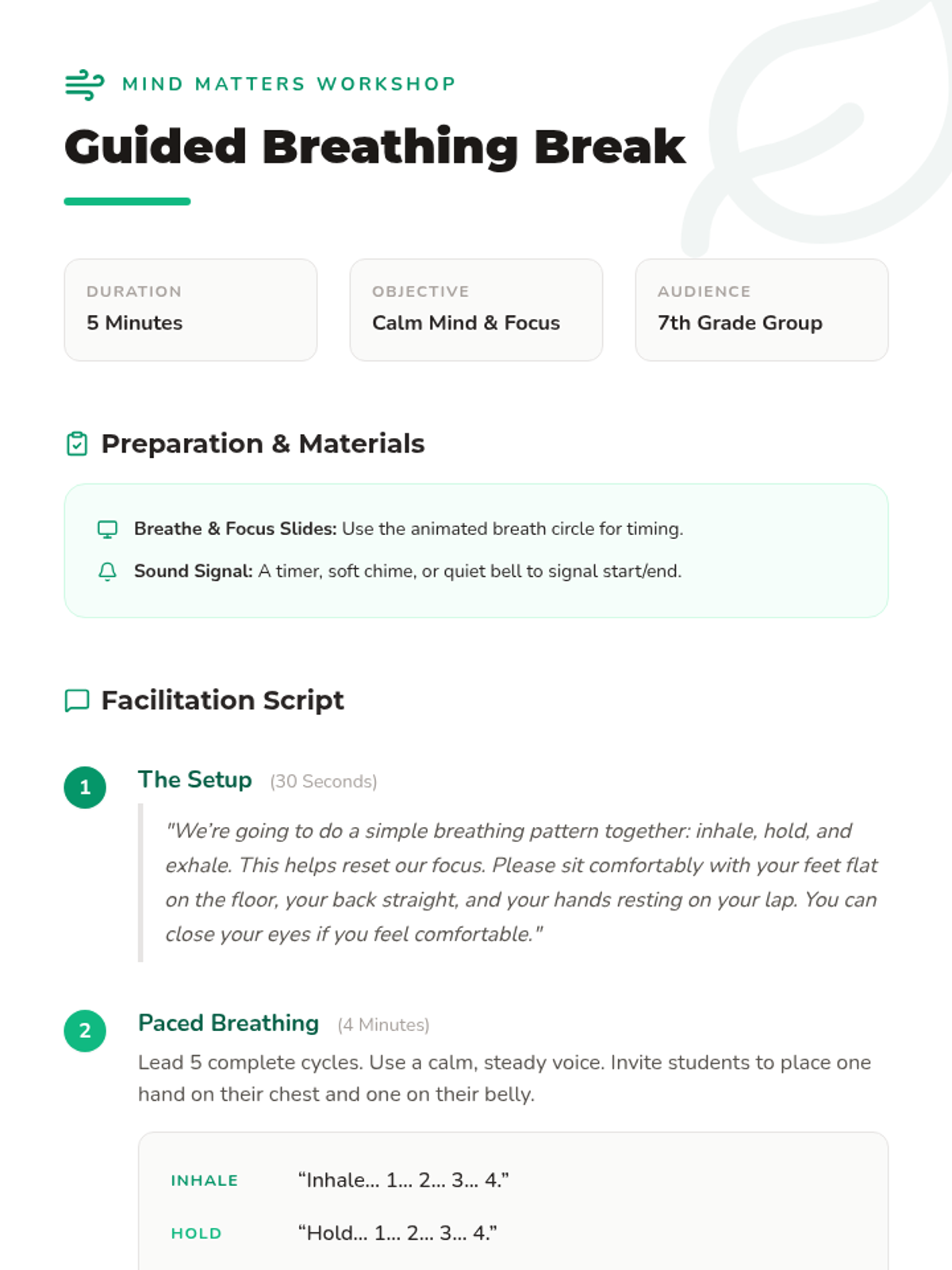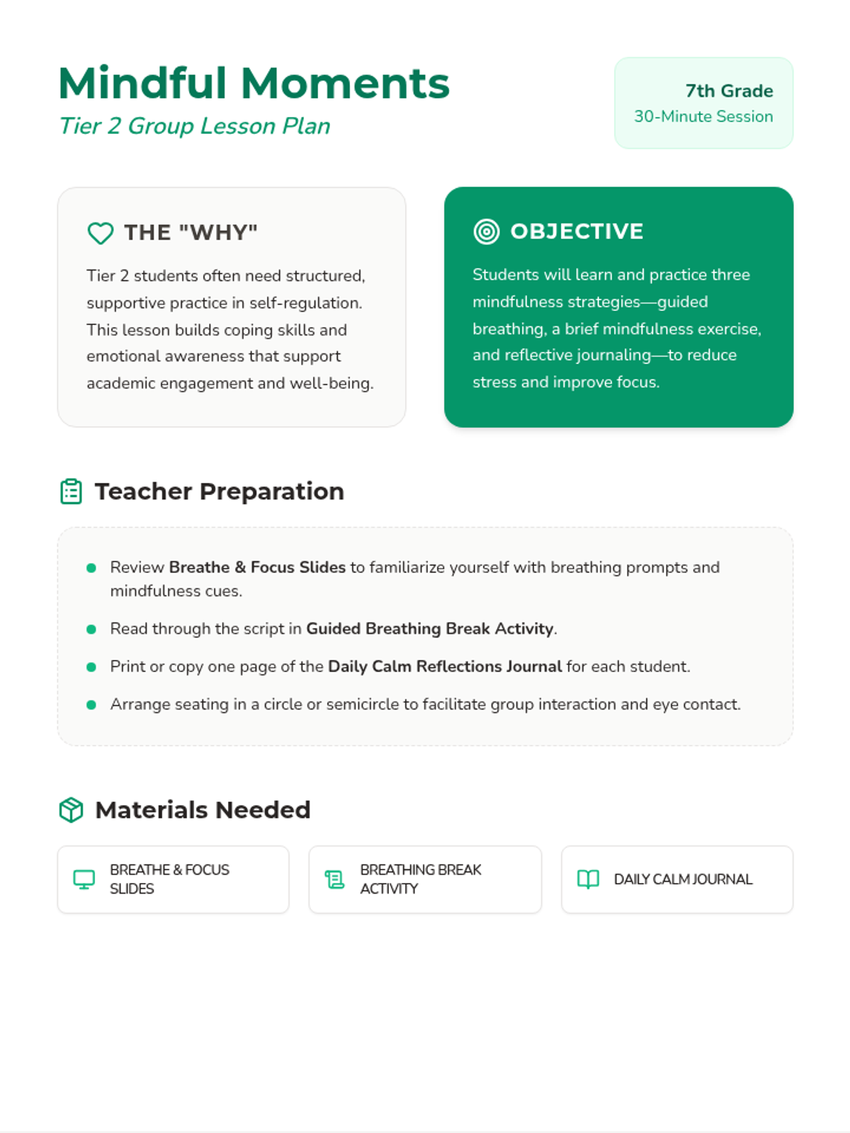 This Tier 2 group workshop for 7th graders introduces mindfulness techniques to reduce stress and improve focus through guided breathing, body-scan exercises, and reflective journaling.