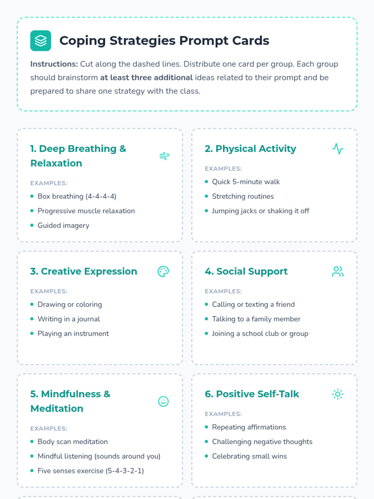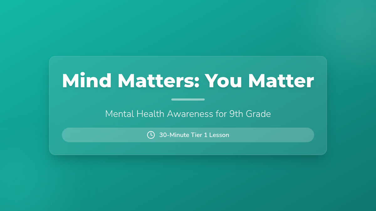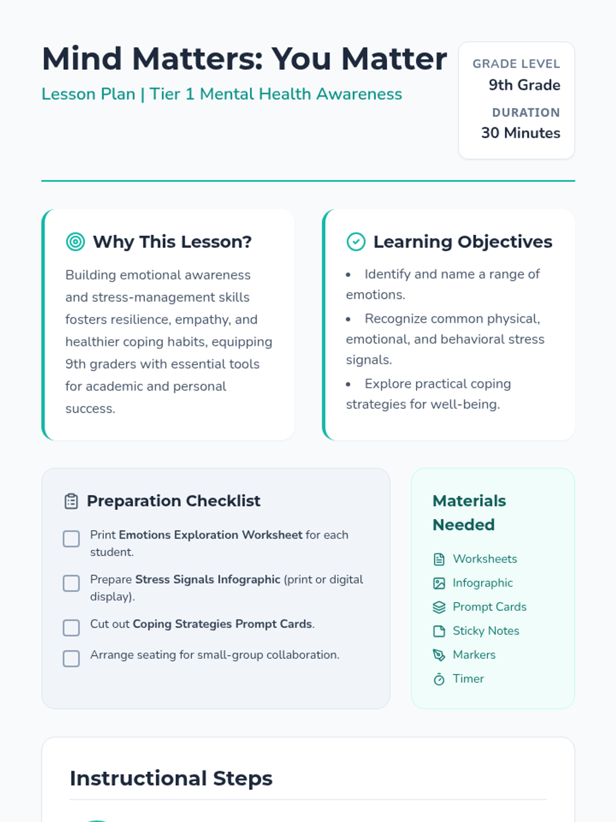 A Tier 1 mental health awareness lesson for 9th graders focused on emotional intelligence, stress identification, and developing healthy coping mechanisms. Students engage in self-reflection and collaborative brainstorming to build resilience.