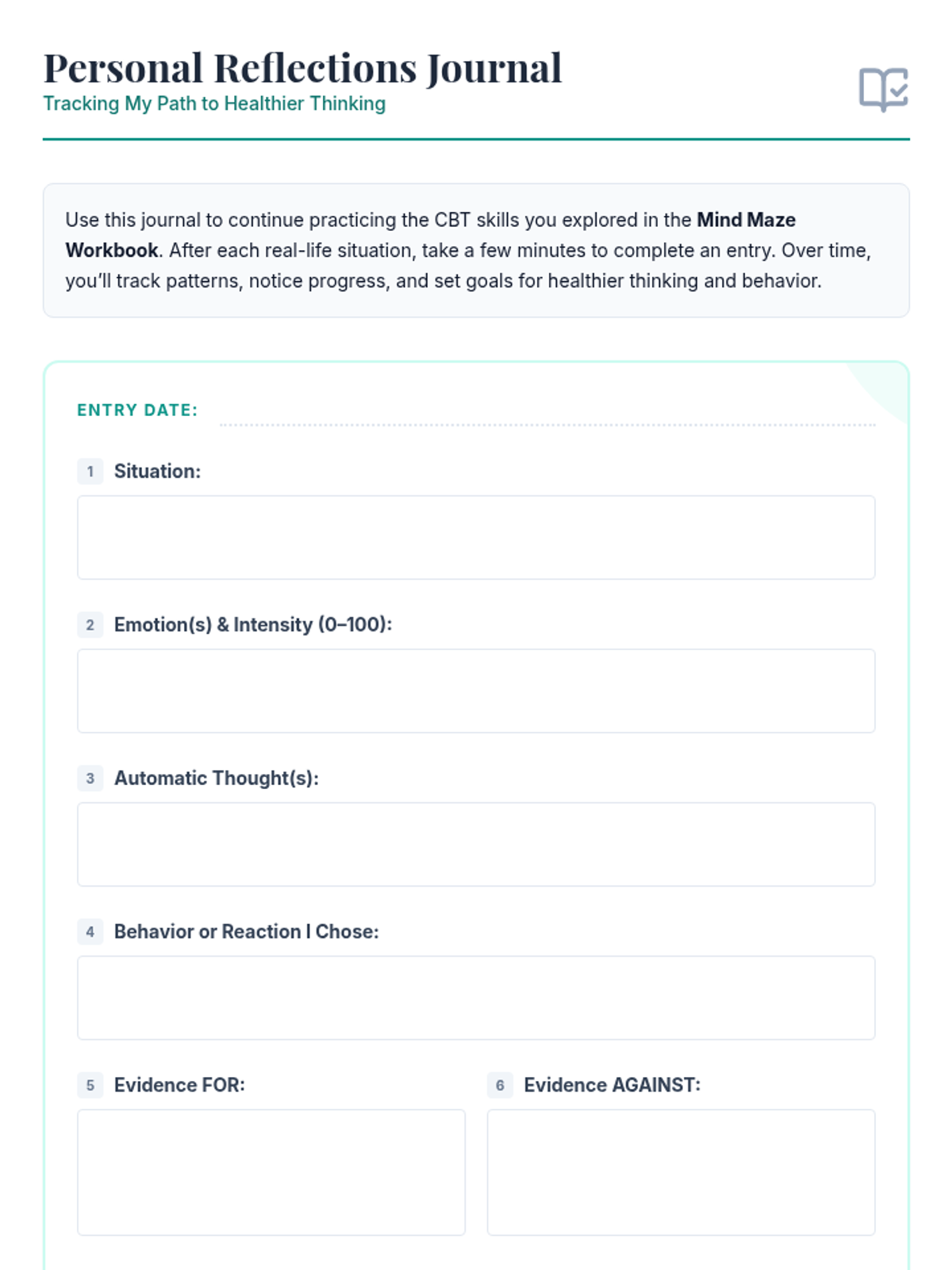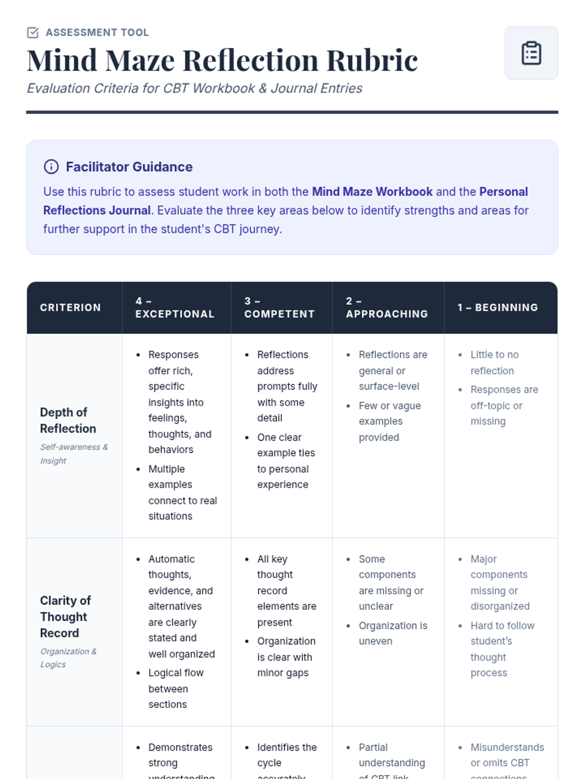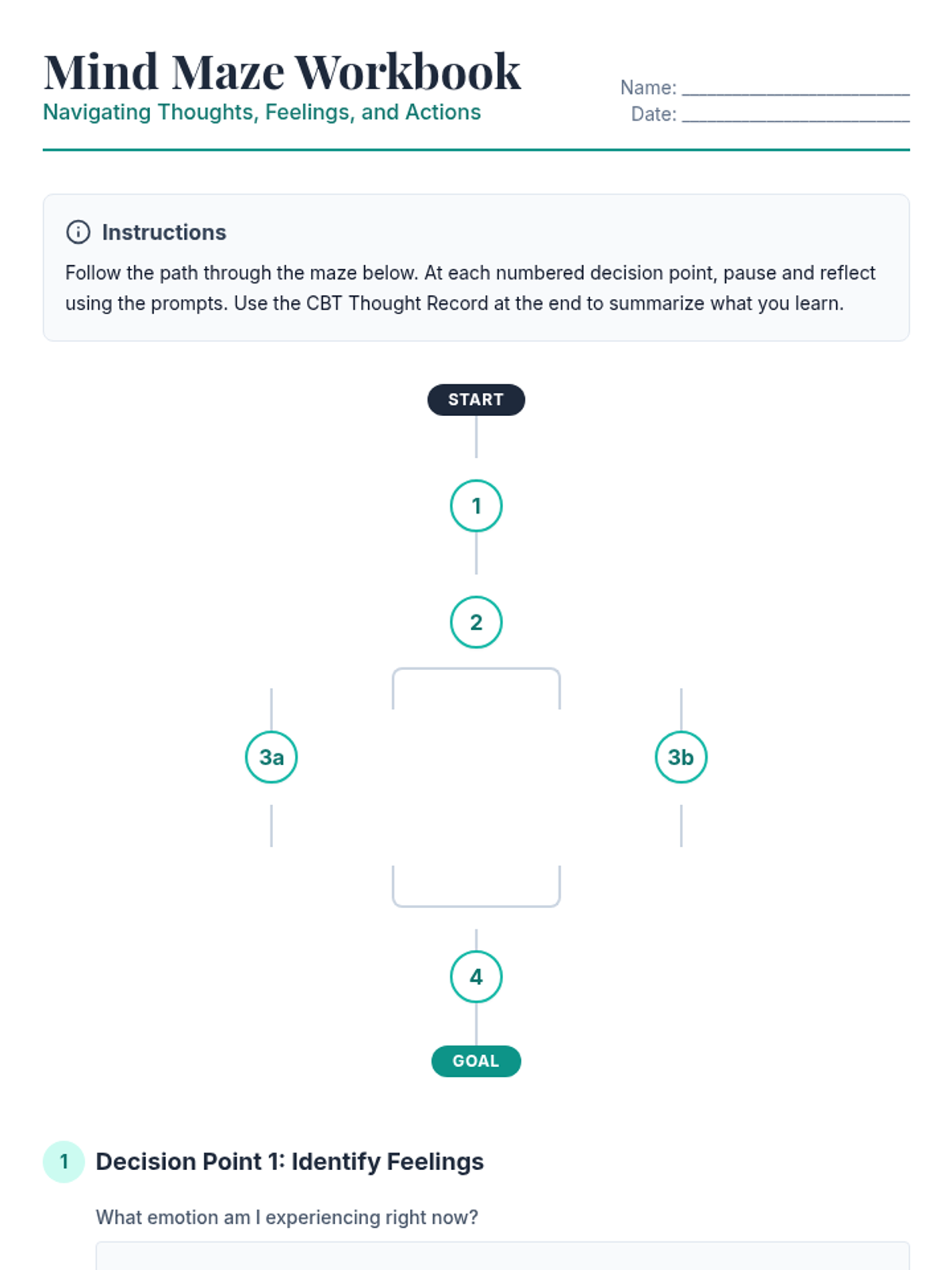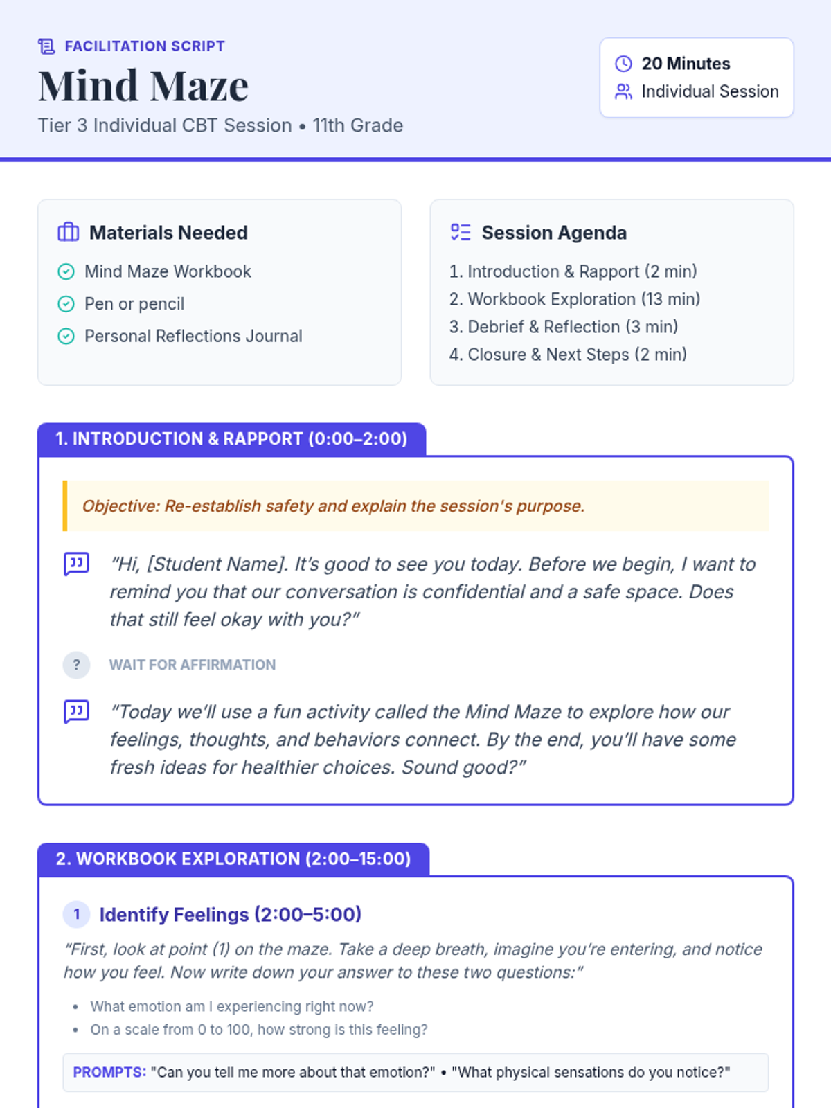 In this individual 20-minute Tier 3 CBT lesson, an 11th grade student navigates a custom maze metaphor to trace their feelings, thoughts, and behaviors toward healthier outcomes. This targeted session uses evidence-based strategies to foster self-awareness and adaptive thinking.