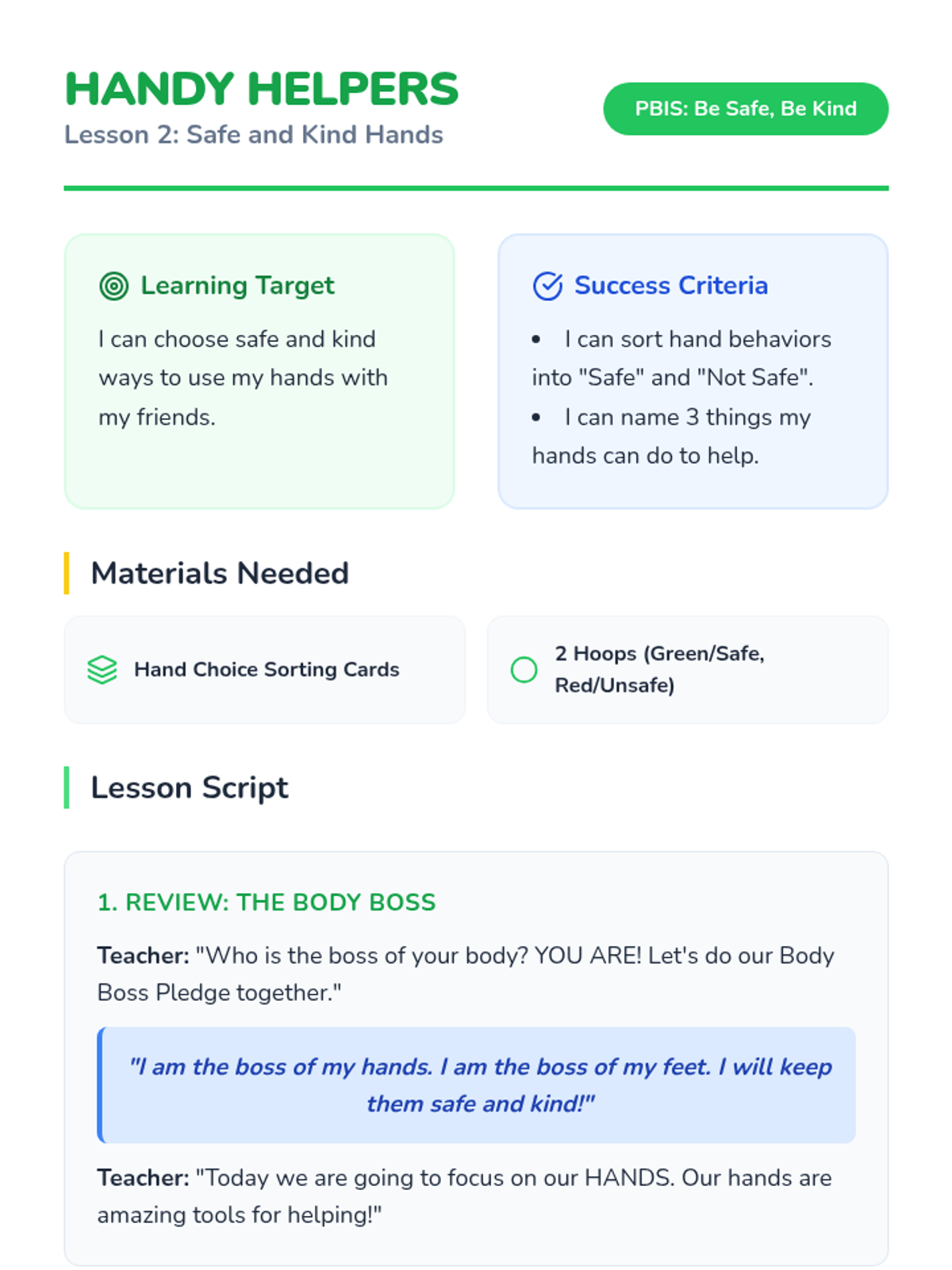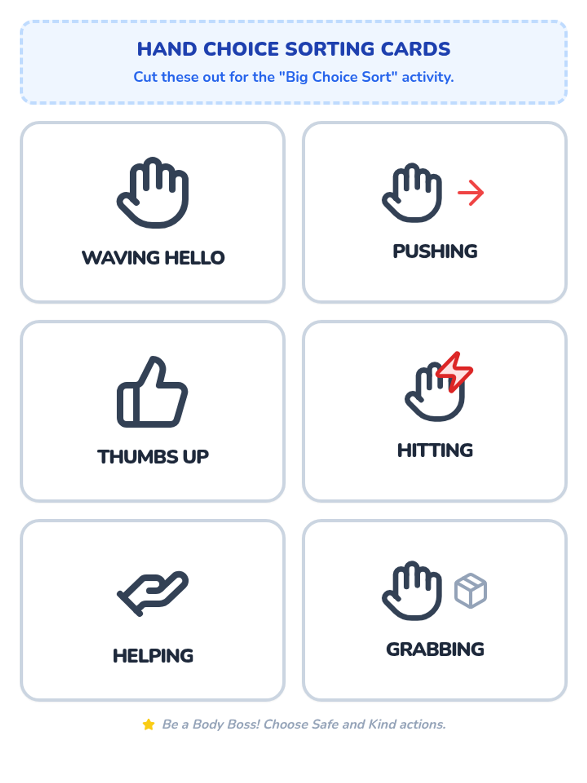 Focuses specifically on how hands can be used safely and kindly, featuring a sorting activity to distinguish between safe and unsafe choices.