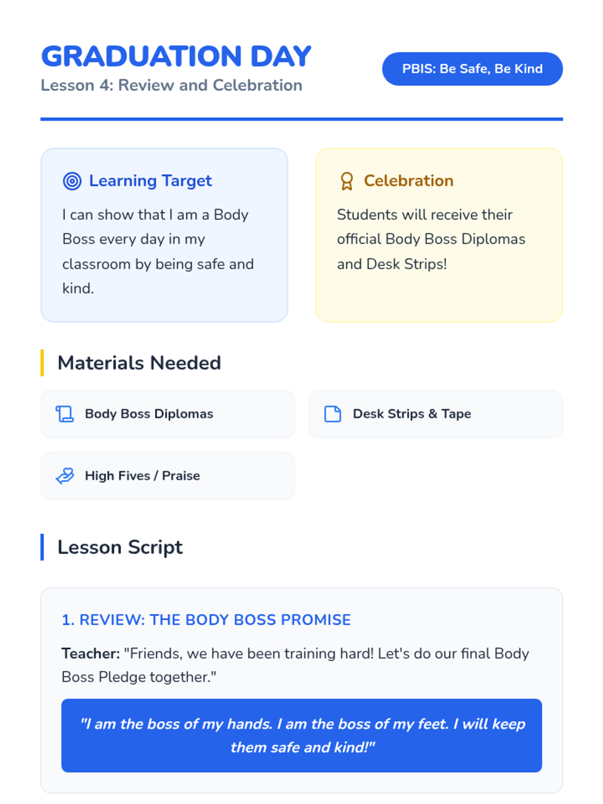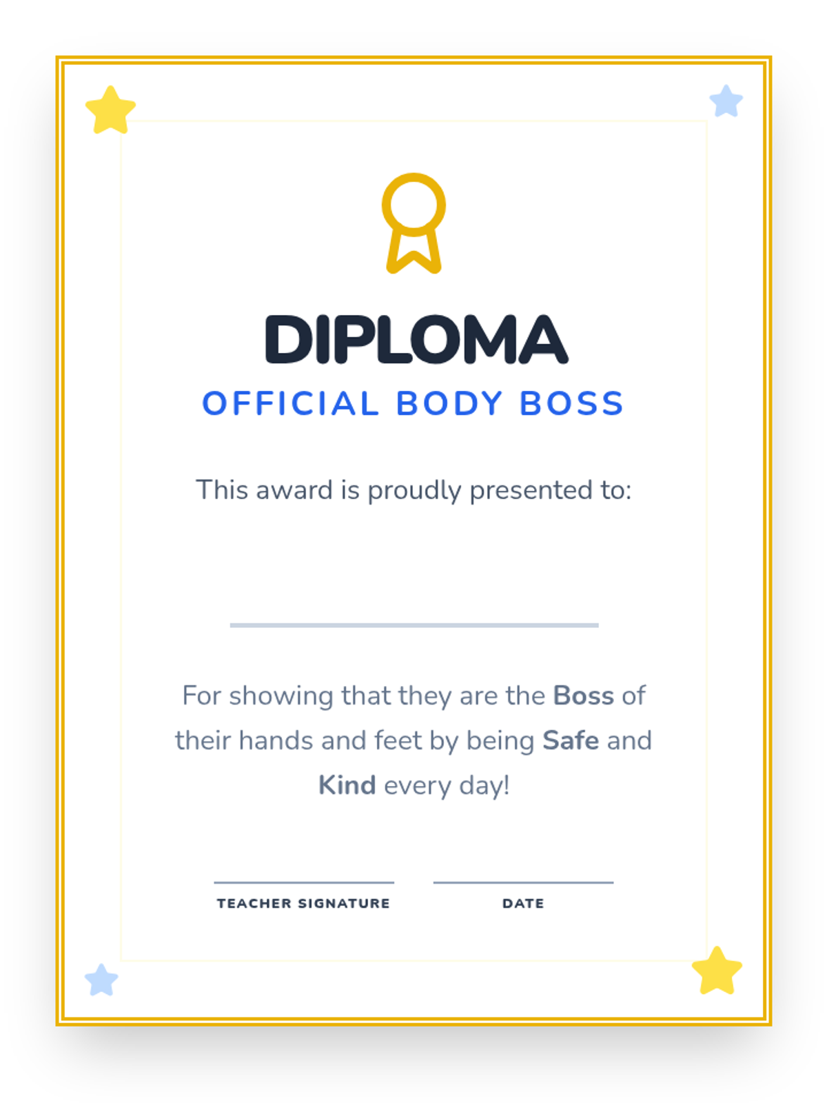 A review and celebration of learning where students receive visual reminders for their desks and earn their Body Boss diplomas.