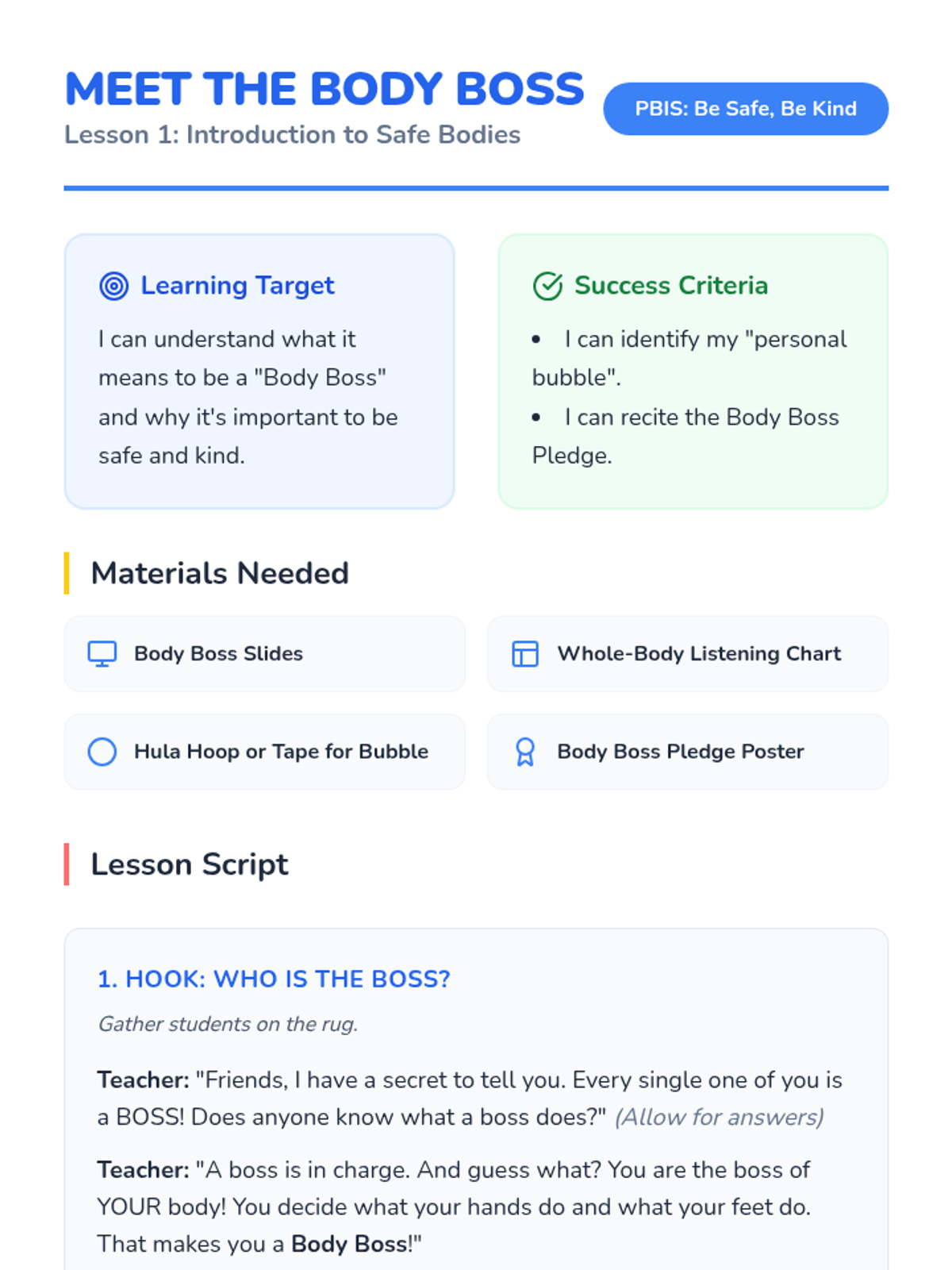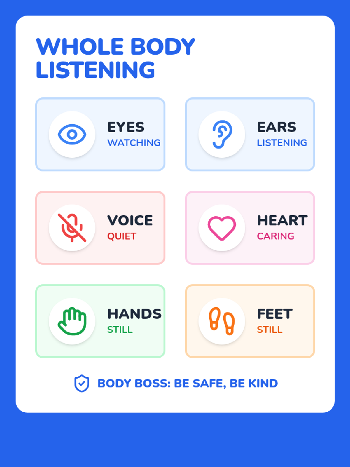 Introduces the concept of being a 'Body Boss' and the importance of having a safe and kind body using the Whole-Body Listening framework.