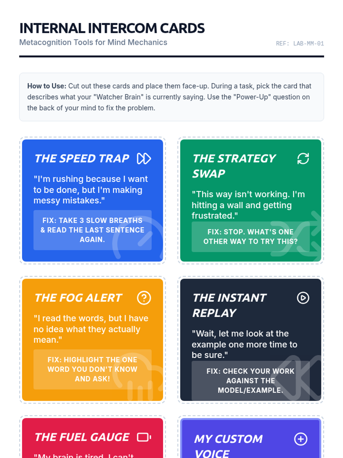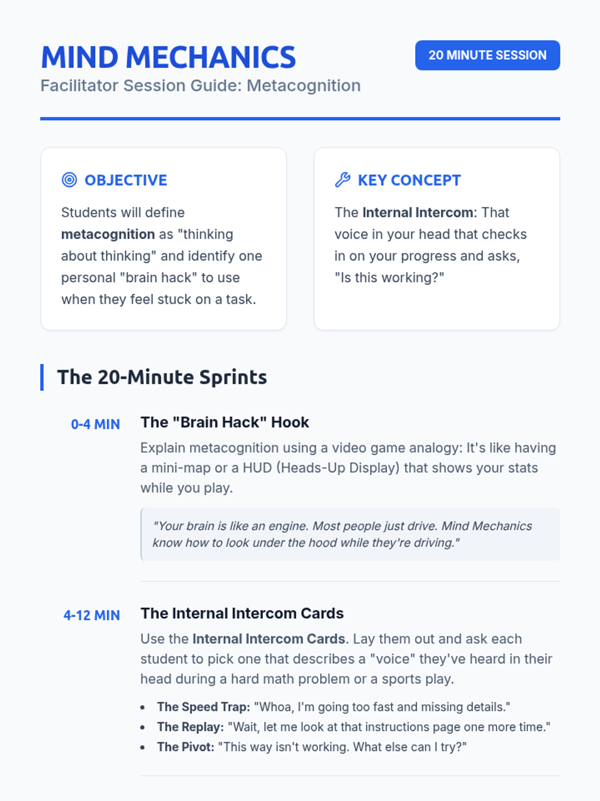 A high-energy, 20-minute session designed for 6th-grade students to explore metacognition—the ability to think about their own thinking—through engaging conversation and visual prompts.