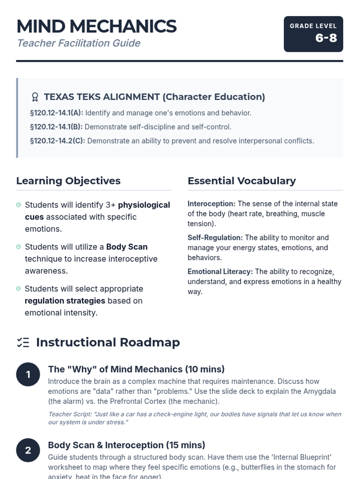 A middle school counseling lesson focused on emotional self-regulation, identifying physiological triggers (interoception), and applying clinical coping strategies. Aligned with Texas TEKS for Character Education, this lesson uses a 'Mind Mechanics' theme to depersonalize and de-stigmatize emotional management.