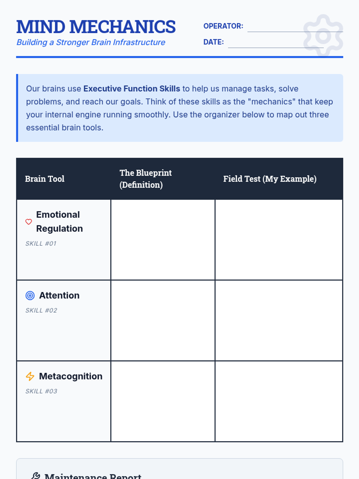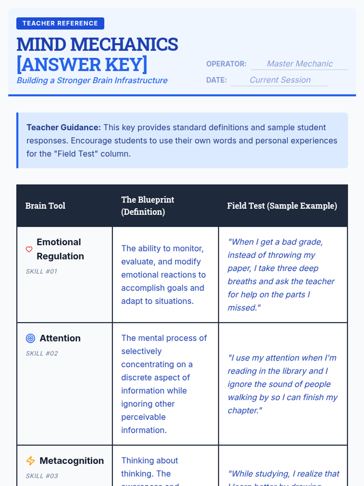 A lesson exploring three critical executive function skills: emotional regulation, attention, and metacognition. Students will define each skill and identify real-world applications.