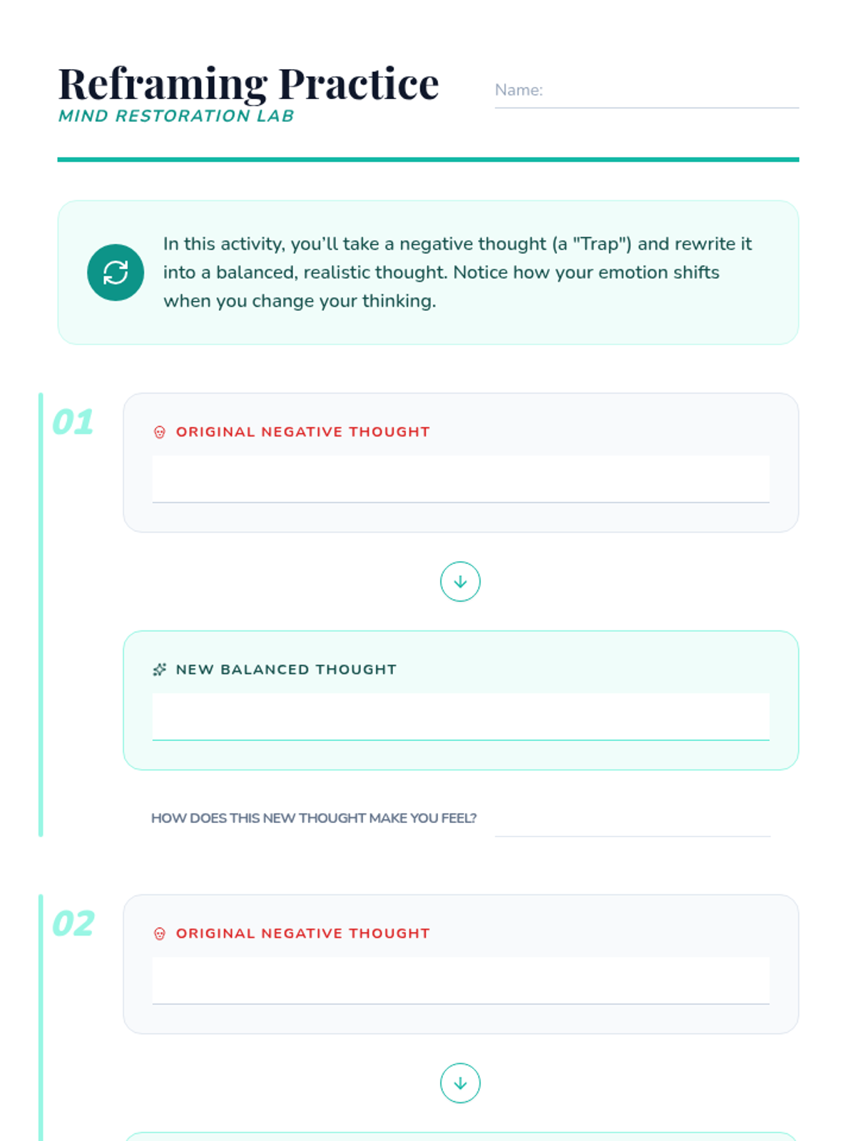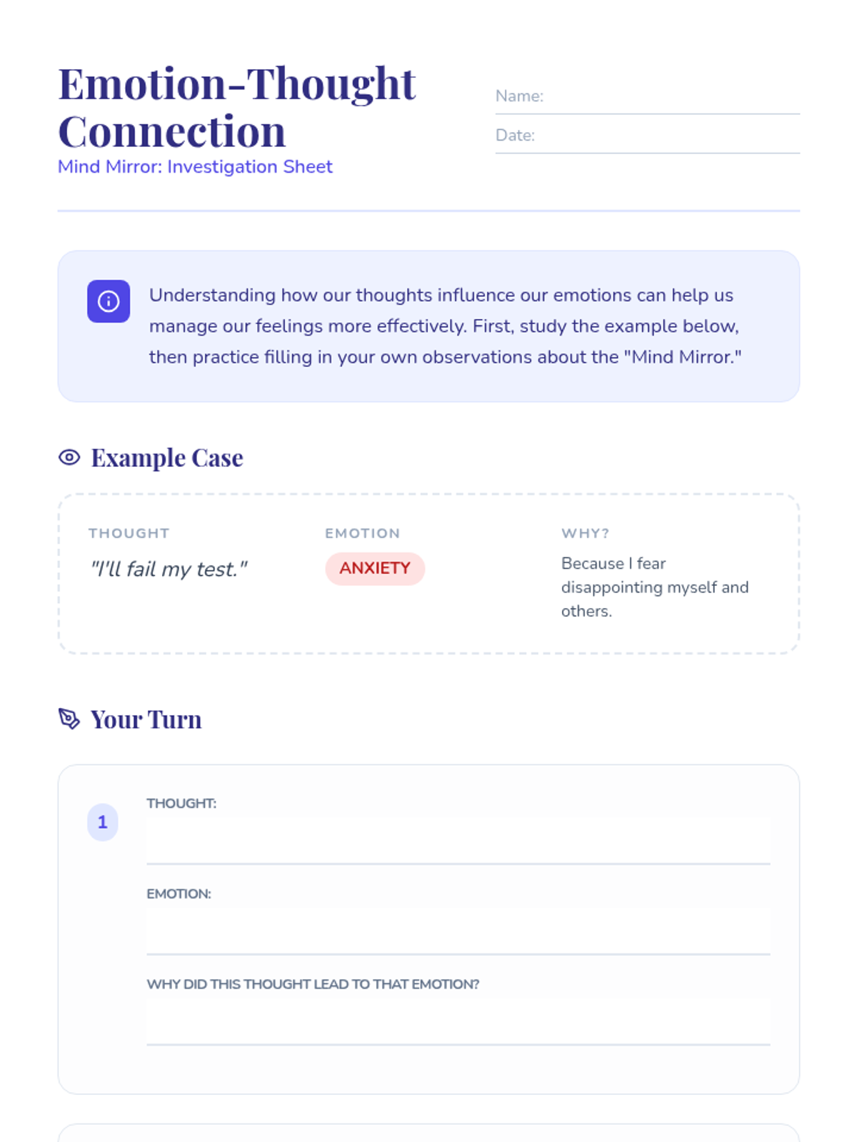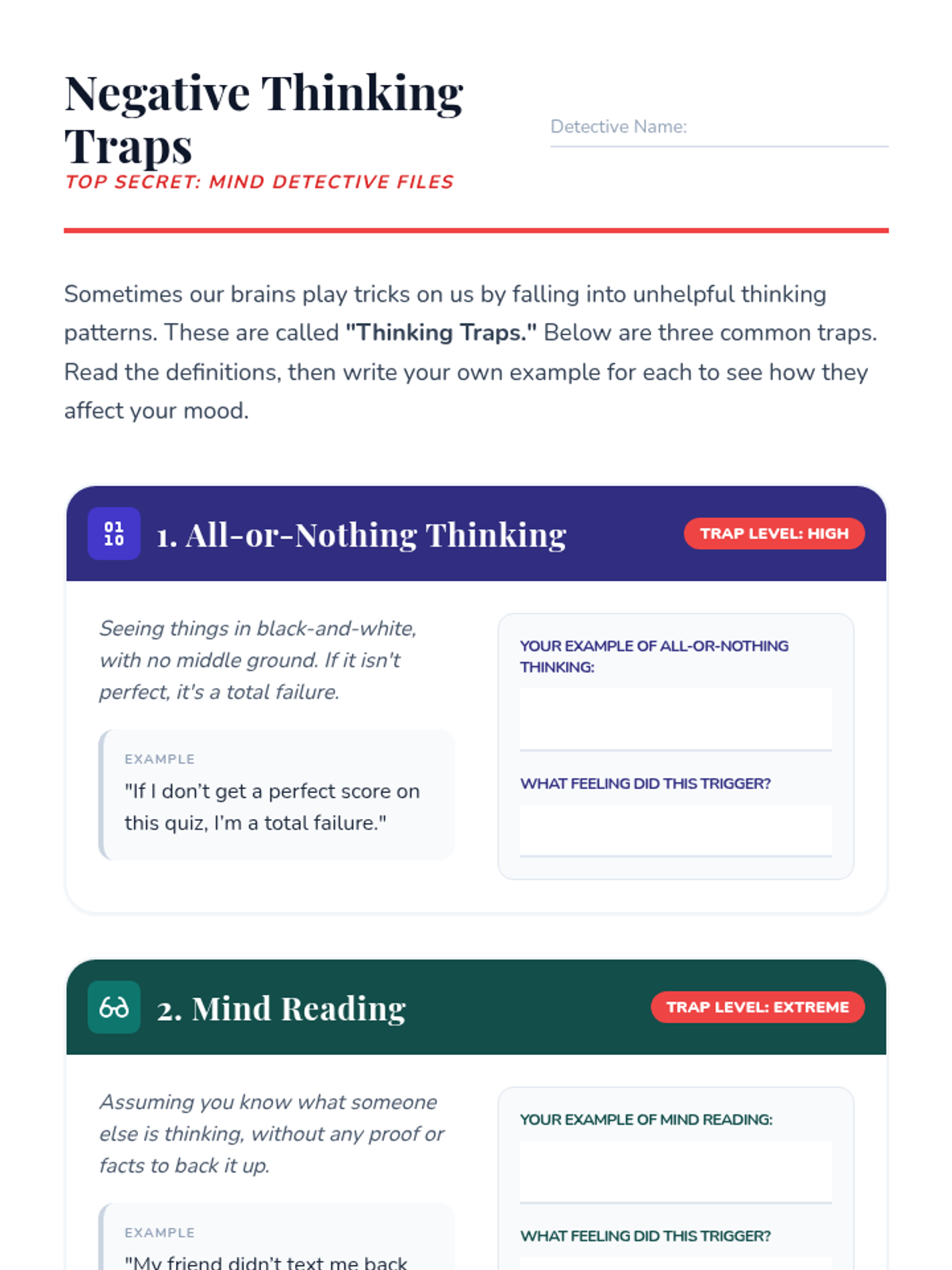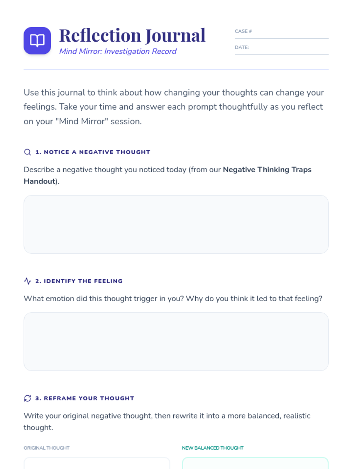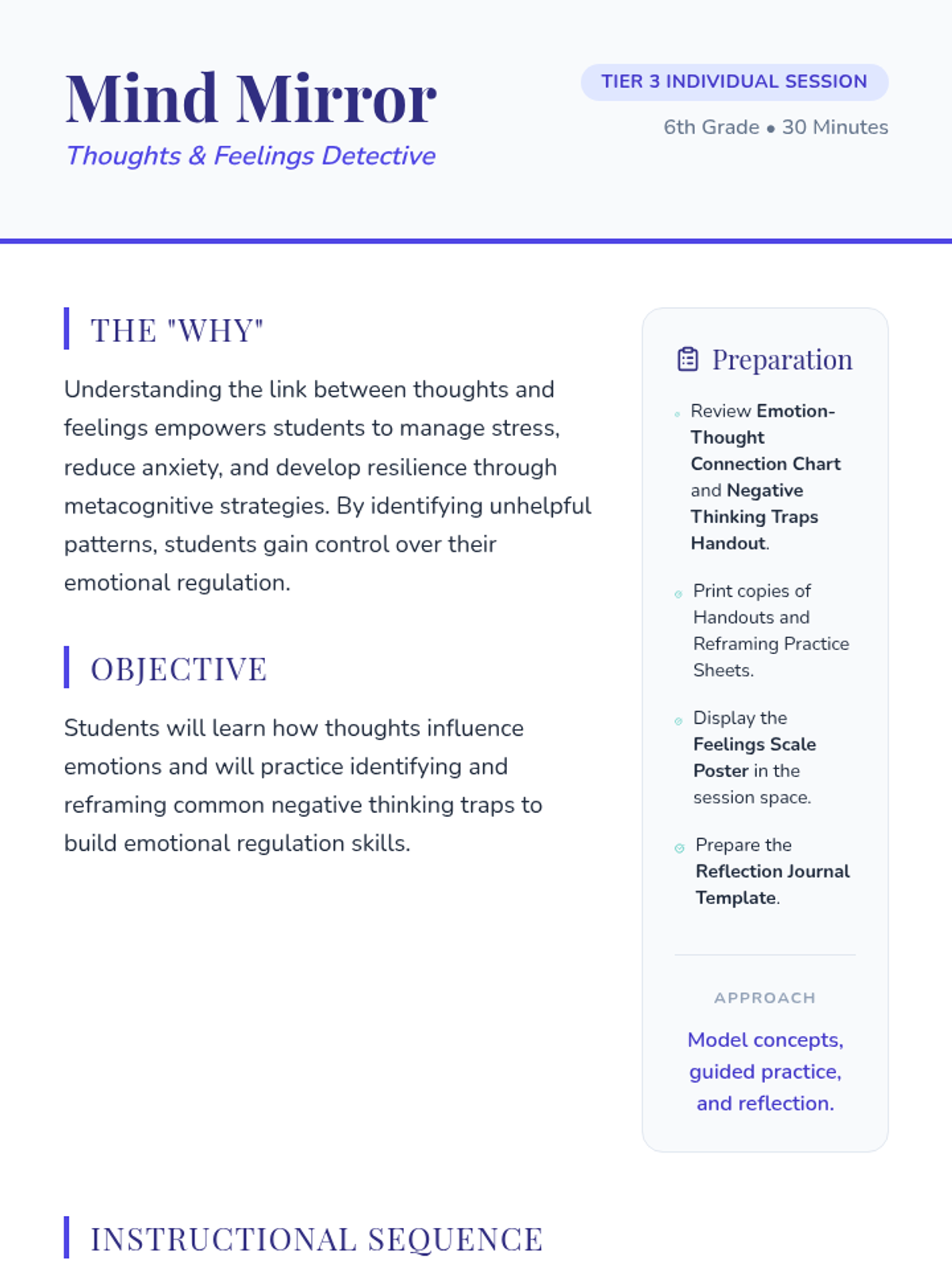 An individual Tier 3 lesson for 6th graders to explore the connection between thoughts and emotions, identify cognitive distortions, and practice reframing techniques.