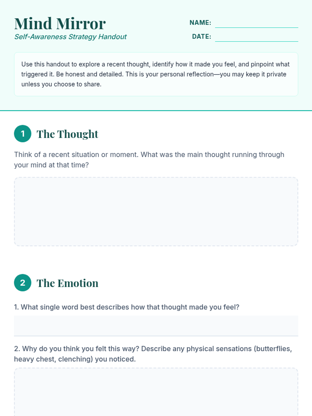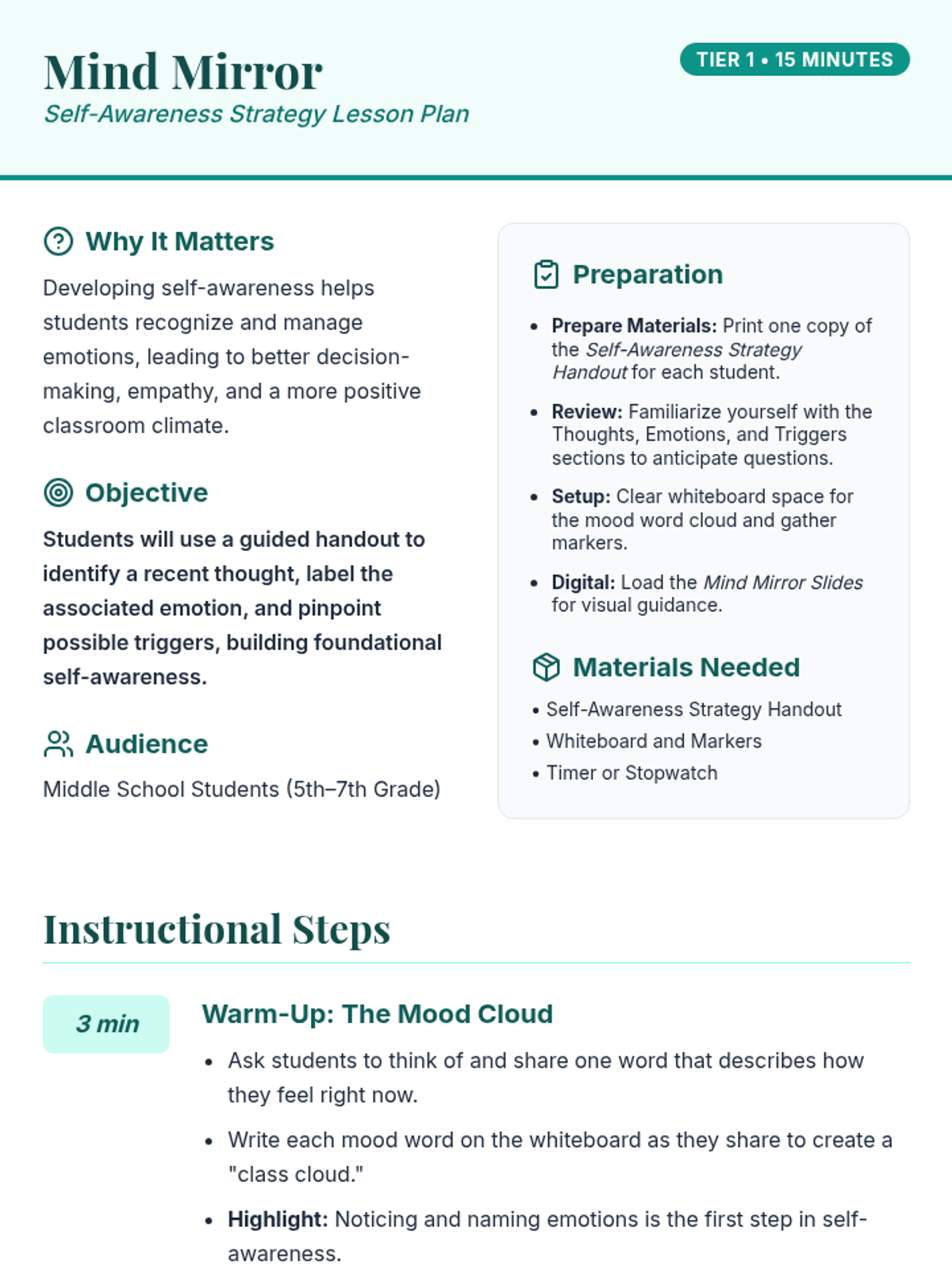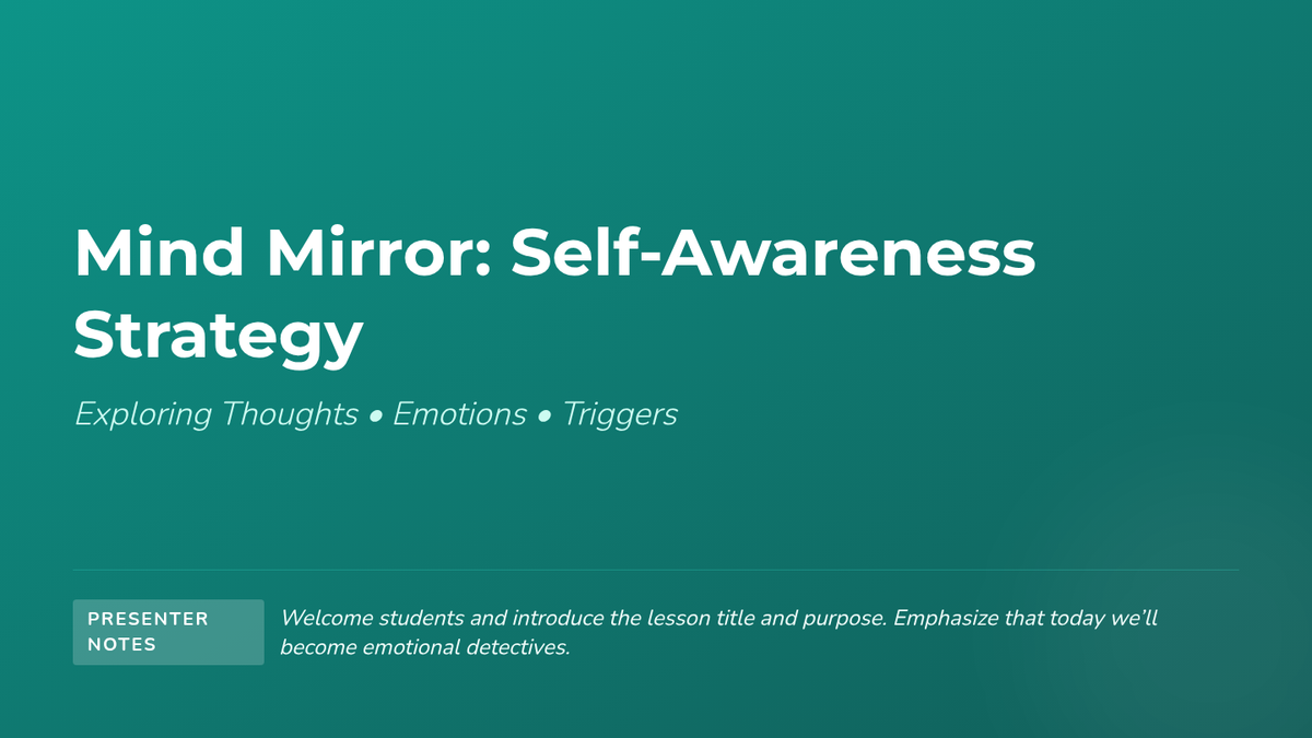 A 15-minute self-awareness lesson for 5th-7th graders that helps students identify thoughts, emotions, and triggers to boost emotional literacy and self-understanding.