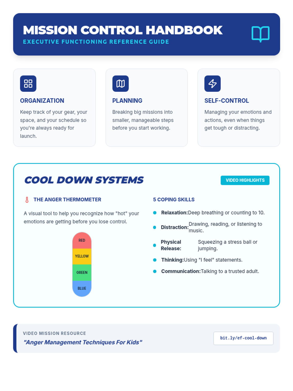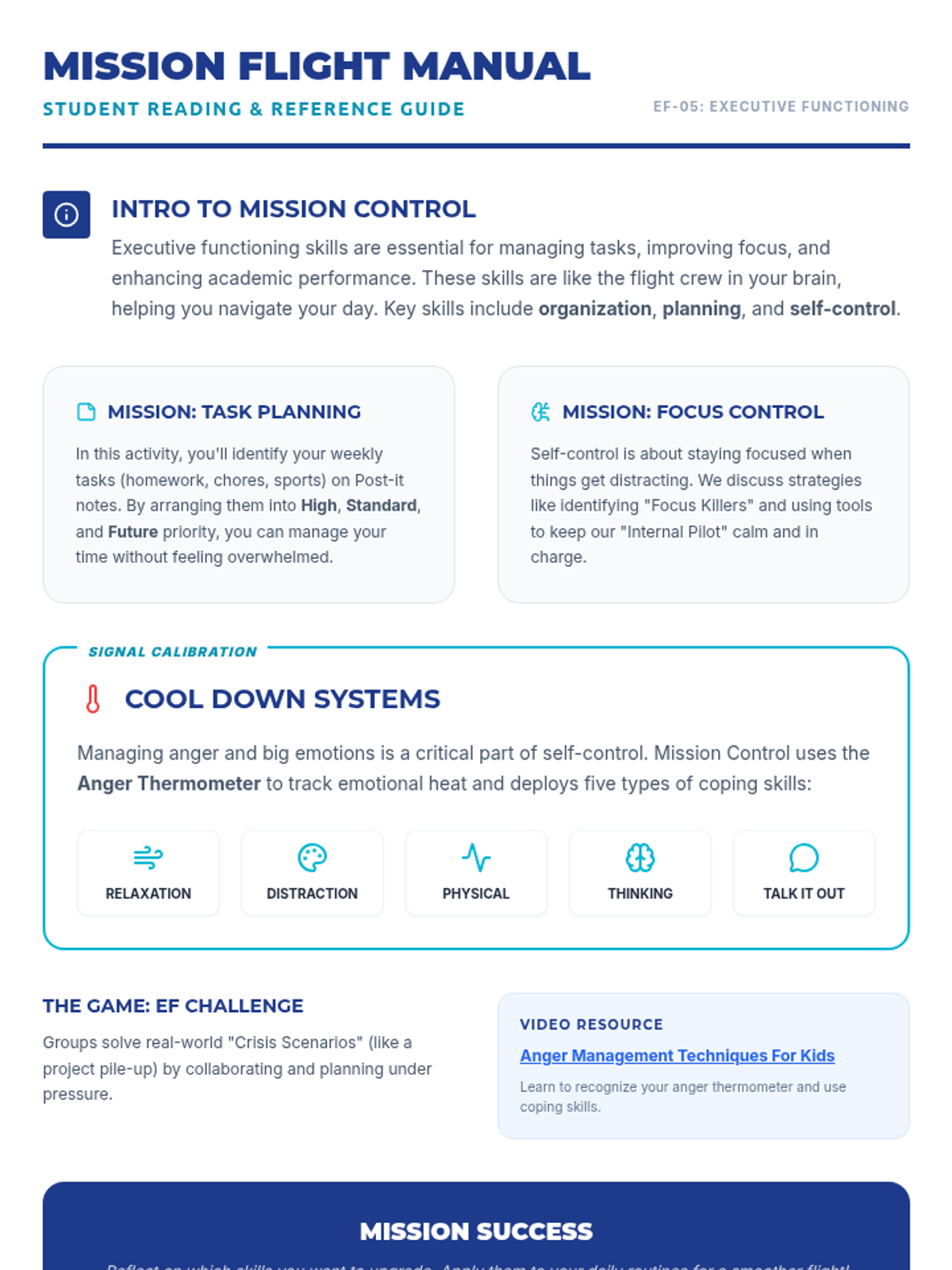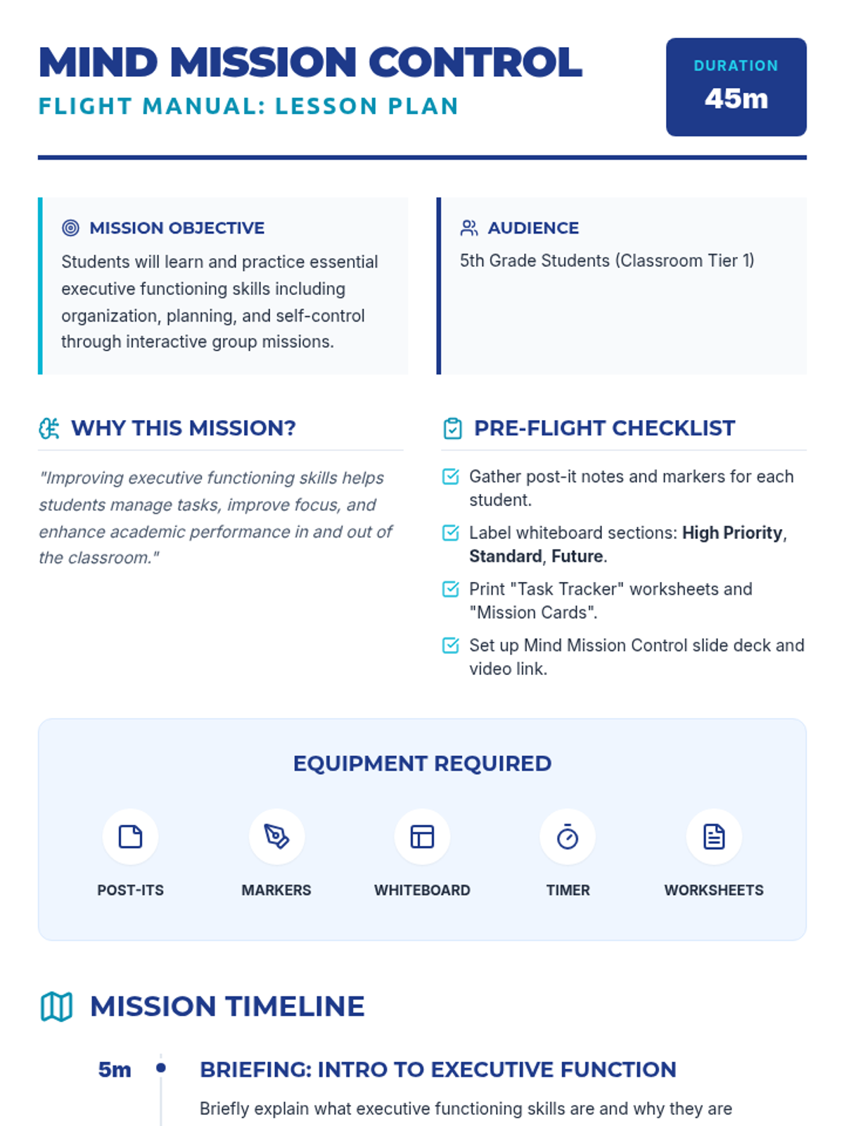 A 45-minute interactive lesson designed to teach 5th-grade students essential executive functioning skills like planning, organization, and self-control through a 'Mind Mission Control' theme.