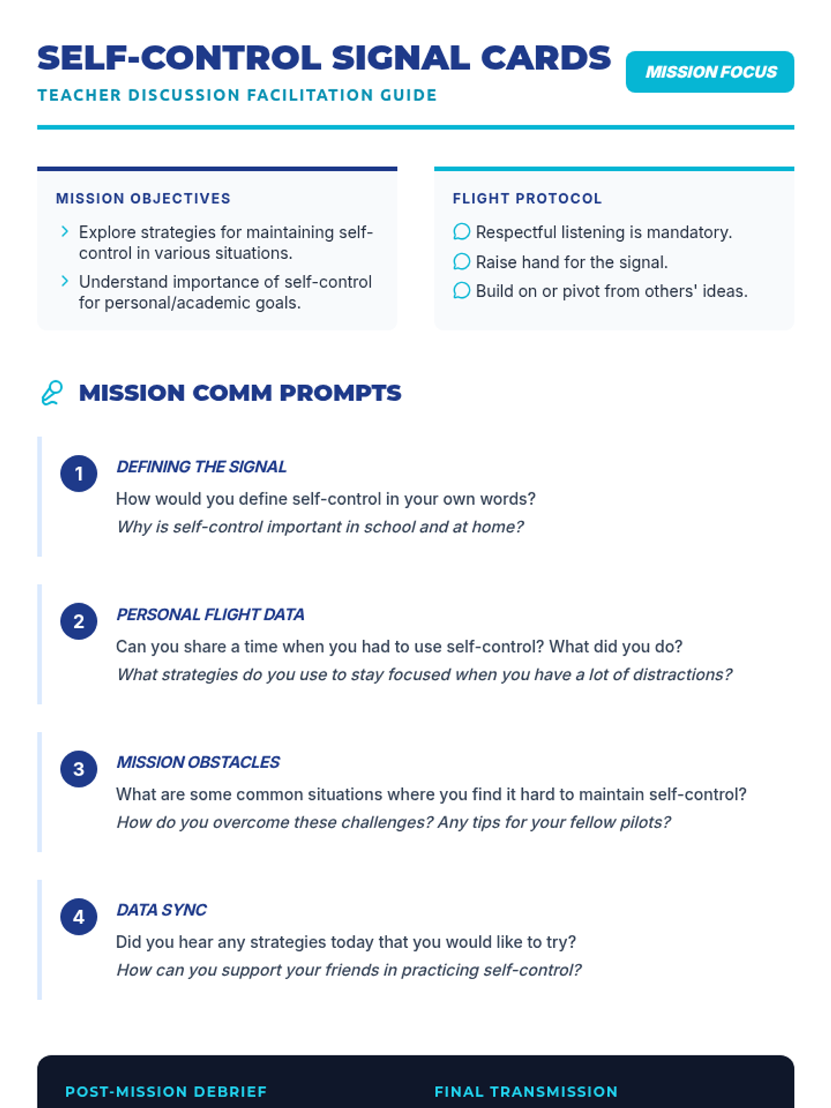This lesson introduces self-management through an aviation metaphor, teaching students to identify emotional 'turbulence' and use specific 'cockpit controls' to stay on course. Students will learn strategies for impulse control and emotional regulation.