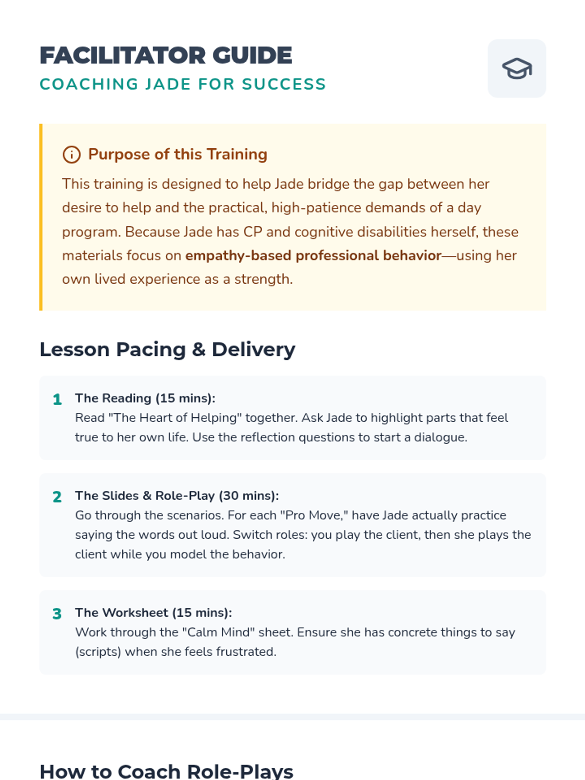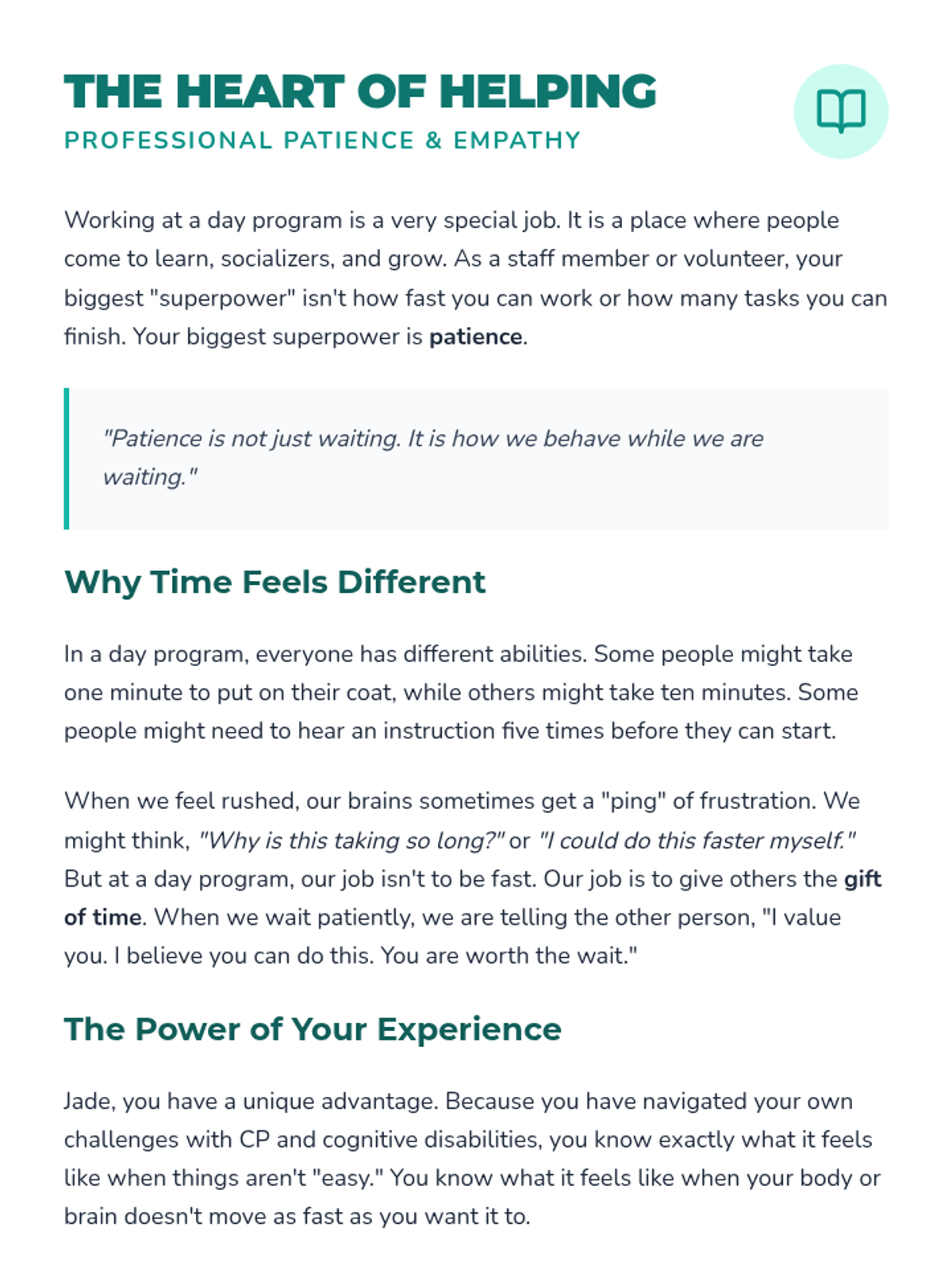 This lesson provides Jade with practical tools, stories, and strategies to develop professional patience while working at a day program for people with disabilities, focusing on empathy and self-regulation.
