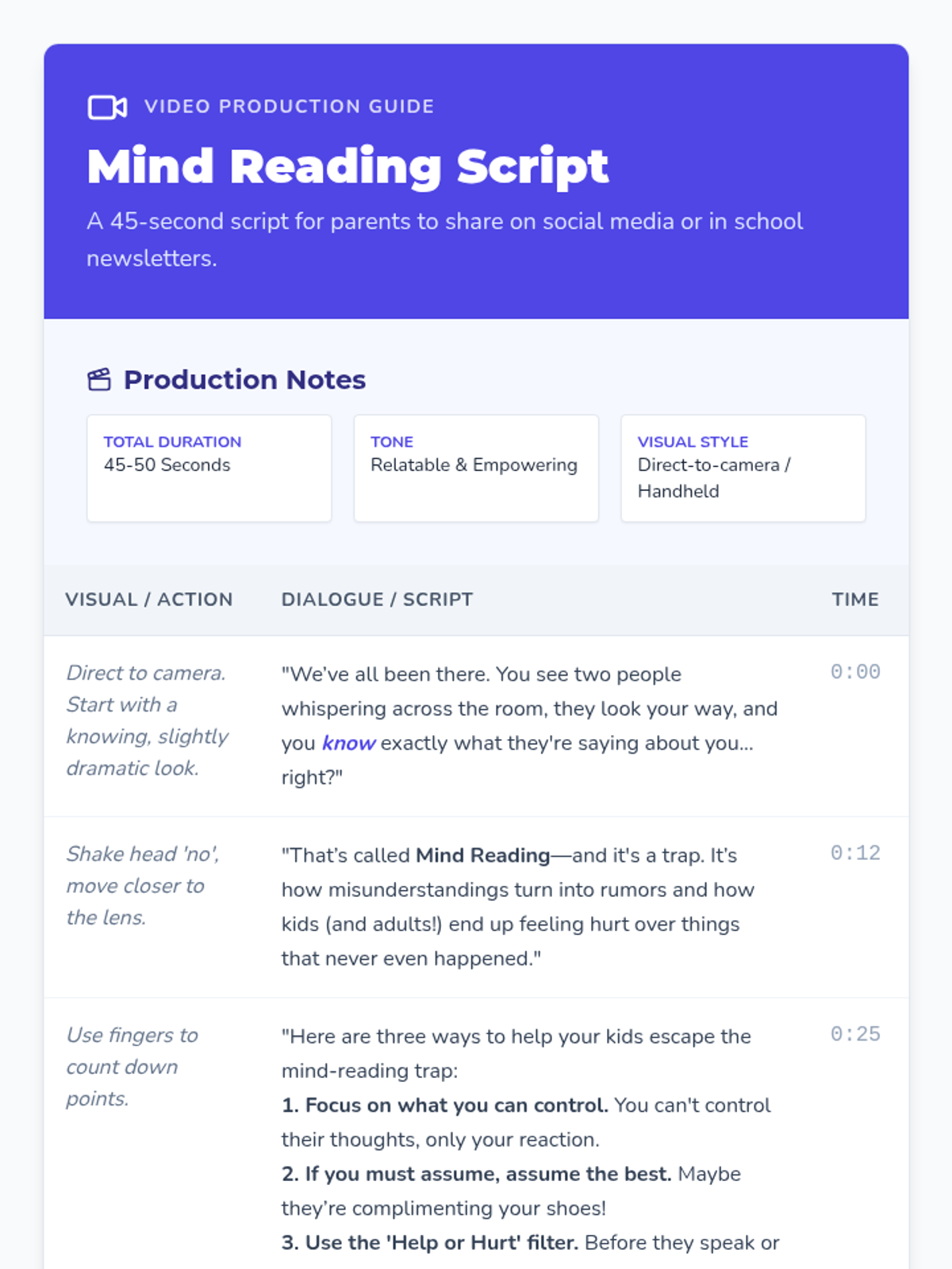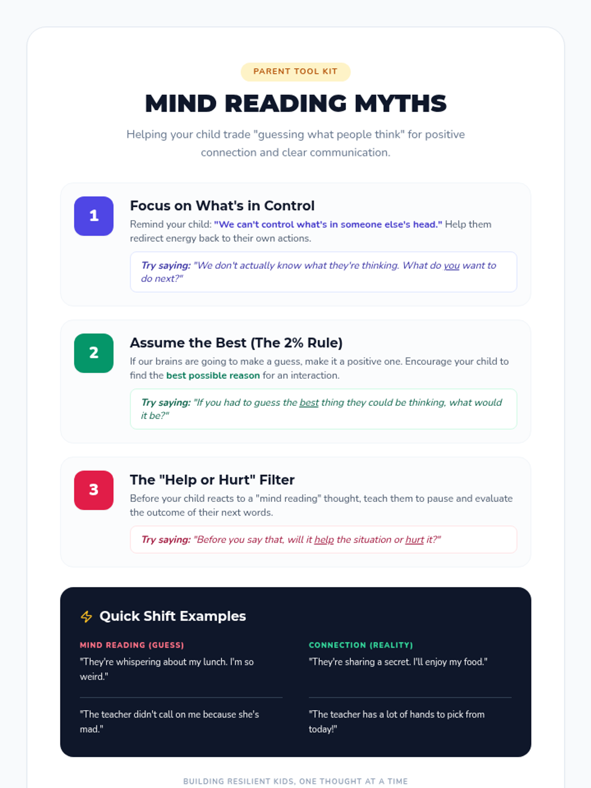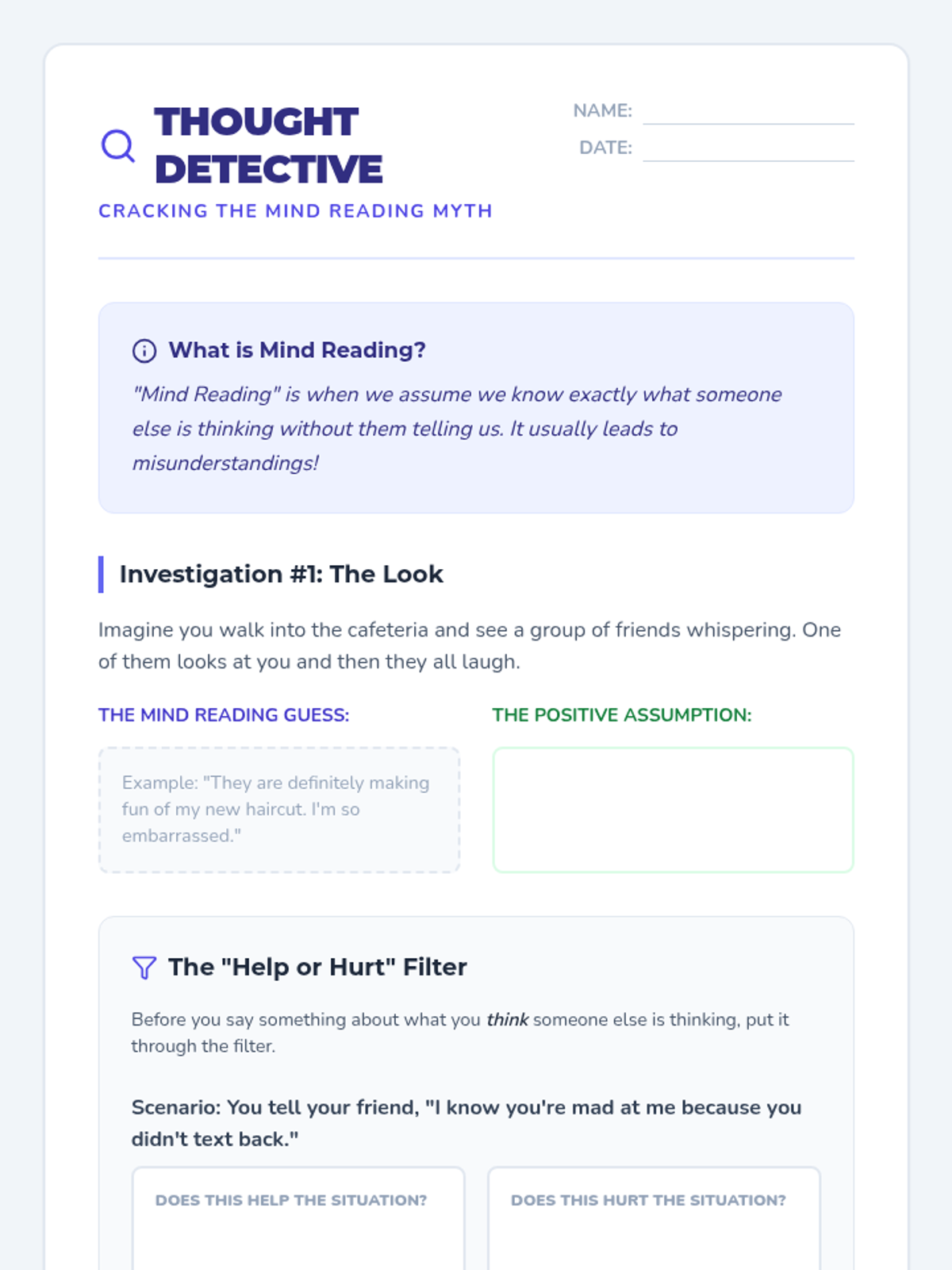 A lesson designed to help parents and children identify and combat the 'mind reading' cognitive distortion, focusing on positive assumptions and helpful communication.