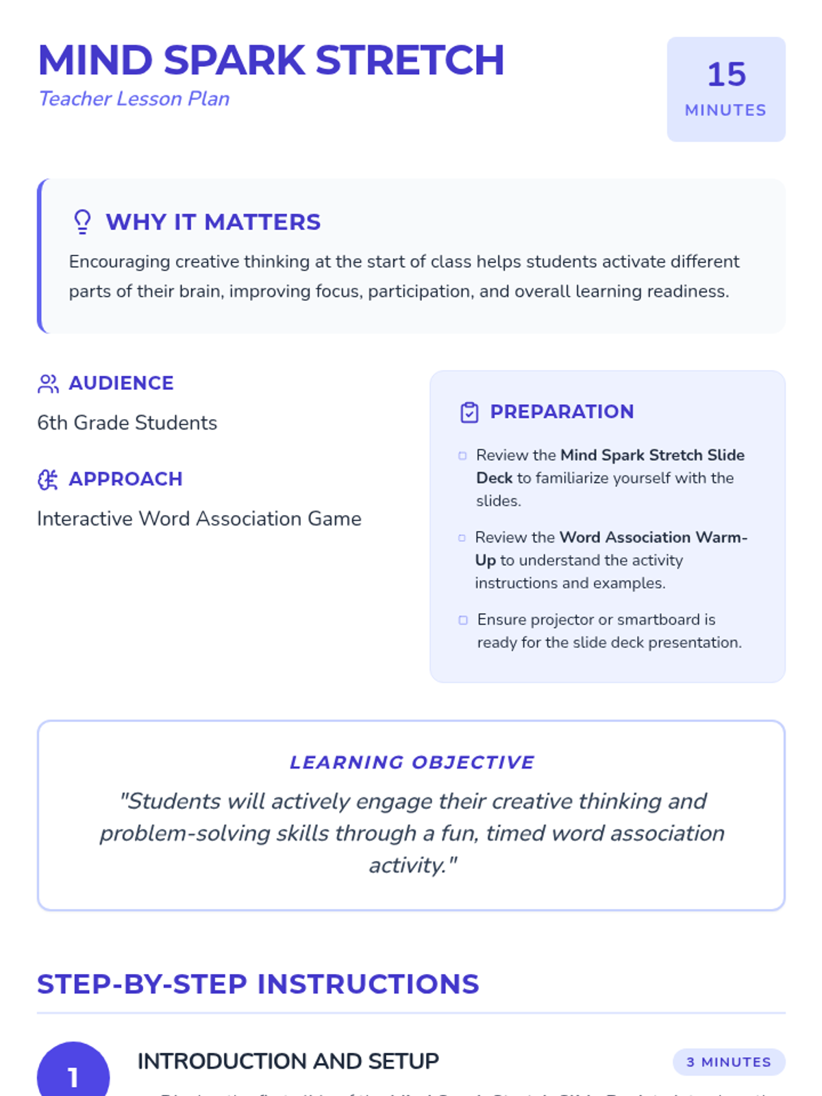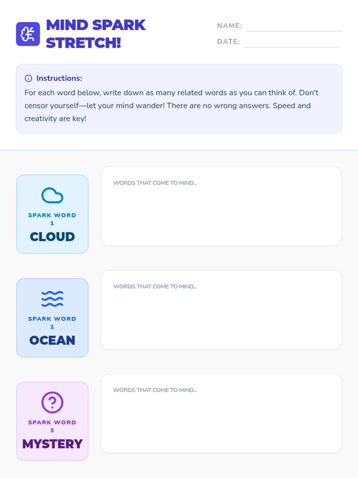 A 15-minute warm-up activity for 6th-graders designed to kickstart creative thinking through rapid word association and reflection.