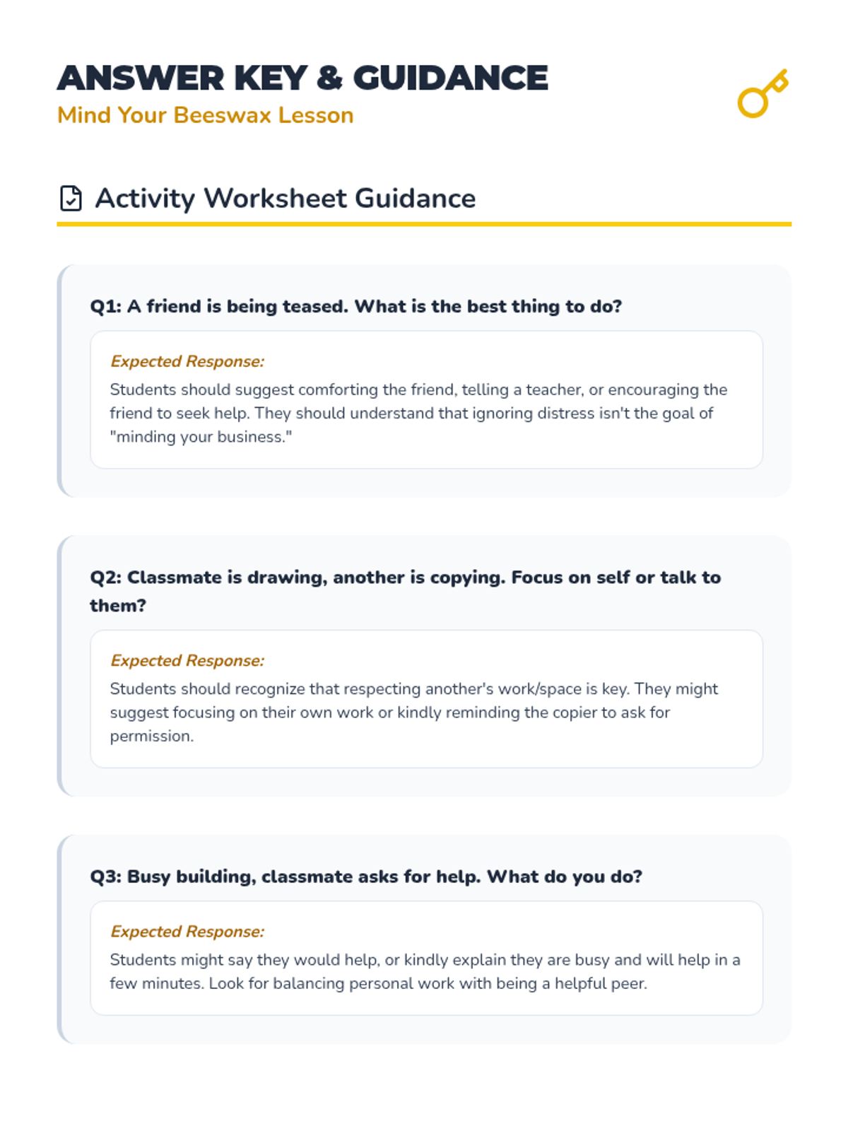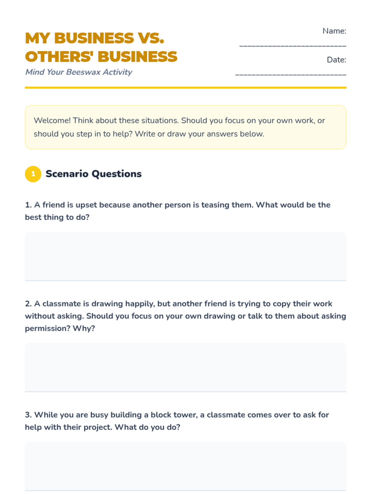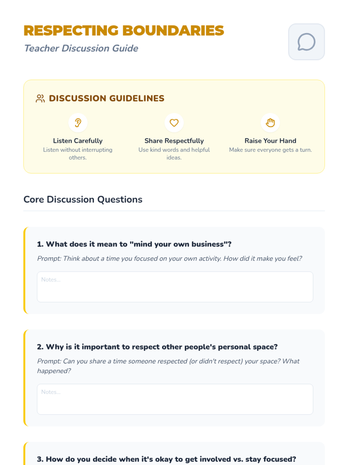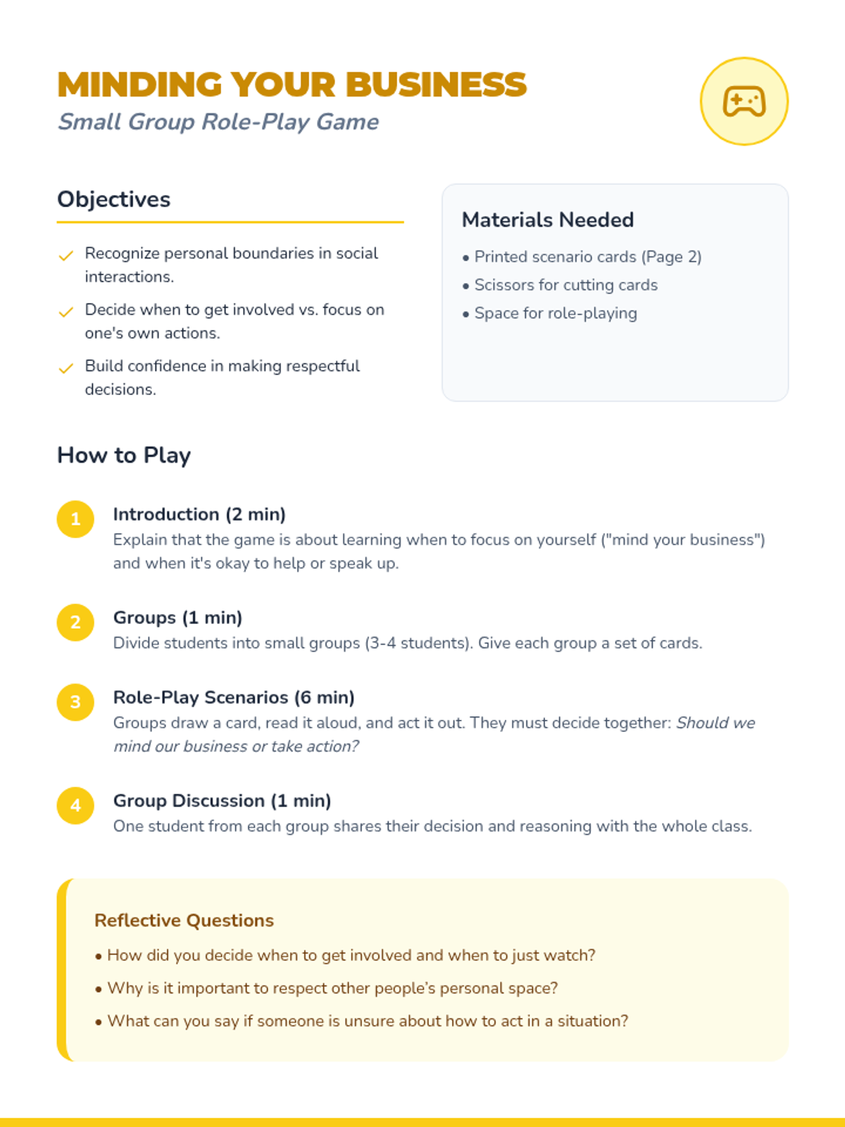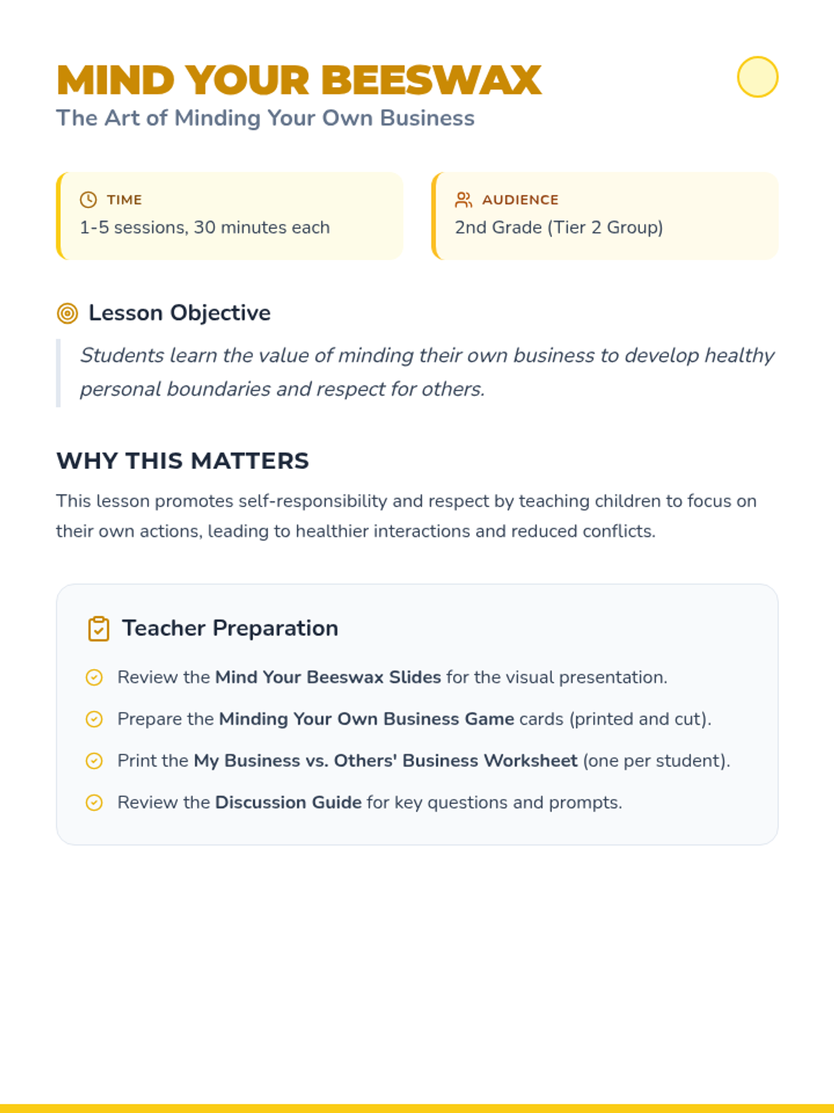 A social skills lesson for 2nd graders focusing on understanding personal boundaries and learning when to focus on one's own tasks versus when to intervene in others' business.