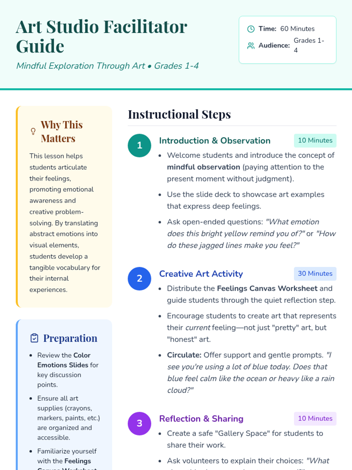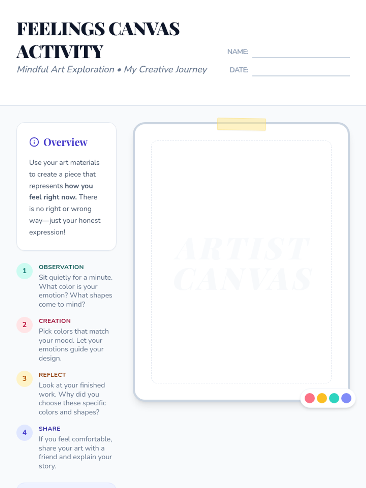 A lesson for grades 1-4 that uses mindful observation and artistic expression to help students explore and articulate their emotions through colors and shapes.