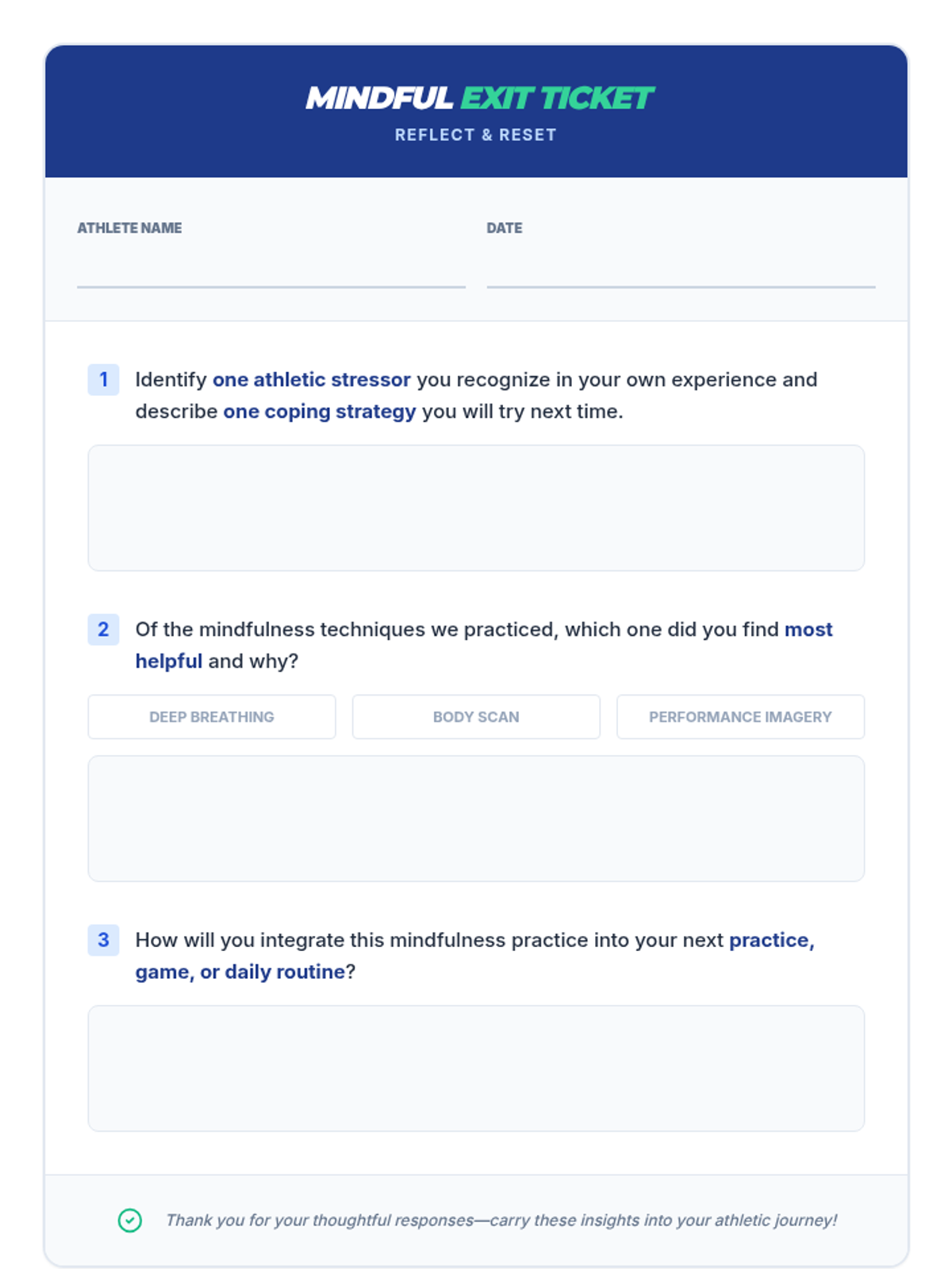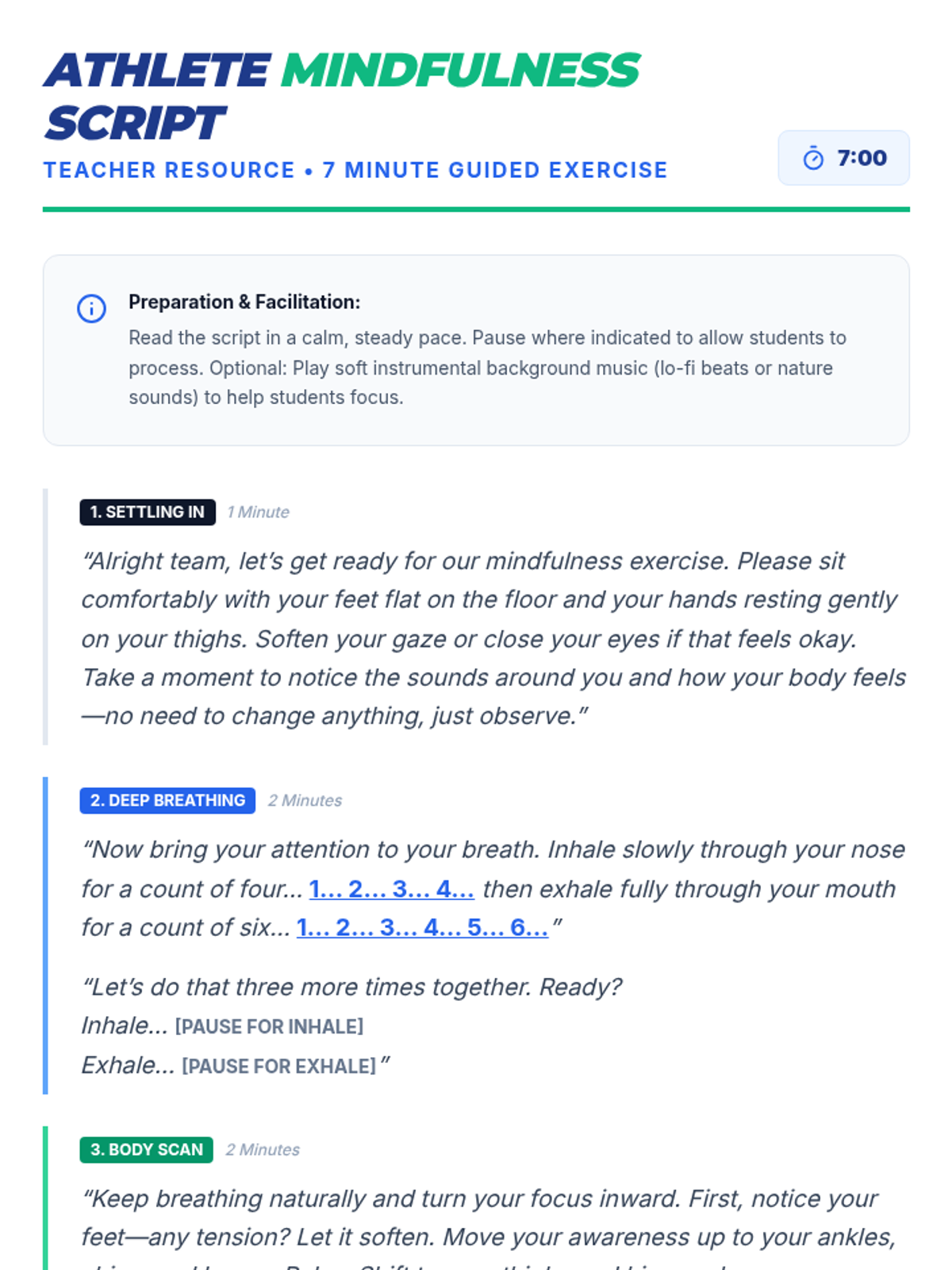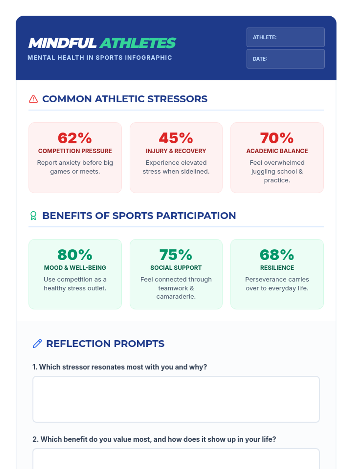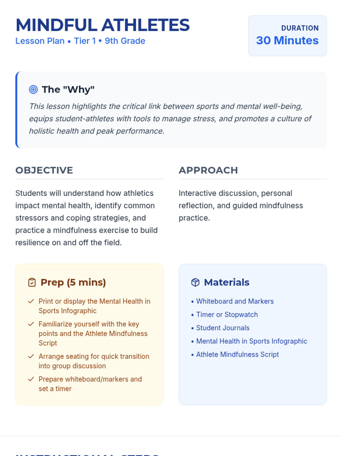 A 30-minute session for 9th-grade student-athletes to explore the connection between sports and mental health, learn stress-management techniques, and practice mindfulness for peak performance and well-being.