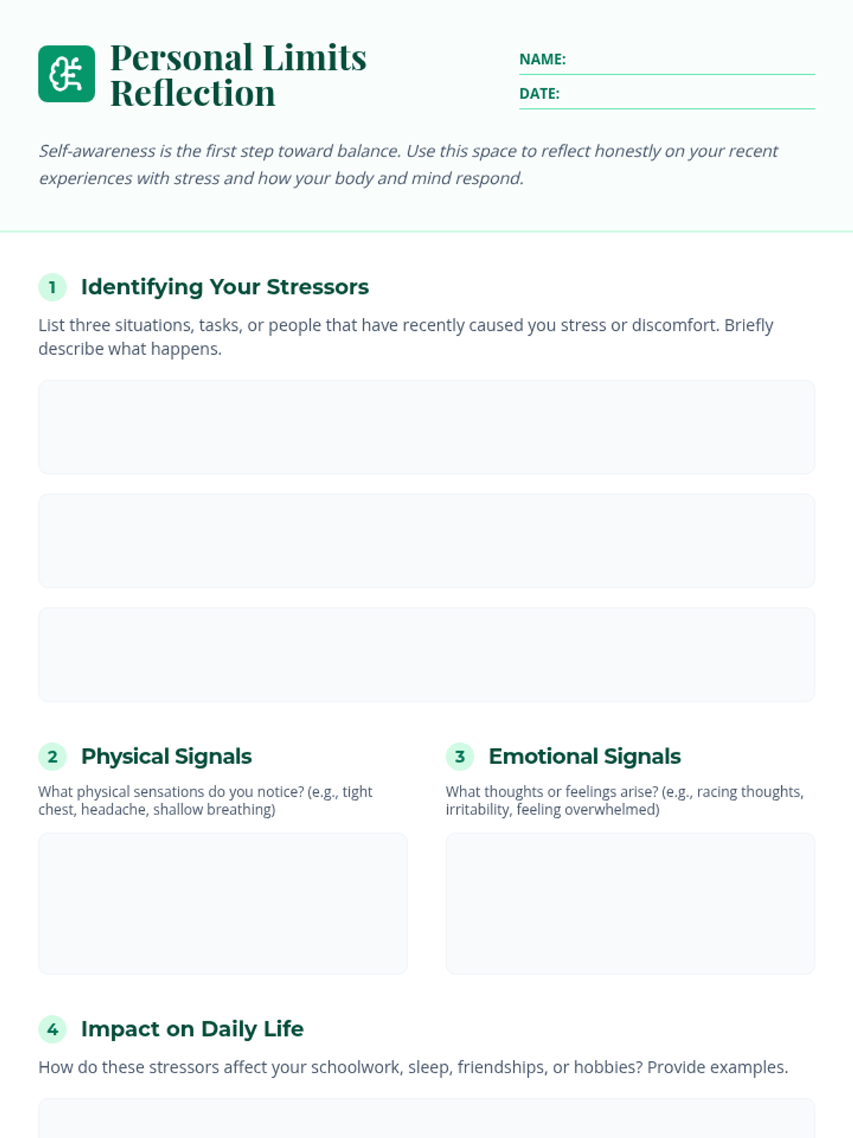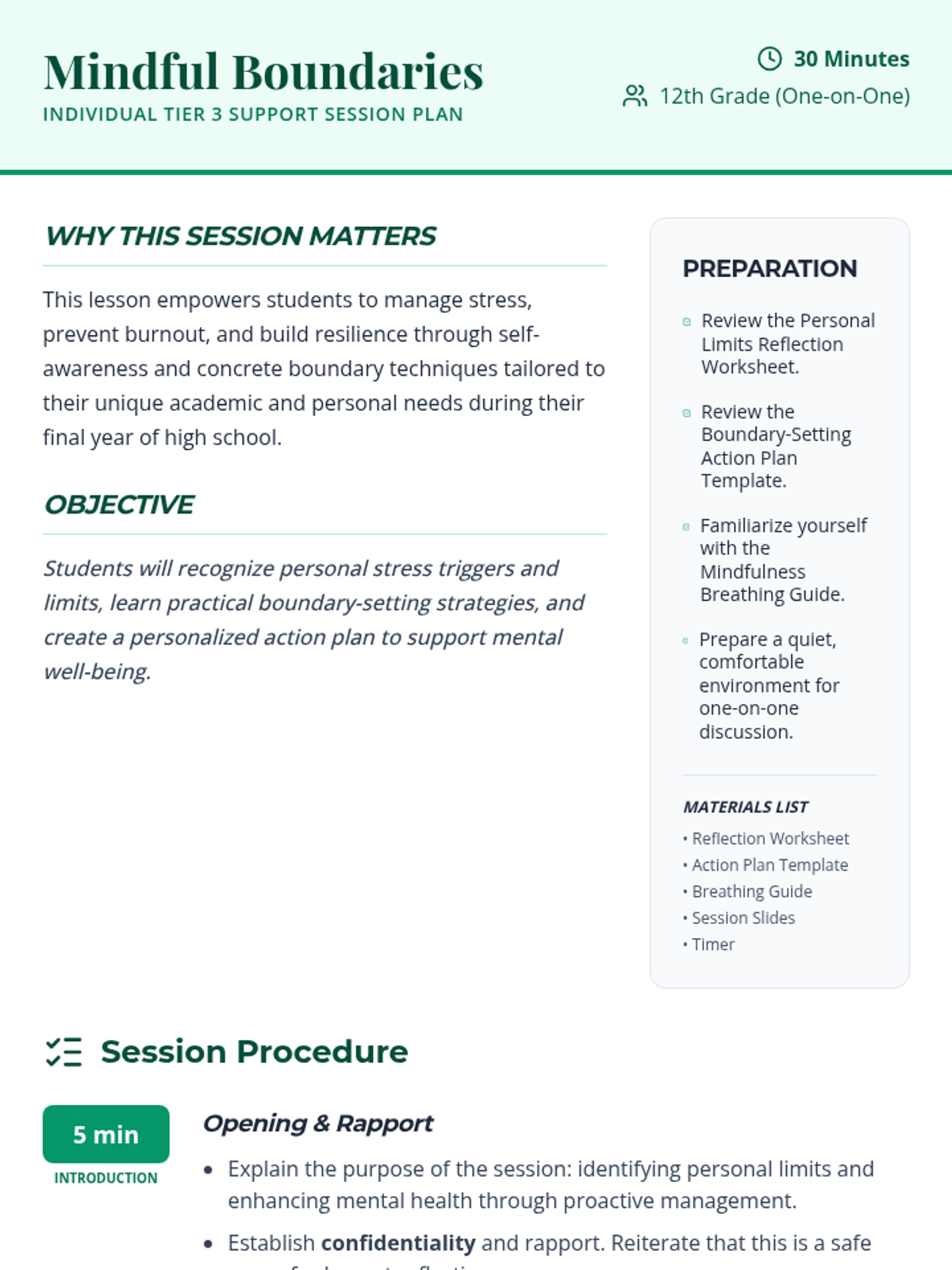 A 30-minute individual Tier 3 support session for 12th graders focused on recognizing personal stressors, setting healthy boundaries, and practicing mindfulness to prevent burnout.