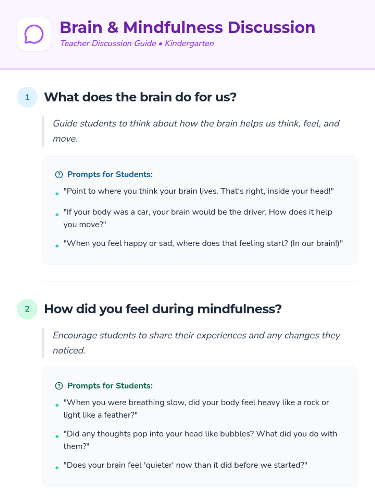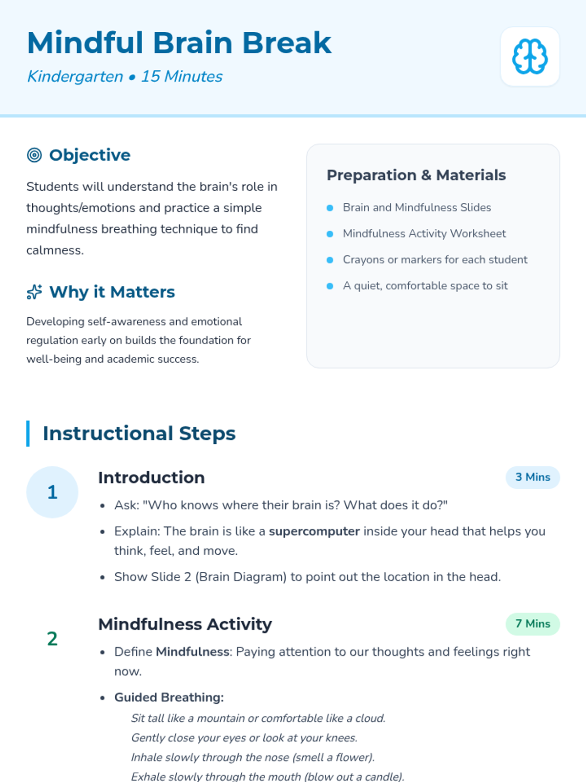 This lesson introduces kindergarten students to the brain's role in thoughts and emotions and practices mindfulness for focus and calmness. Students engage in a deep breathing exercise and reflect on their feelings through discussion and drawing.