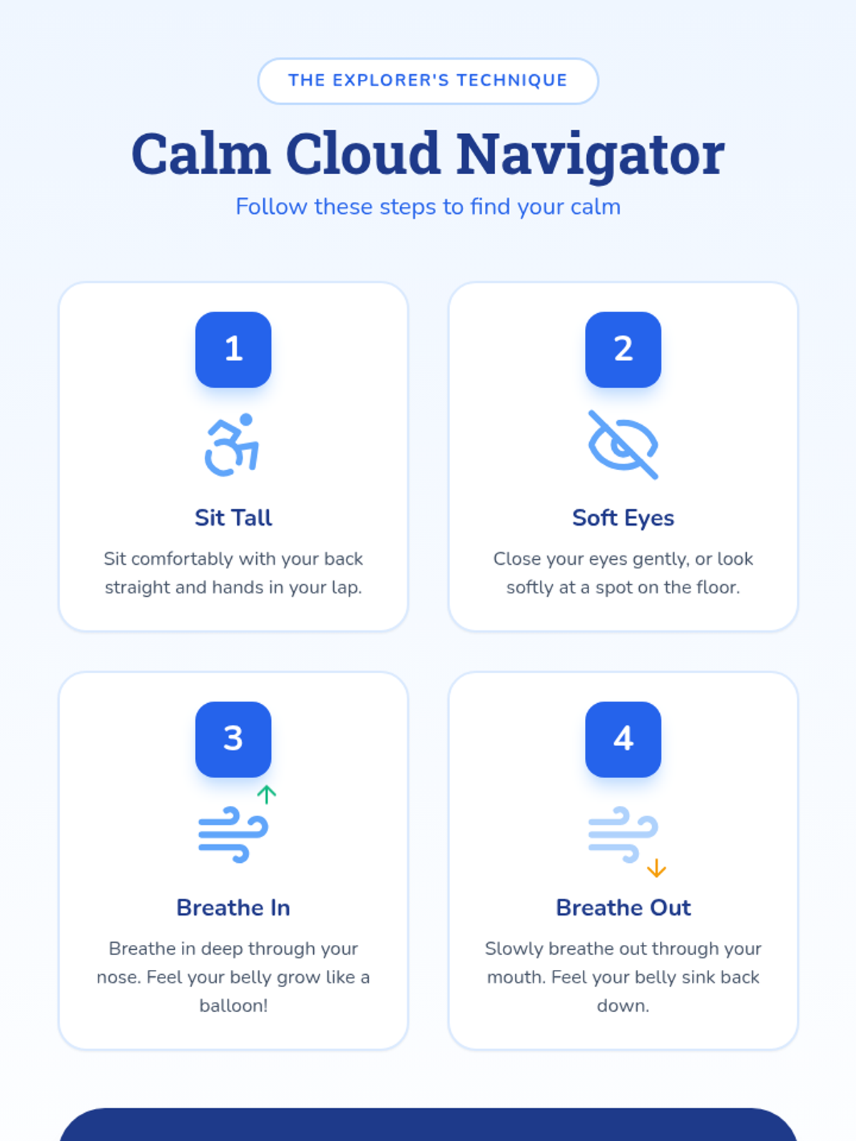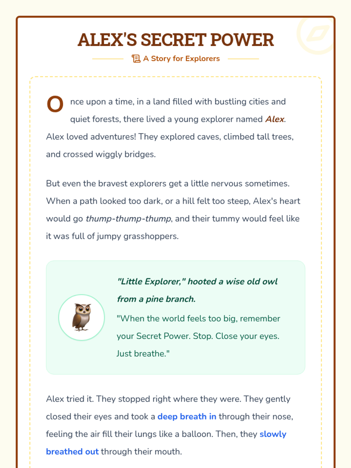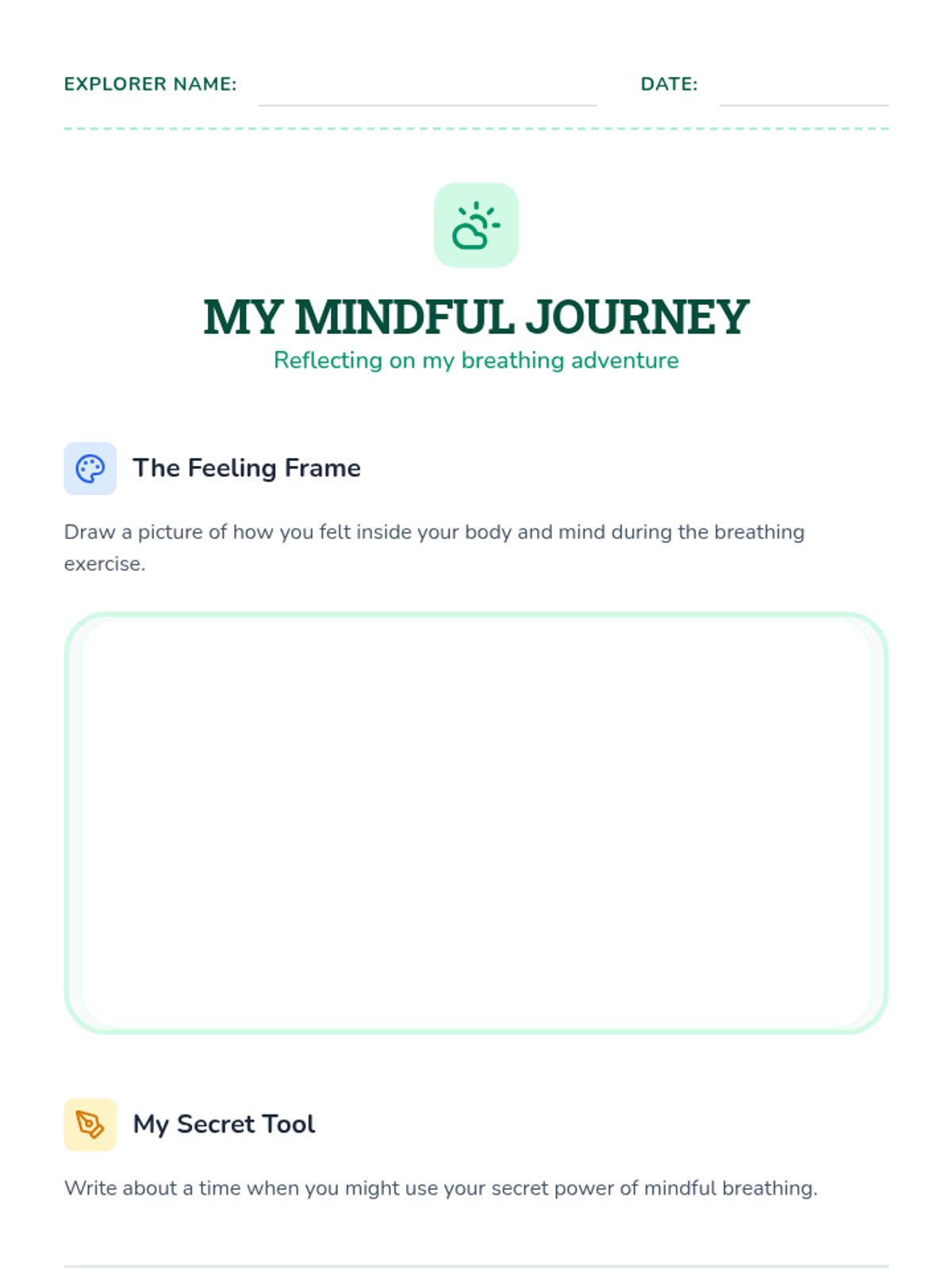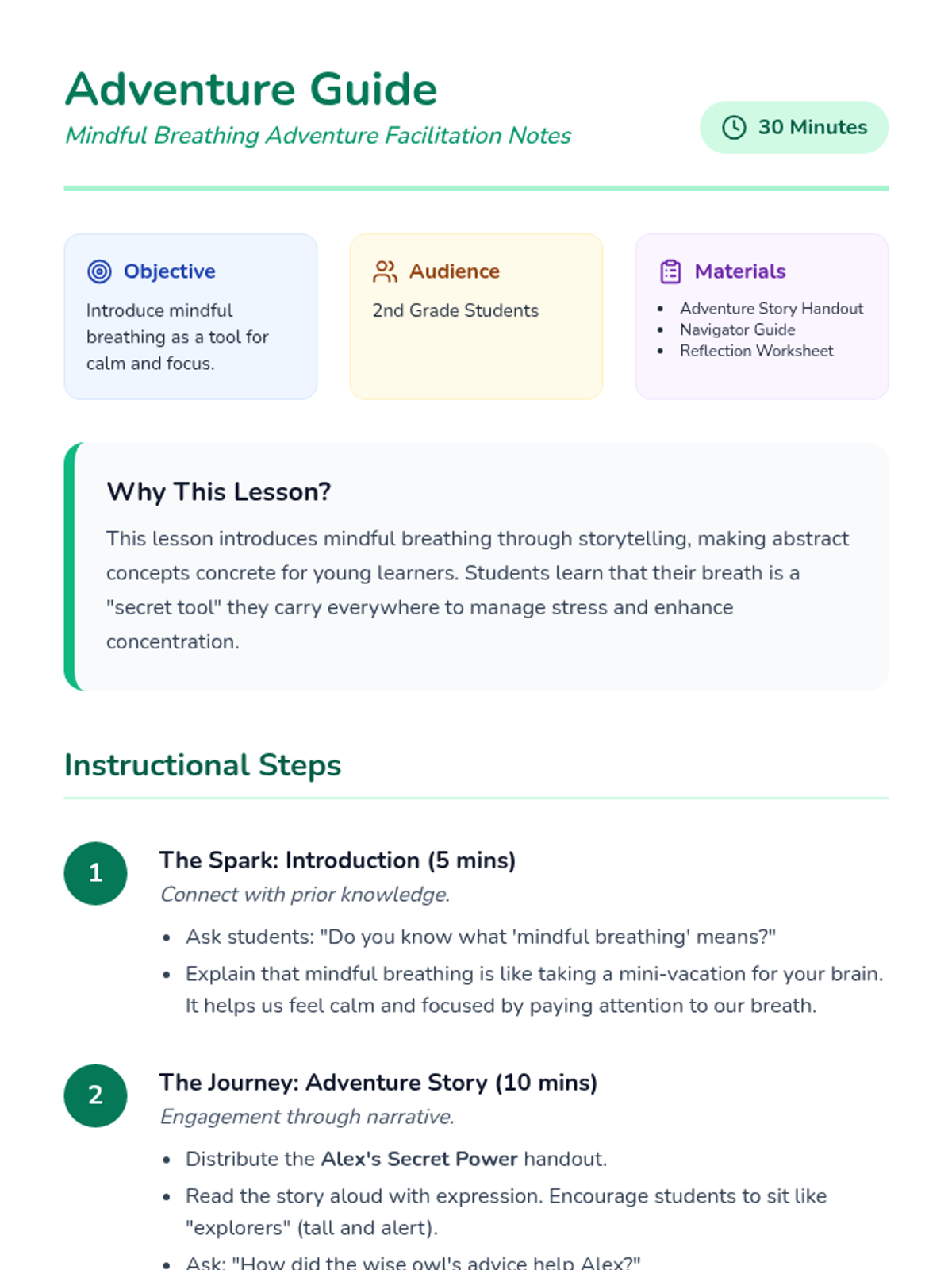 An interactive 30-minute introduction to mindful breathing for 2nd graders, featuring an adventure story about an explorer named Alex. Students learn to use their breath as a tool for calm and focus through guided practice and creative reflection.