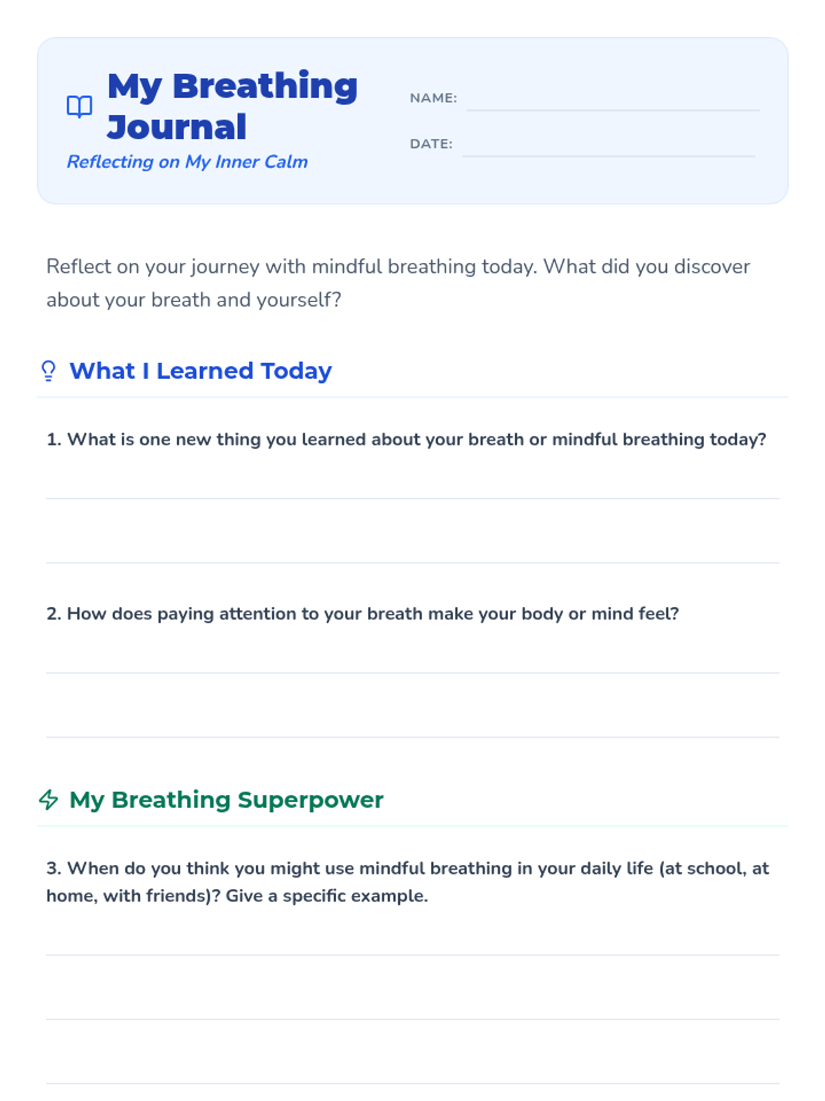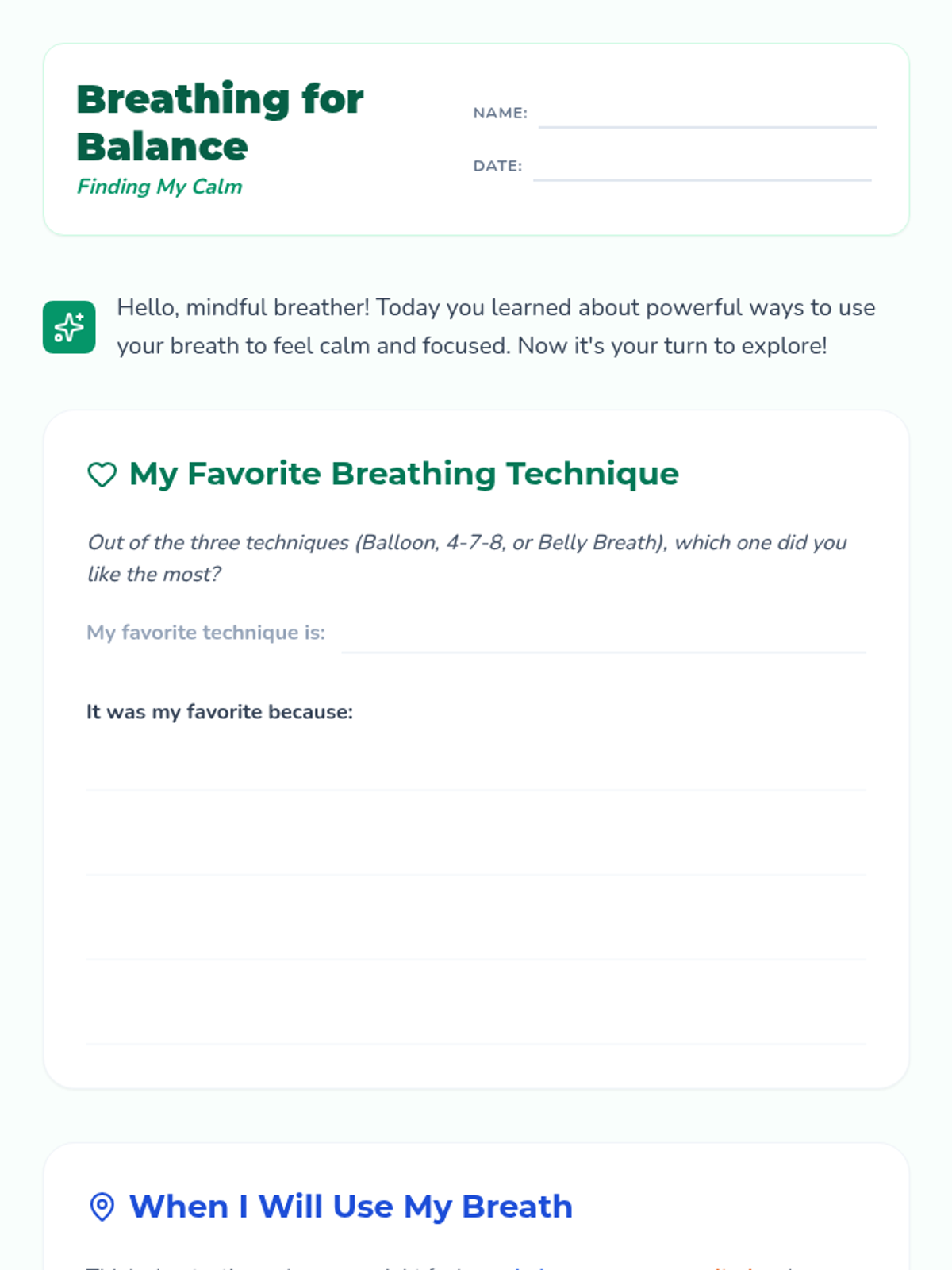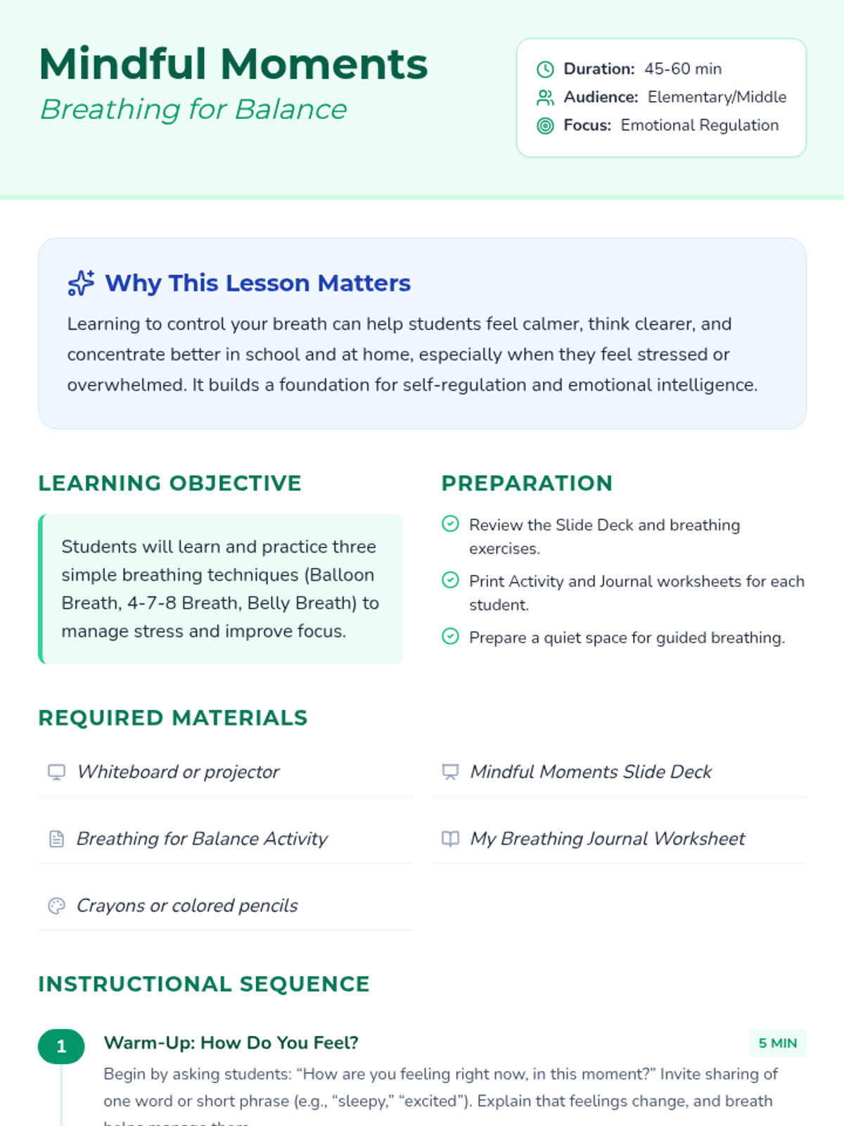 A 45-60 minute lesson for elementary and middle school students to learn and practice mindful breathing techniques like Balloon Breath and 4-7-8 Breath to improve focus and manage stress.